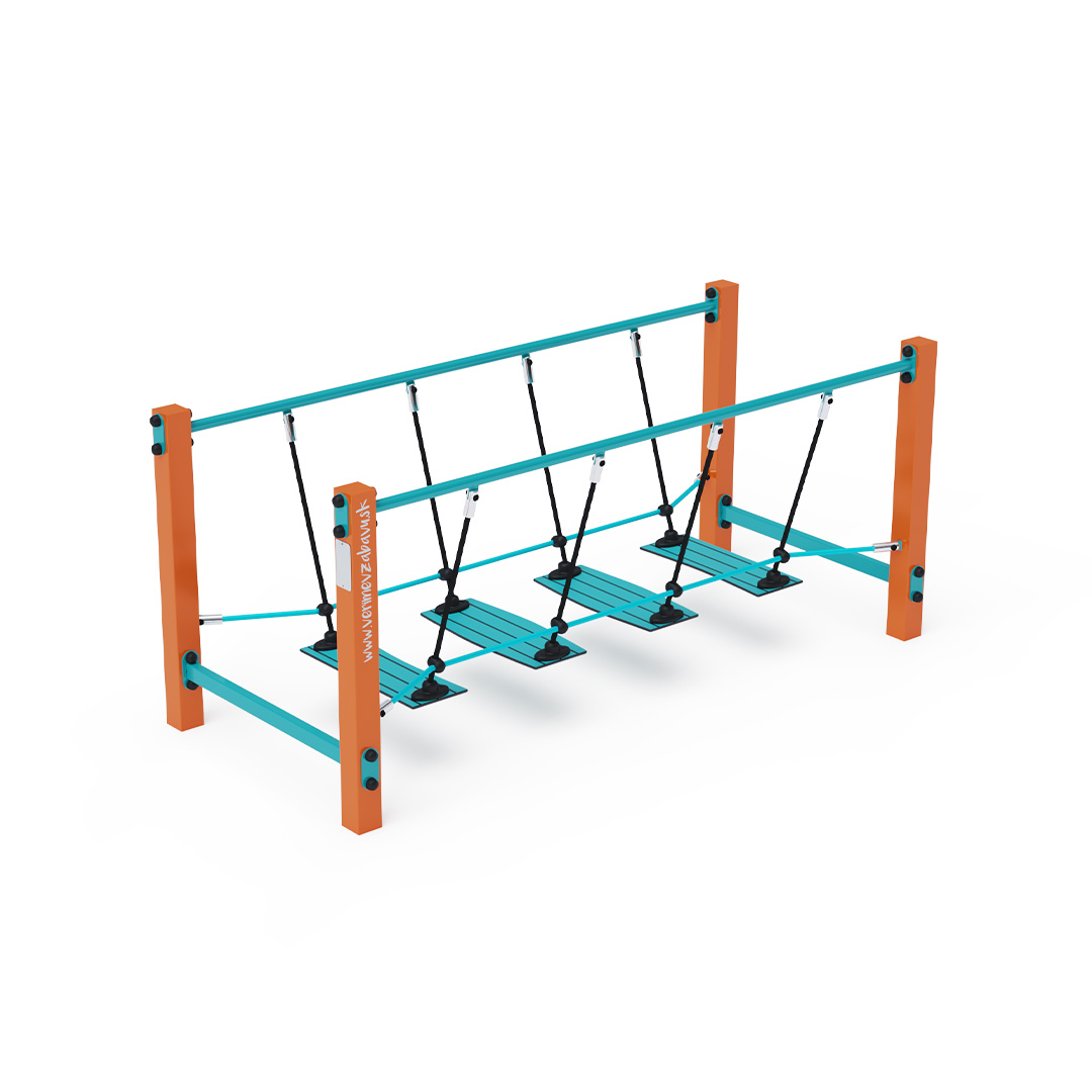 Bezúdržbový balanční mostík s HPL protiskluzovými nášlapy zavěšenými na polyesterových lanech je herním prvkem, díky kterému děti trénují svou koordinaci, stabilitu a rovnováhu. Vyroben je ze žárově zinkované oceli, která je upravena práškovou vypalovanou barvou. Lana jsou vyrobena z polyesterových vláken, která jsou vinutá kolem středu. Tato konstrukce lana zvyšuje jeho pevnost a odolnost proti mechanickému namáhání. Polyester má mnoho kladných vlastností – je odolný vůči mikroorganismům, povětrnostním vlivům, rychle schne po dešti, je stálobarevný a vyznačuje se vysokou pevností. Spojovací materiály jsou nerezové. Jako dopadovou plochu lze použít travnatý povrch, doporučujeme však zatravňovací rohož.