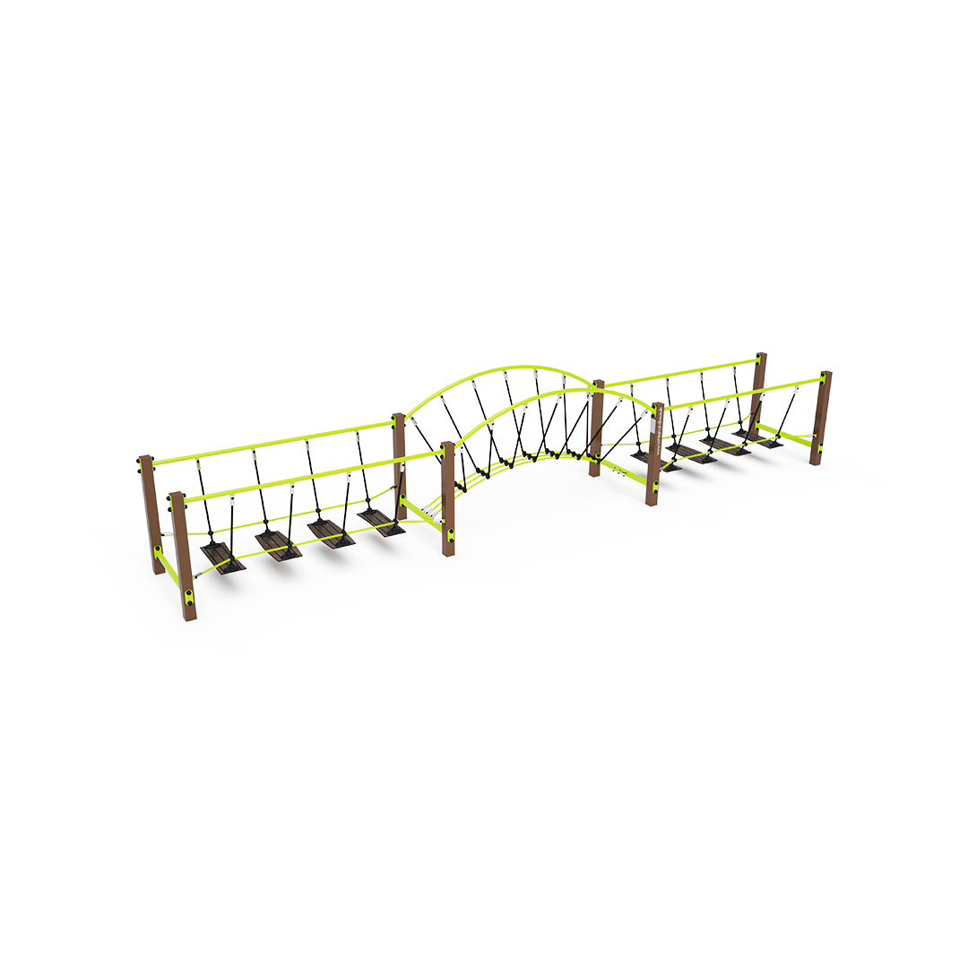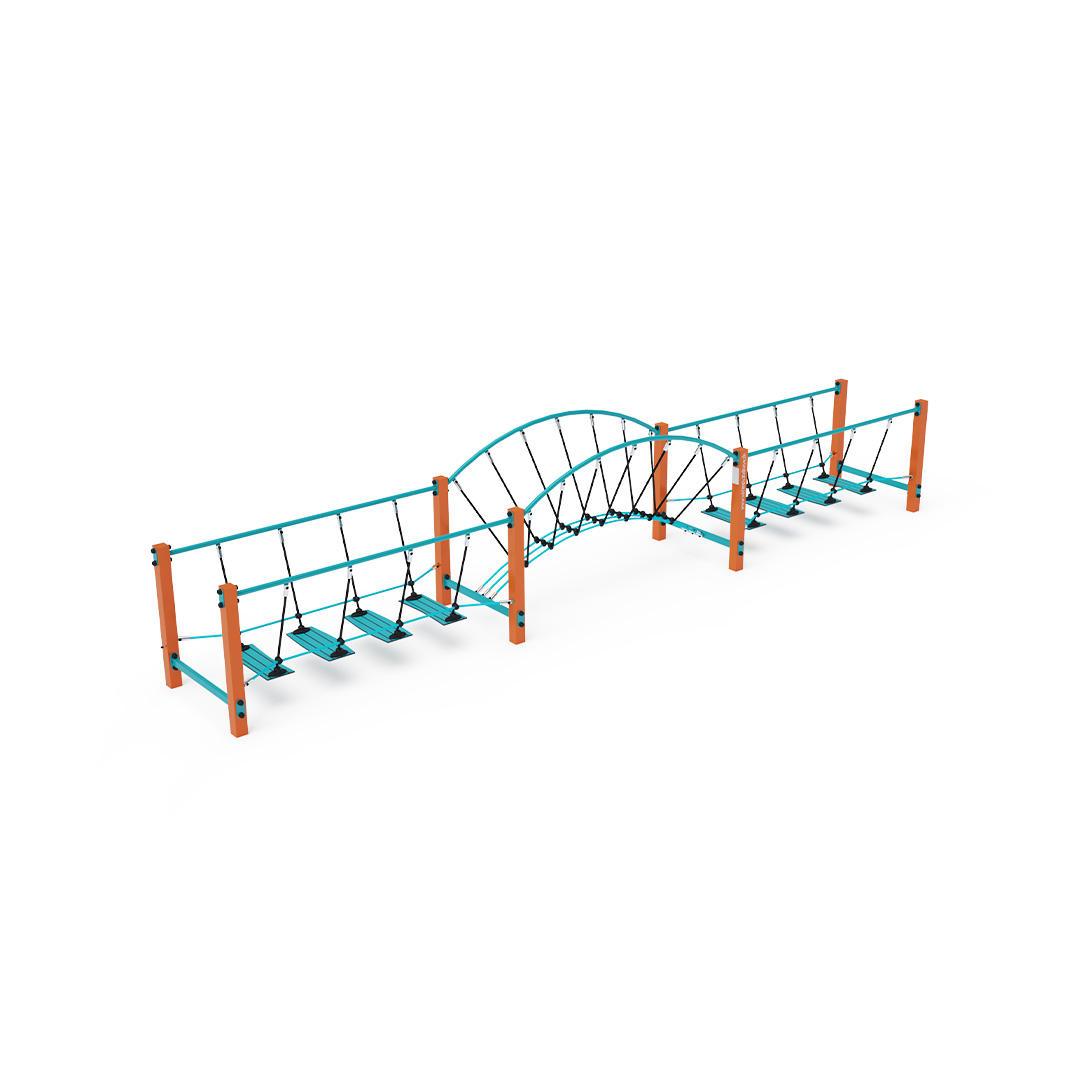 Bezúdržbový kombinovaný balanční mostík s HPL protiskluzovými nášlapy zavěšenými na polyesterových lanech je herním prvkem, díky kterému děti trénují svou koordinaci, stabilitu a rovnováhu. Vyroben je ze žárově zinkované oceli, která je upravena práškovou vypalovanou barvou. Lana jsou vyrobena z polyesterových vláken, která jsou vinutá kolem středu. Tato konstrukce lana zvyšuje jeho pevnost a odolnost vůči mechanickému namáhání. Polyester má mnoho kladných vlastností: je odolný vůči mikroorganismům, povětrnostním vlivům, rychle schne po dešti, je stálobarevný a vyznačuje se vysokou pevností. Spojovací materiály jsou nerezové. Jako dopadovou plochu lze použít travnatý povrch, doporučujeme však zatravňovací rohož.