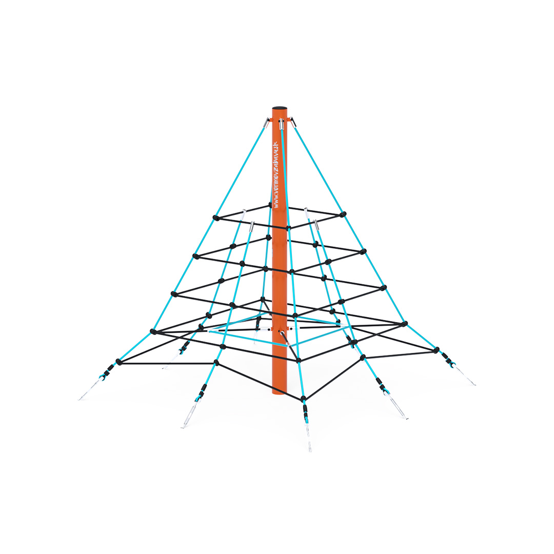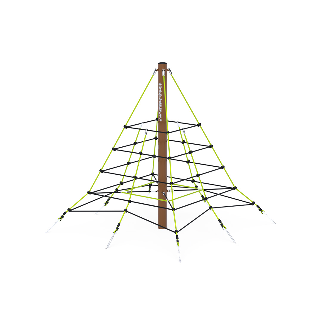 Dvoumetrová lanová pyramida je vhodná i pro menší děti, které jistě získají odvahu vylézt až na vrchol. Herní prvek je vyroben ze zinkované oceli s kvalitní povrchovou úpravou, spoje jsou nerezové a zakryté plastovými krytkami pro zvýšení bezpečnosti a životnosti spojů. Lana jsou vyrobena z polyesterových vláken, která jsou vinutá kolem středu. Tato konstrukce lana zvyšuje jeho pevnost a odolnost proti mechanickému namáhání. Polyester má mnoho kladných vlastností – je odolný vůči mikroorganismům, povětrnostním vlivům, rychle schne po dešti, je stálobarevný a vyznačuje se vysokou pevností. Lanová pyramida VVZ-PYR020 je certifikována podle normy ČSN EN 1176.