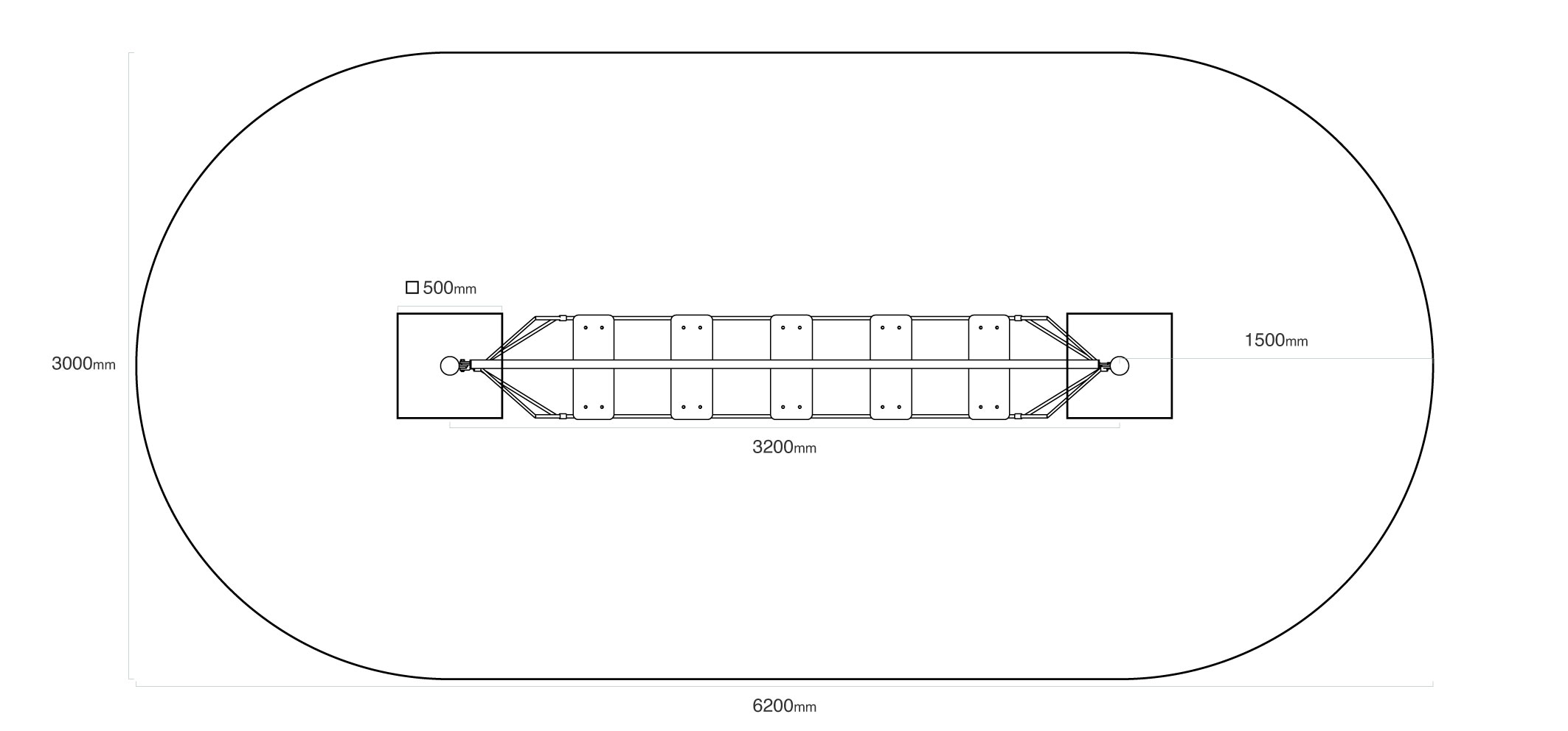 Dopadová plocha: 6,2 × 3,0/>Materiál: Žárově zinkovaná ocel, polyesterová lana, nerezový spojovací materiál