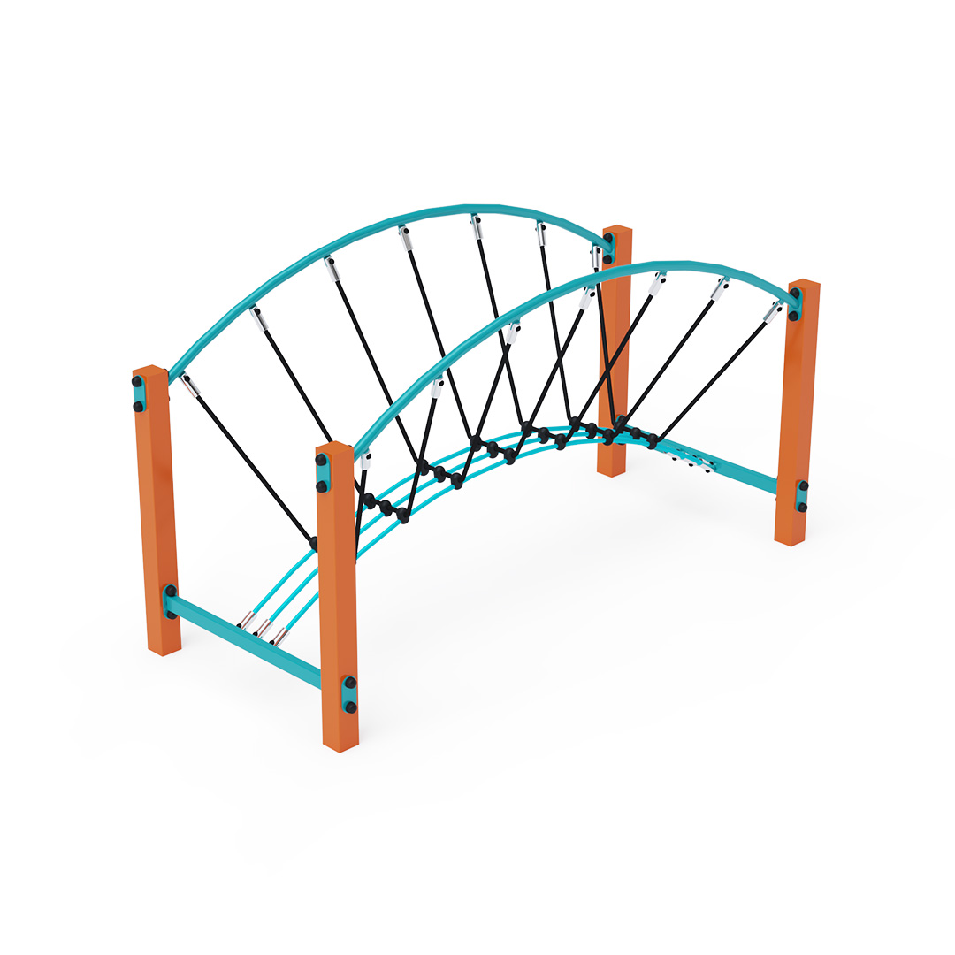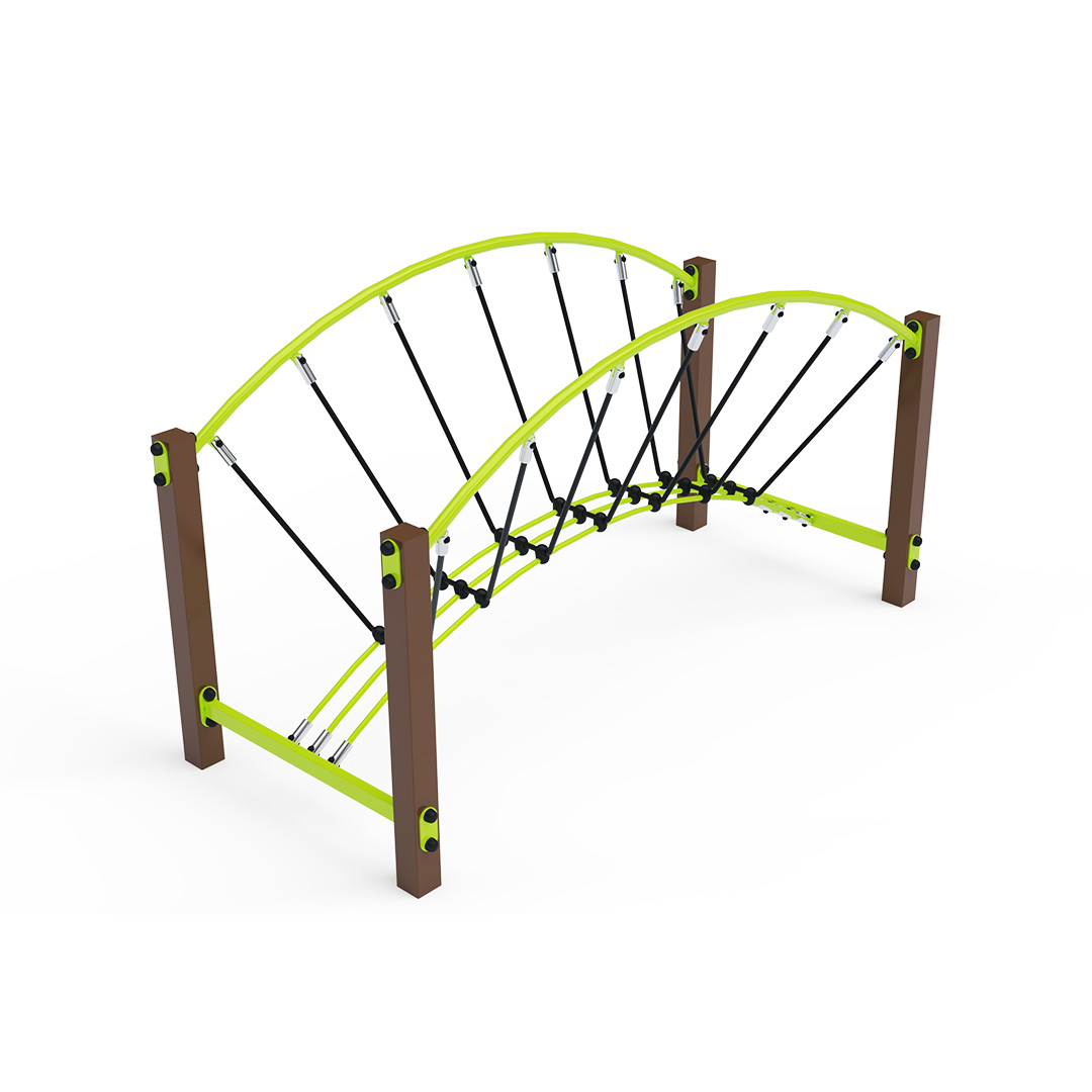 Bezúdržbový obloukový lanový mostík s úzkou lanovou lávkou zavěšenou na polyesterových lanech je herním prvkem, díky kterému děti trénují svou koordinaci, stabilitu a rovnováhu. Vyroben je ze žárově zinkované oceli, která je upravena práškovou vypalovanou barvou. Lana jsou vyrobena z polyesterových vláken, která jsou vinutá kolem středu. Tato konstrukce lana zvyšuje jeho pevnost a odolnost proti mechanickému namáhání. Polyester má mnoho kladných vlastností – je odolný vůči mikroorganismům, povětrnostním vlivům, rychle schne po dešti, je stálobarevný a vyznačuje se vysokou pevností. Spojovací materiály jsou nerezové. Jako dopadovou plochu lze použít travnatý povrch, doporučujeme však zatravňovací rohož.