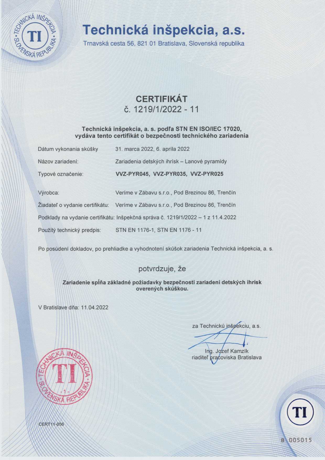 Lanová pyramida VVZ-PYR045 je certifikována podle normy ČSN EN 1176.