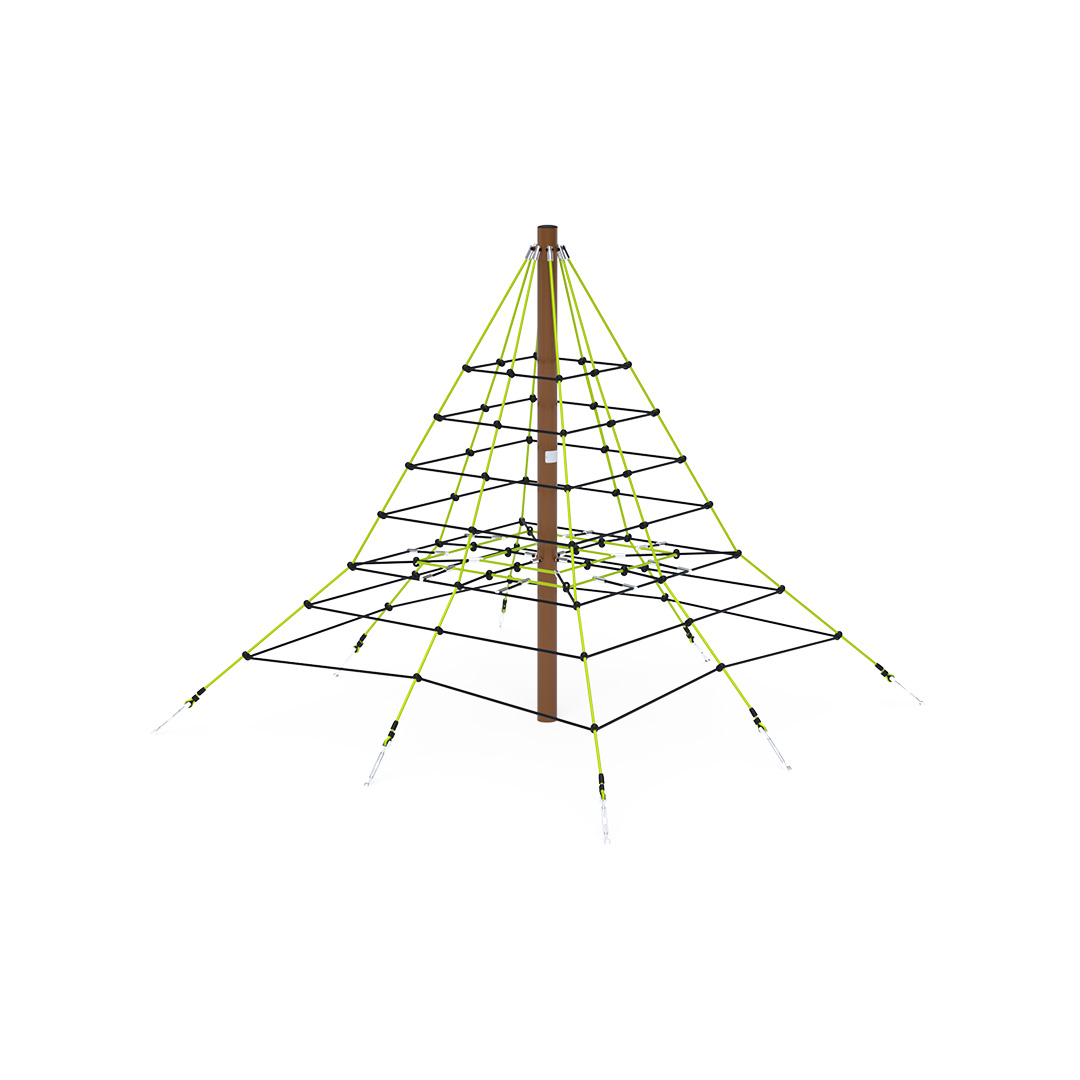 Dvouapůlmetrová lanová pyramida je vhodná i pro menší děti, které v přítomnosti rodičů naberou odvahu vylézt až na vrchol. Herní prvek je vyroben ze zinkované oceli s kvalitní povrchovou úpravou. Spoje jsou z nerezové oceli a jsou zakryty plastovými krytkami, což zvyšuje bezpečnost i životnost spojů. Lana jsou vyrobena z polyesterových vláken, vinutých kolem středového jádra. Tato konstrukce zajišťuje vyšší pevnost a odolnost proti mechanickému namáhání. Polyester má mnoho pozitivních vlastností – je odolný vůči mikroorganismům, povětrnostním vlivům, rychle schne po dešti, je stálobarevný a velmi pevný.