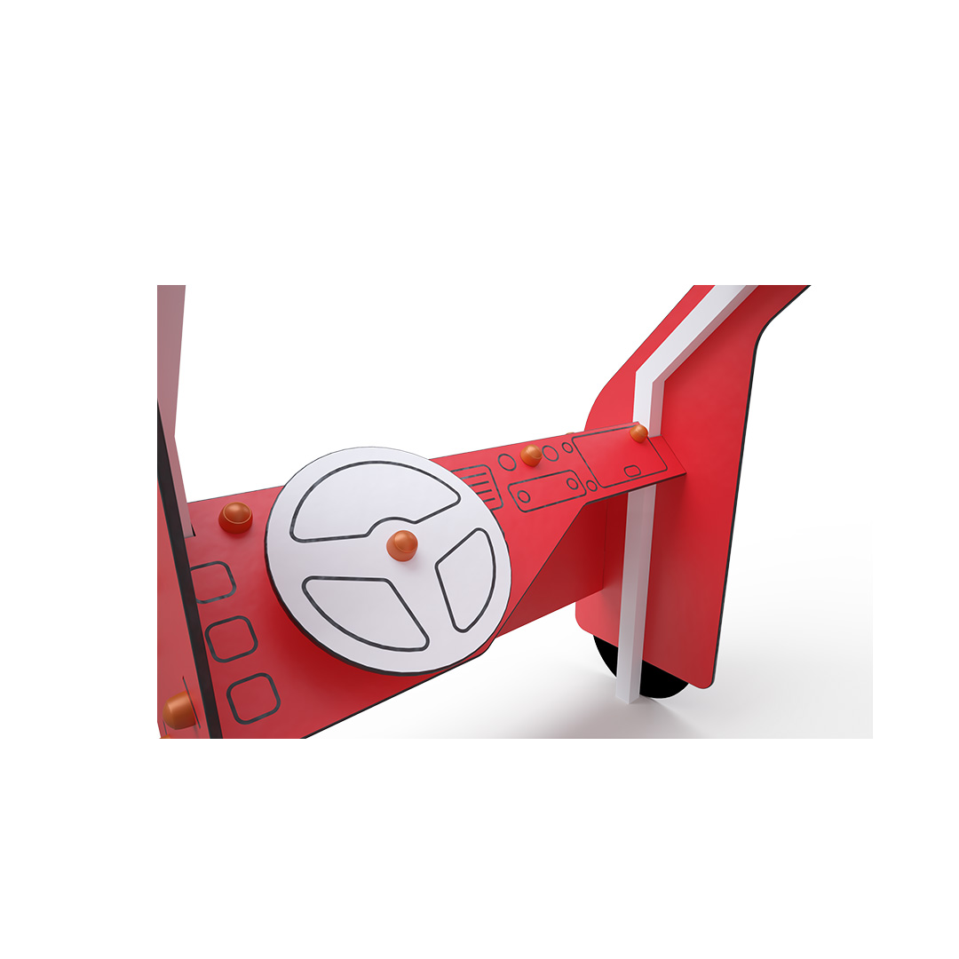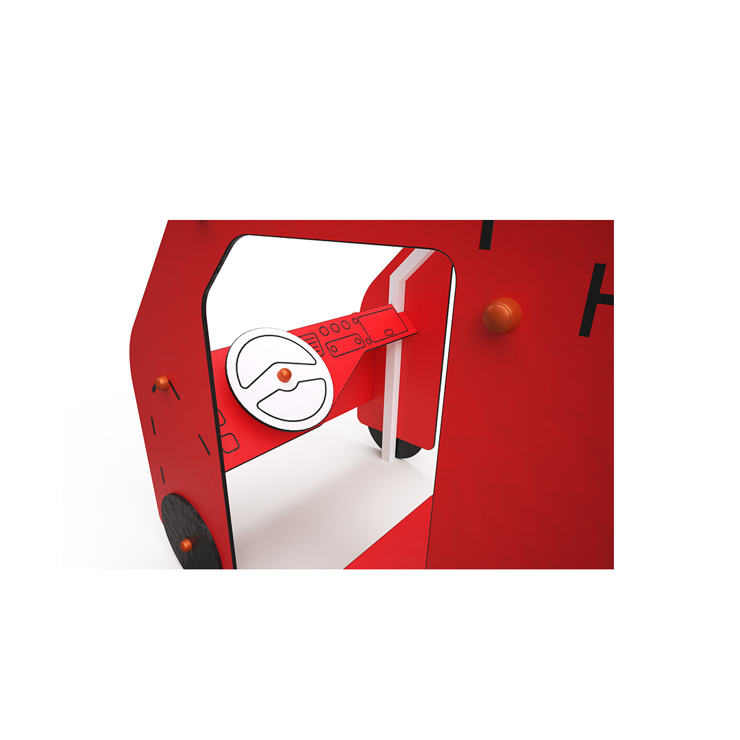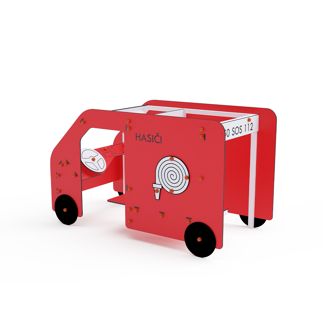 Dopravní prostředek – Hasiči je ideální tematický prvek pro rozvoj dětské fantazie a týmové spolupráce, díky čemuž je vhodný i pro nejmenší děti. Otočný volant spolu s tematickými prvky zintenzivňuje pocit ze hry. Ocelová konstrukce je odolná vůči povětrnostním vlivům díky žárovému zinkování a lakování odolnou práškovou barvou. Použitý HPL materiál je chemicky odolný, odolný vůči UV záření – stálobarevný, netoxický, recyklovatelný a nelámavý. Nehrozí tak poranění dětí ostrými hranami nebo úlomky. Všechny spoje jsou nerezové a zakryté plastovými krytkami pro zvýšení životnosti a bezpečnosti.