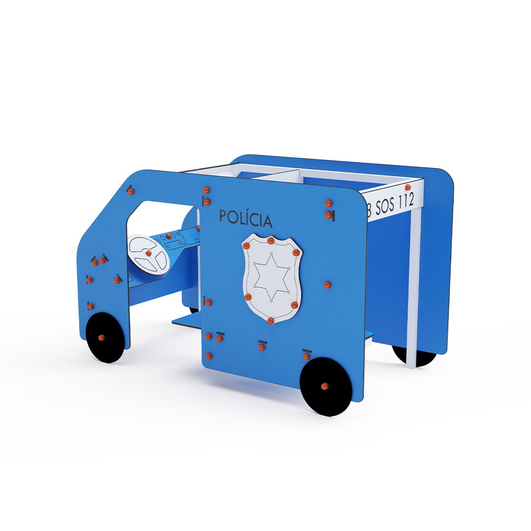 Dopravní prostředek – Policie je ideální tematický prvek pro rozvoj dětské fantazie a týmové spolupráce, díky čemuž je vhodný i pro nejmenší děti. Otočný volant spolu s tematickými prvky zintenzivňuje pocit ze hry. Ocelová konstrukce je odolná vůči povětrnostním vlivům díky žárovému zinkování a lakování odolnou práškovou barvou. Použitý HPL materiál je chemicky odolný, odolný vůči UV záření – stálobarevný, netoxický, recyklovatelný a nelámavý. Nehrozí tak poranění dětí ostrými hranami nebo úlomky. Všechny spoje jsou nerezové a zakryté plastovými krytkami pro zvýšení životnosti a bezpečnosti.