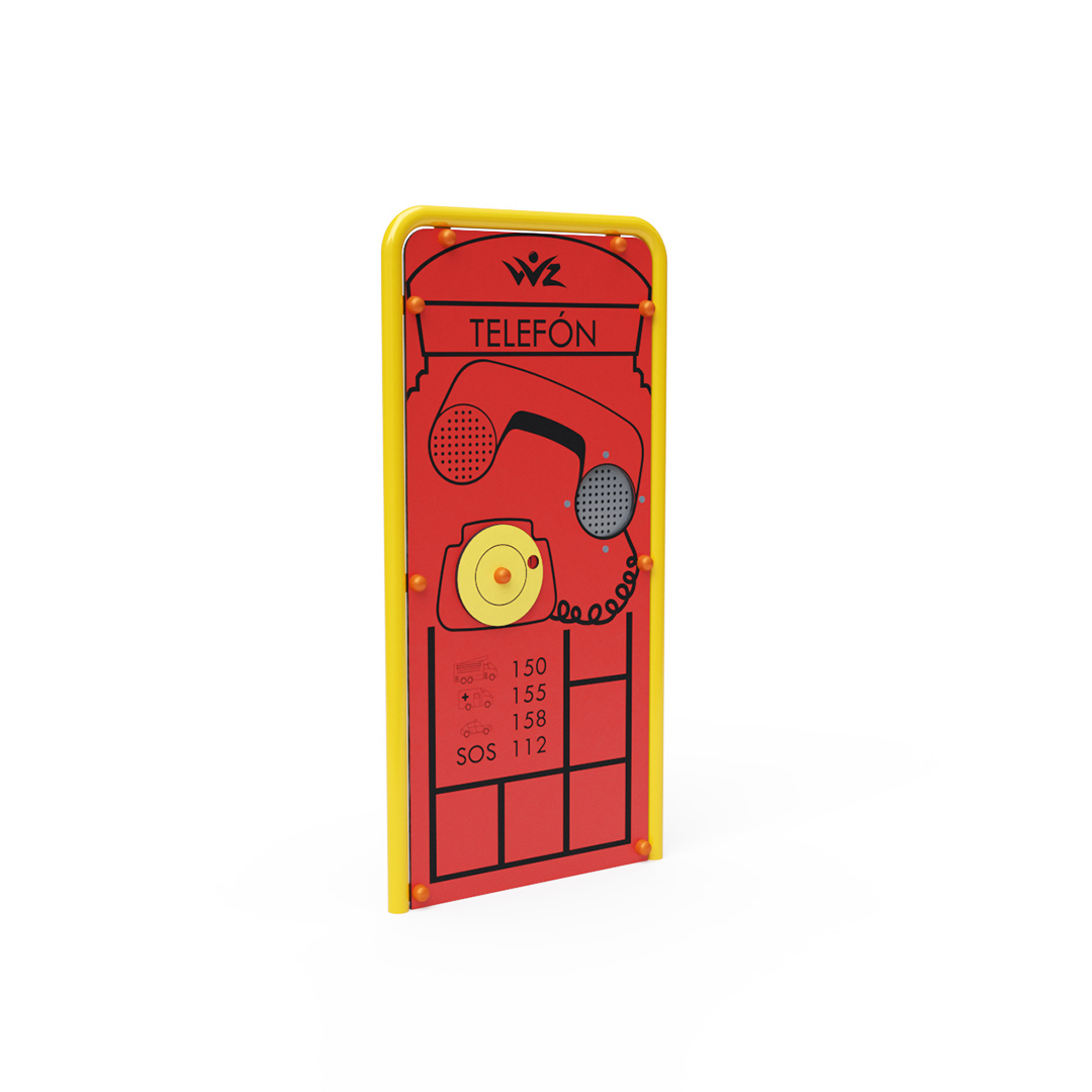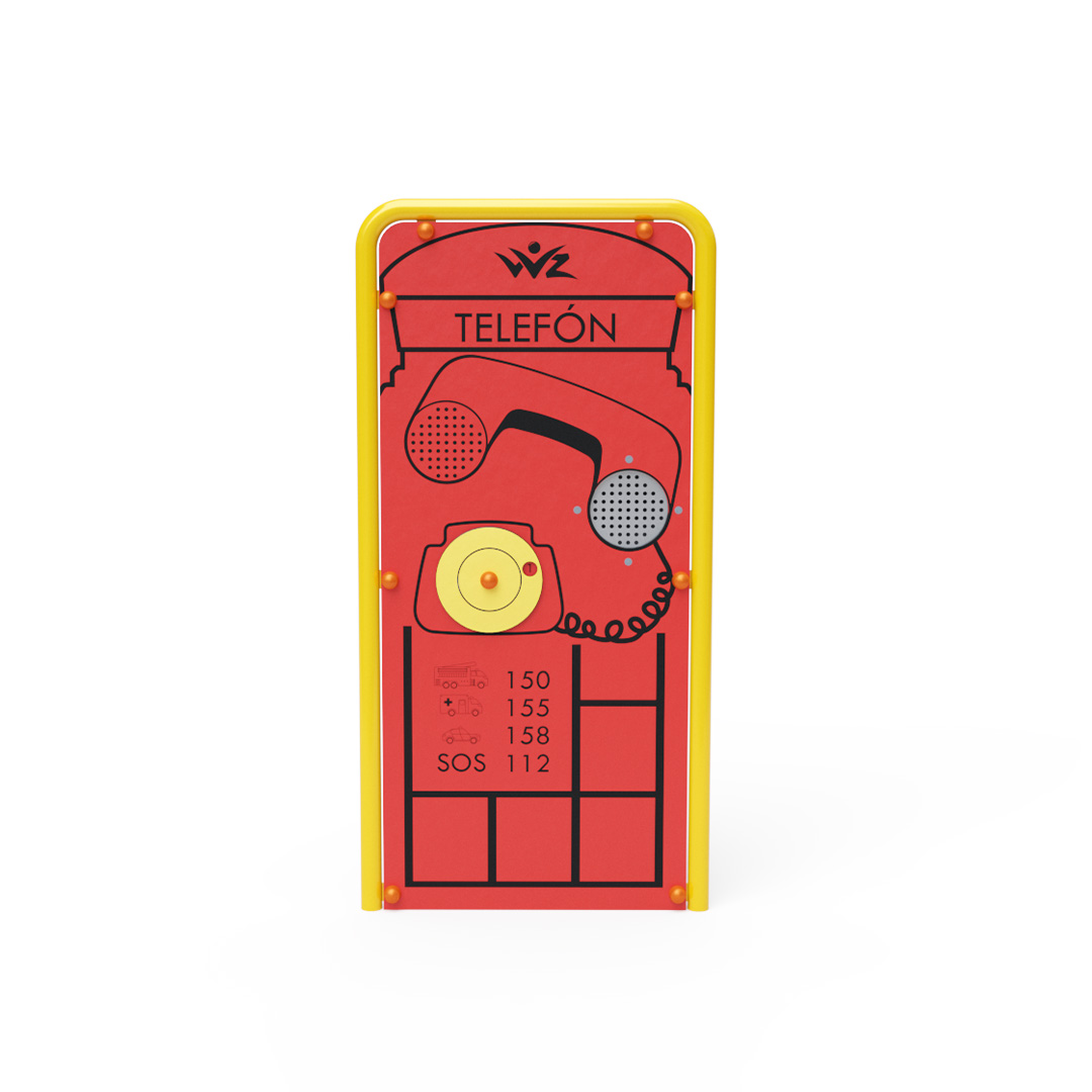 Skutečně funkční telefonní budka v anglickém stylu, doplněná o nouzová čísla. Díky podzemnímu propojení obou částí telefonu mohou děti komunikovat z jedné strany hřiště na druhou. Konstrukce edukativního panelu je vyrobena z pozinkované oceli ošetřené práškovým lakováním. Spoje jsou nerezové a zakryté plastovými krytkami pro zvýšení bezpečnosti a životnosti spojů. Panel samotný je vyroben z HPL materiálu, který je chemicky odolný, odolný vůči UV záření, netoxický, recyklovatelný a nelámavý. To zajišťuje, že nehrozí poranění dětí ostrými hranami nebo úlomky.
