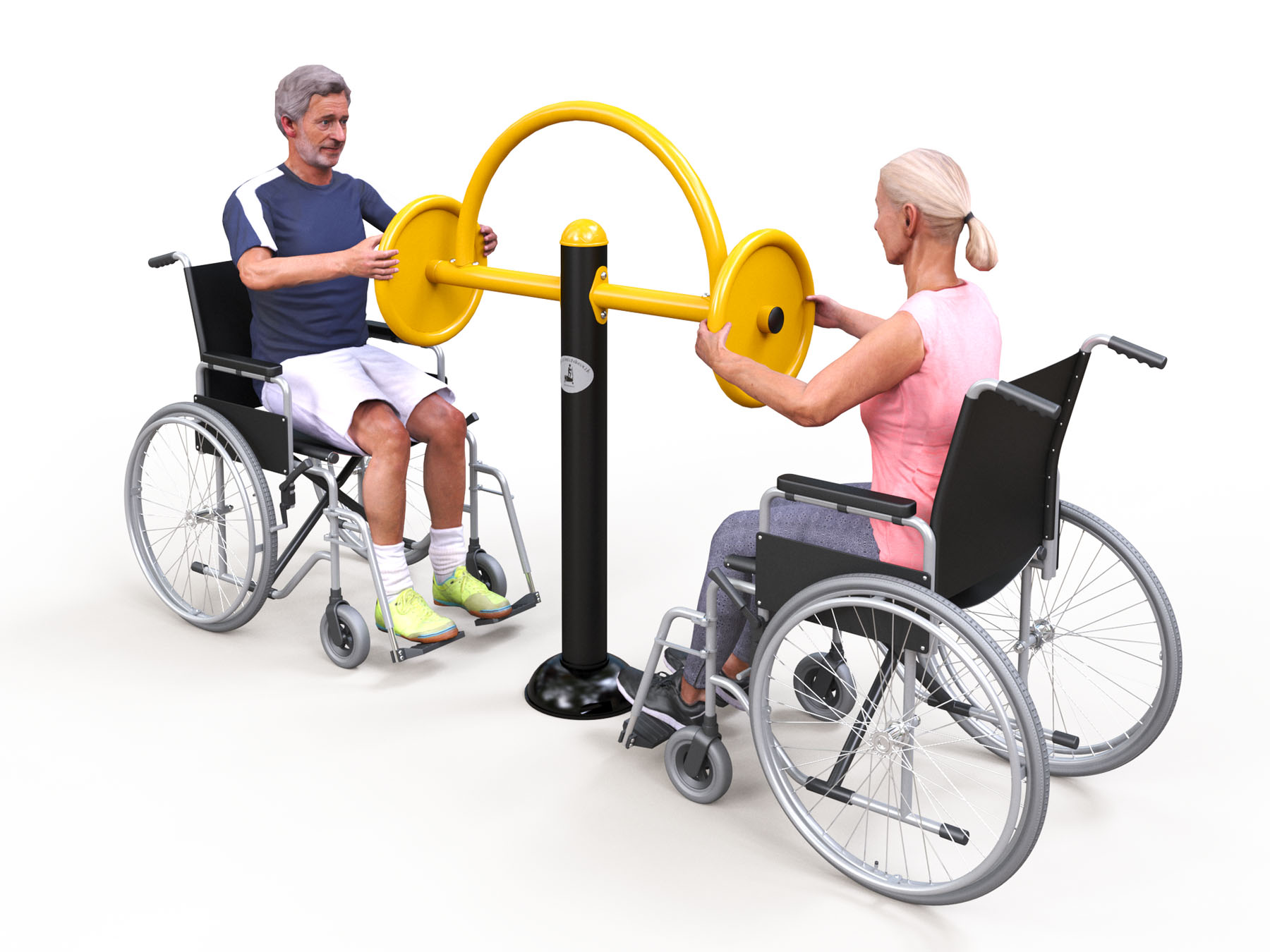 HF01 venkovní fitness zařízení pro hendikepované – slouží k procvičení svalů a kloubů horních končetin od ramen přes lokty až po zápěstí. Minimální potřebná plocha pro umístění zařízení je 4100 × 3400 mm.