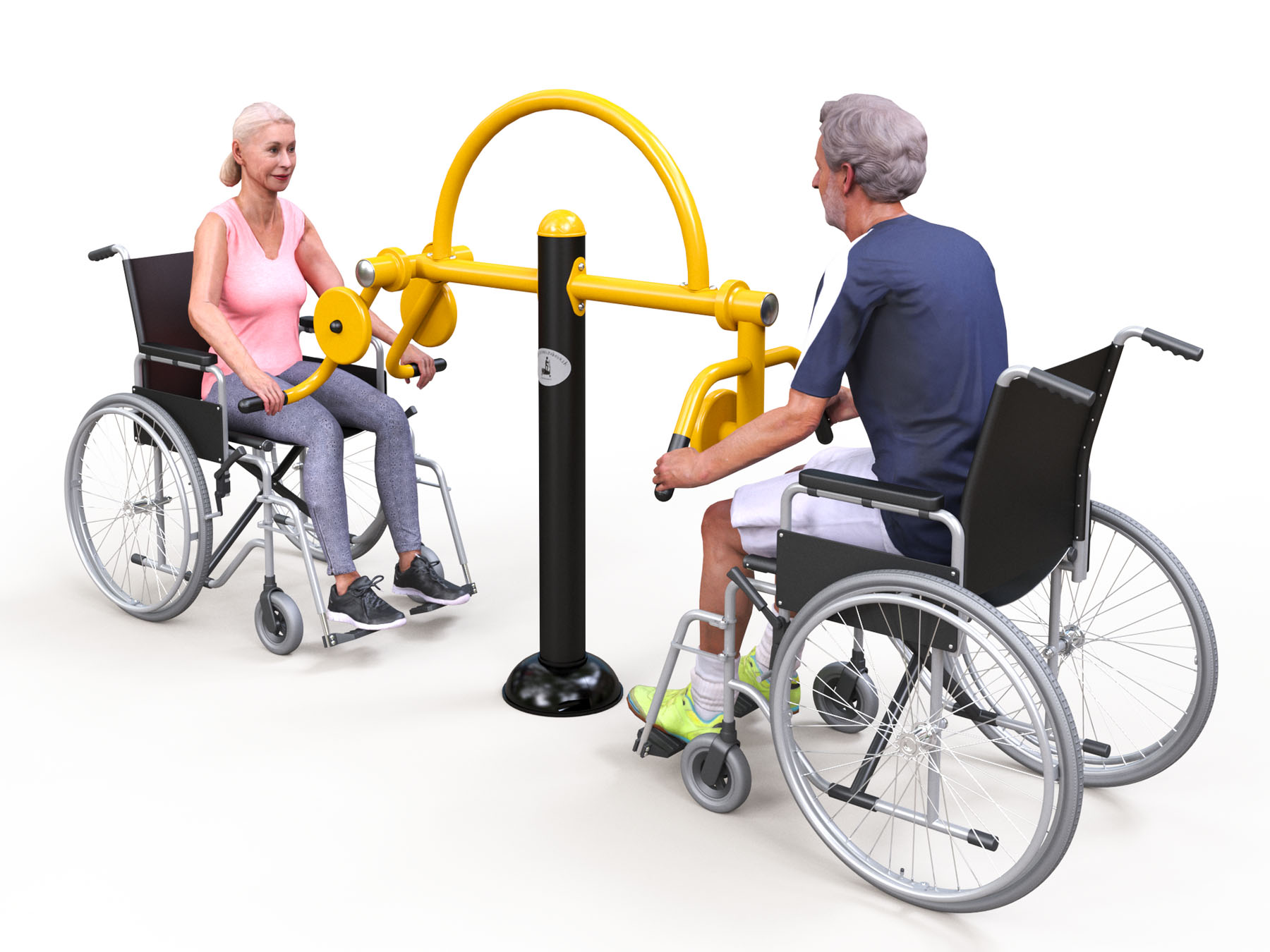 HF08 venkovní fitness zařízení pro handicapované – slouží k procvičení horních končetin dvěma způsoby se závažím. Minimální potřebná plocha pro umístění stroje je 4370 × 3700 mm.