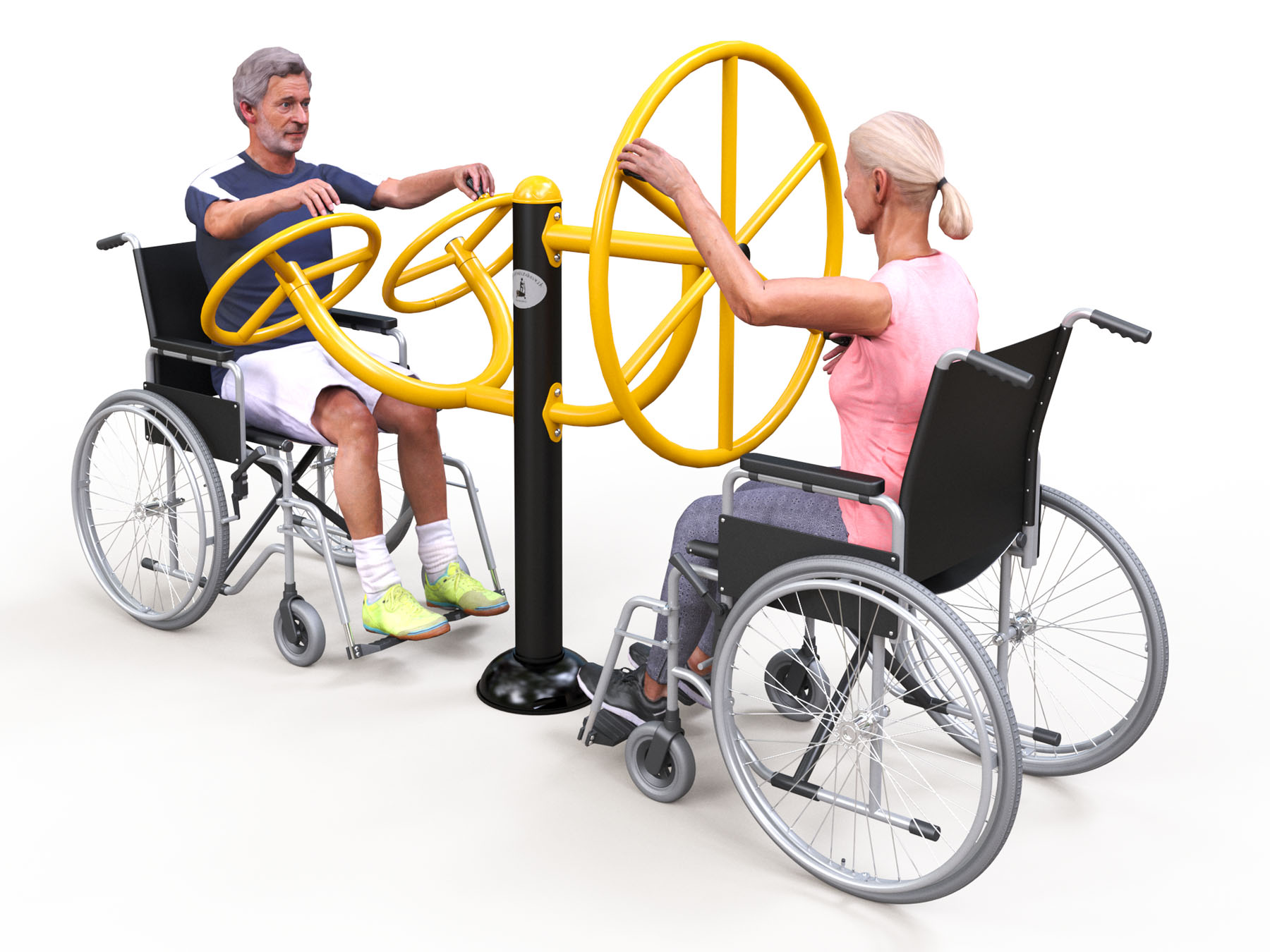 HF14 venkovní fitness zařízení pro osoby se zdravotním postižením – slouží k procvičení horních končetin krouživými pohyby na dvou různých stanovištích. Minimální potřebná plocha pro umístění zařízení je 4300 x 3900 mm.