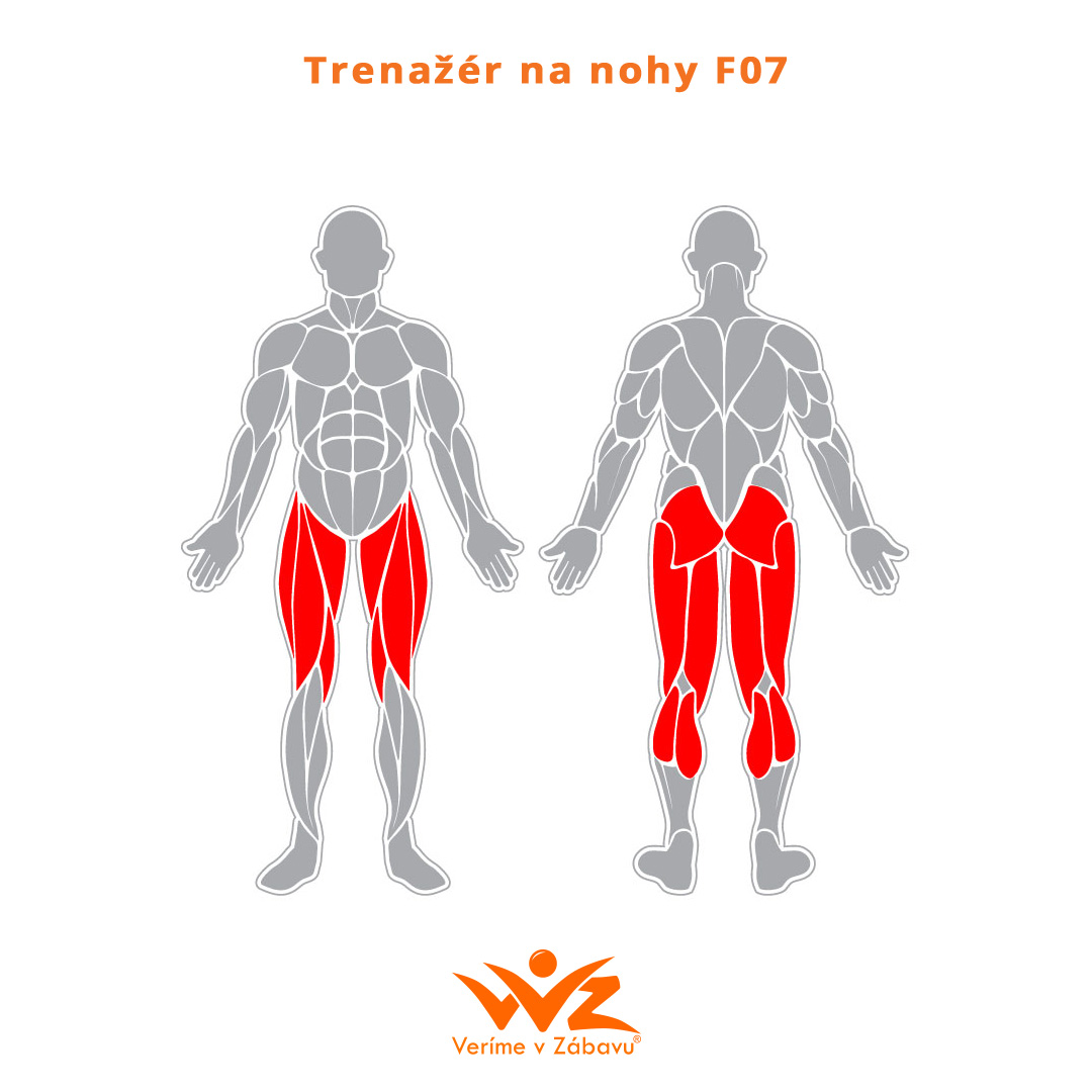 F07 Trenažér na nohy – komplexně procvičíte svaly dolních končetin, hýžďové svaly, stehna a lýtka. Cvičení je vhodné pro nárůst svalové hmoty v dolní části těla, je technicky nenáročné a pohodlné, protože nezatěžuje svalstvo zad.