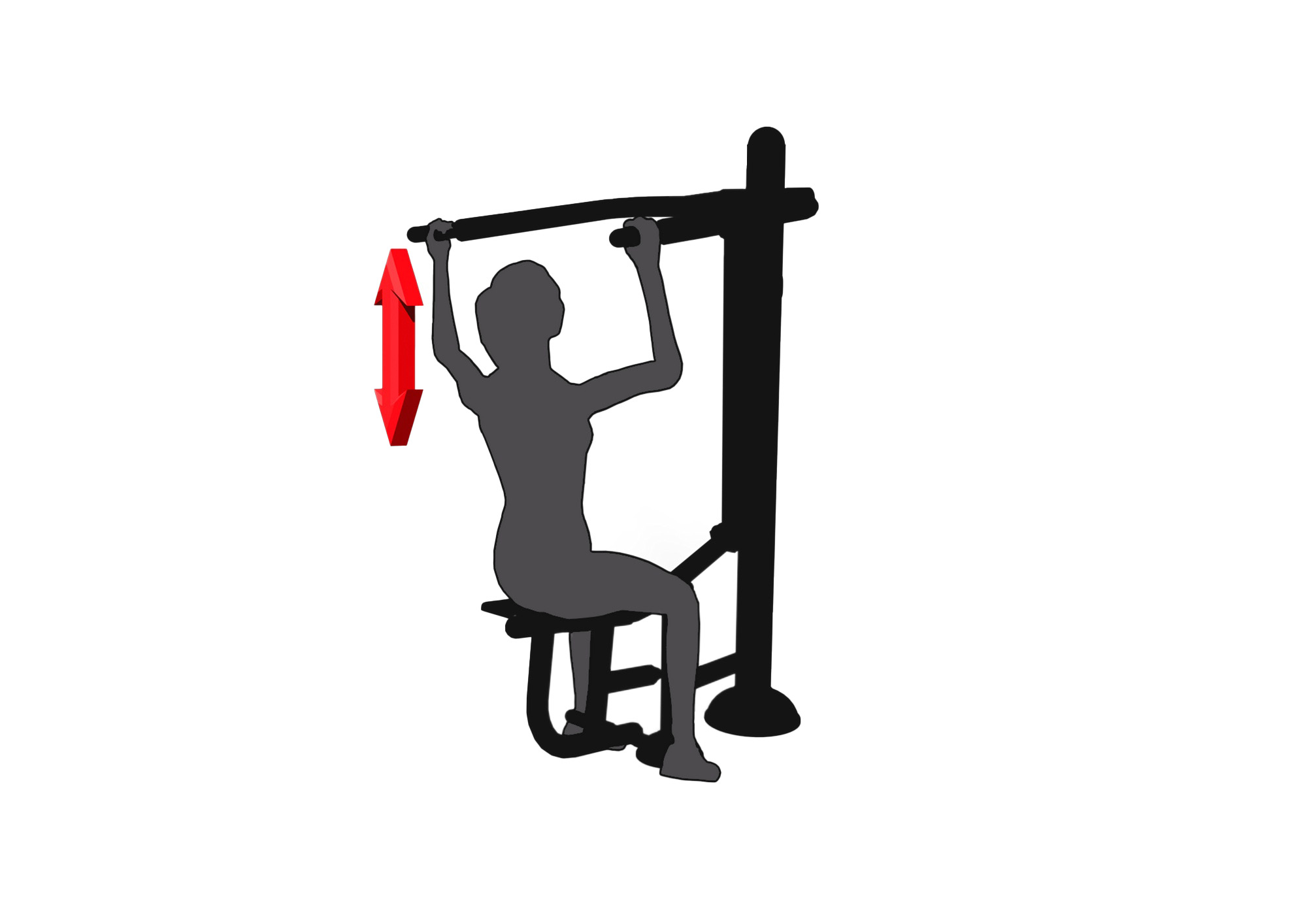 Jak cvičit – posaďte se na sedadlo s rovnými zády a obličejem směrem k zařízení. Pevně uchopte obě madla. Pomalu táhněte madla dolů, až budou ruce na úrovni hrudníku. Madla pomalu vraťte do výchozí polohy. Nádech provádějte při pohybu rukou dolů, výdech při pohybu nahoru. Provádějte plynulé a kontrolované pohyby. Počet opakování postupně zvyšujte podle zlepšování kondice.
