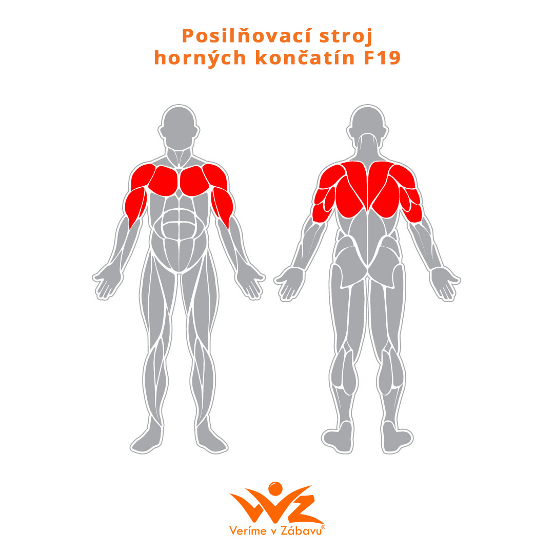 F19 Posilovací stroj horních končetin – slouží k procvičení, zpevnění a nárůstu svalové hmoty horní části těla: svaly zad, ramen, hrudníku a horních končetin.