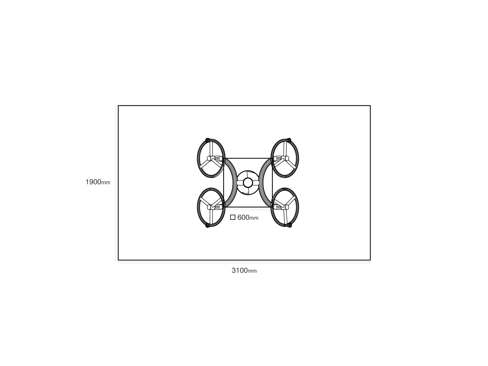 Bezpečnostní zóna: 1,9 × 3,1 m