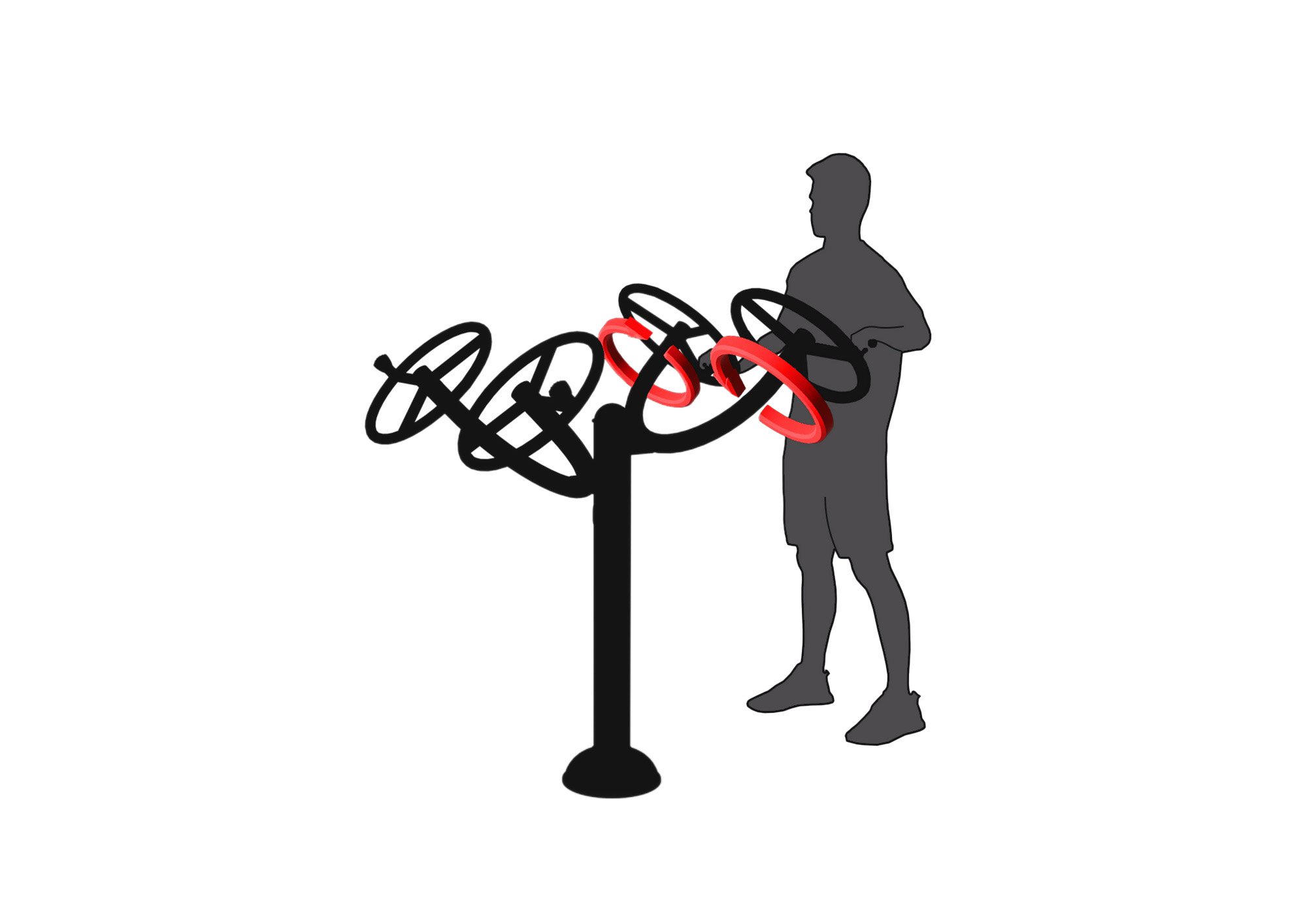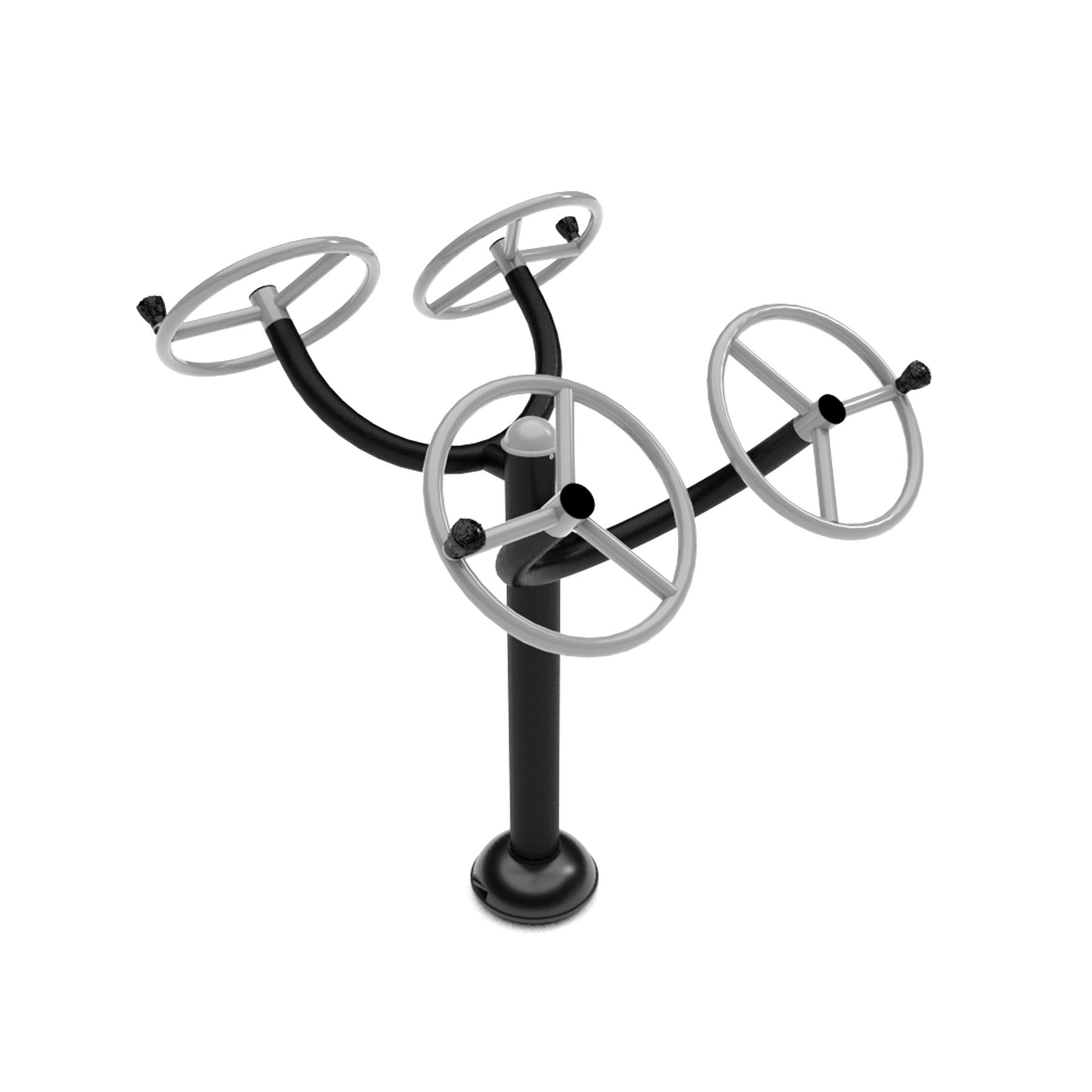 Rozkročte se na šířku ramen a postavte se tak, aby byla hrudník uprostřed mezi dvěma koly. Uchopte obě kliky a otáčejte koly tak, aby byly co nejvýše. Současně otáčejte levým kolem proti směru hodinových ručiček a pravým kolem ve směru hodinových ručiček. Pro zvýšení efektivity cvičení střídejte směry otáčení. Provádějte plynulé a kontrolované pohyby. Počet opakování postupně zvyšujte podle zlepšování kondice.