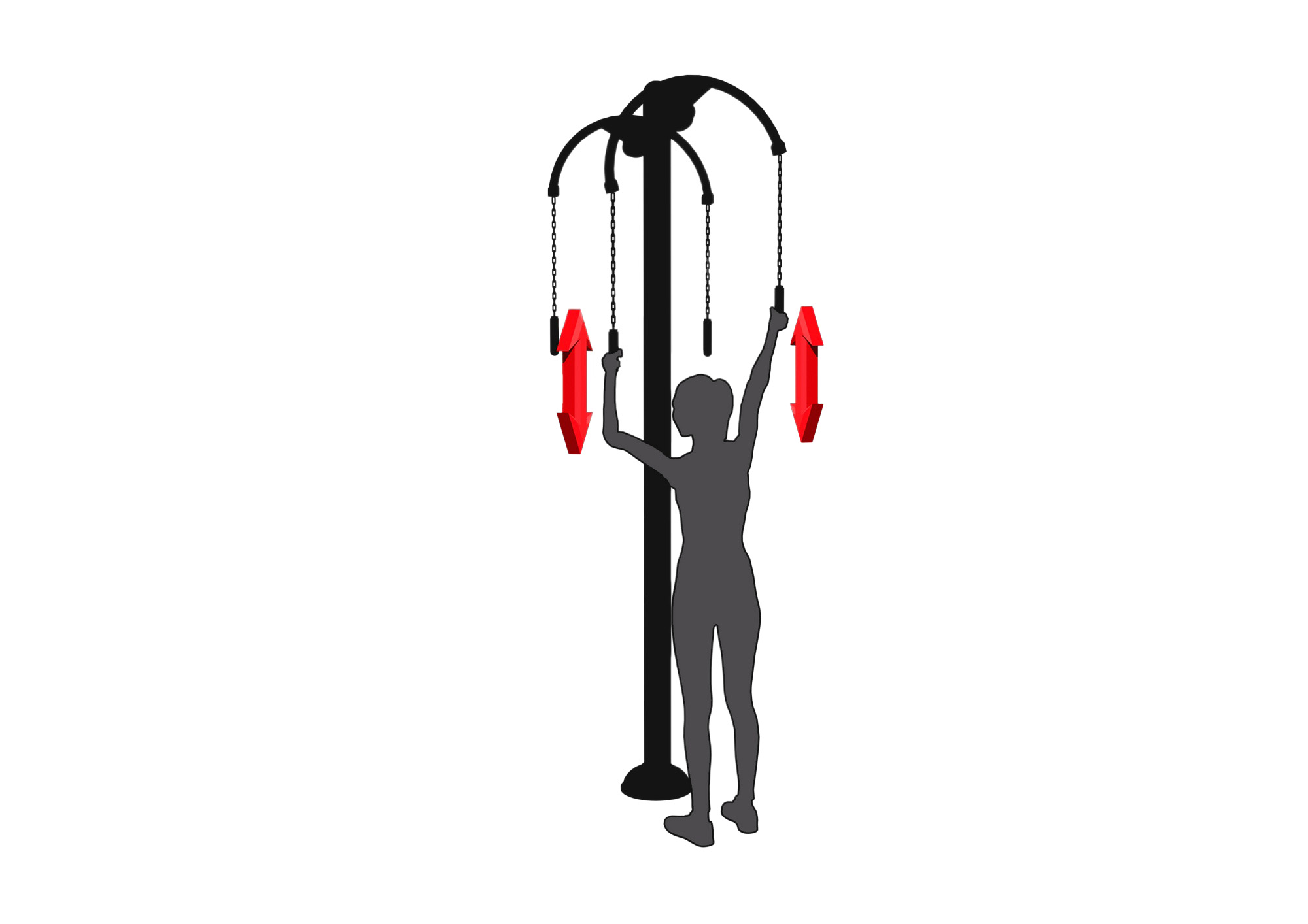 Postavte se rozkročmo na šířku ramen tak, aby byla hrudník mezi dvěma madly. Uchopte madla a zařízení střídavě táhněte jednou rukou. Provádějte plynulé a kontrolované pohyby. Počet opakování zvyšujte podle zlepšení kondice.