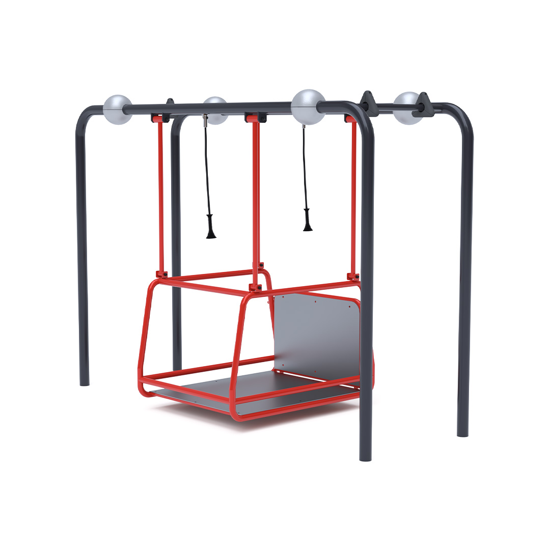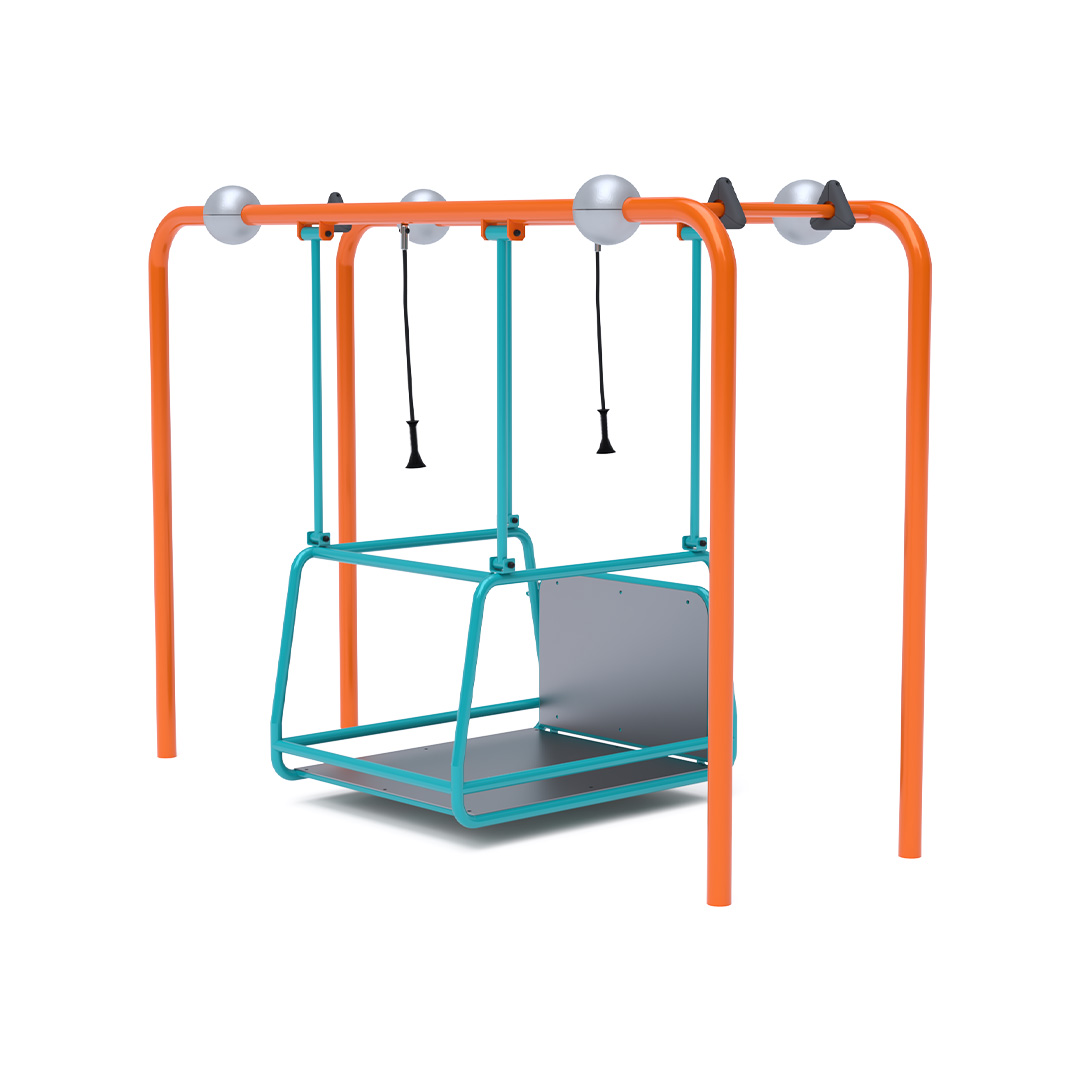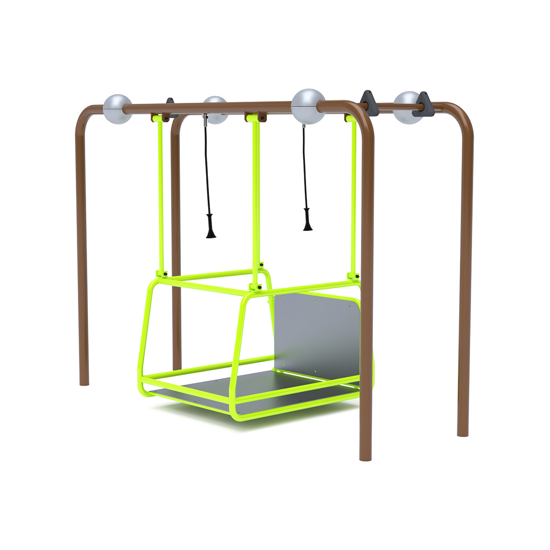 Inkluzivní houpačka s plošinou, na které je možné houpat všechny děti bez rozdílu. Součástí sestavy je sklápěcí nájezdová plošina a podlaha, která je vyrobena z protiskluzového slzičkového plechu. Na konstrukci je systém, který umožňuje pevně zachytit vozík, aby se předešlo nežádoucímu pohybu po plošině. Konstrukce houpačky je upravena práškovou vypalovanou barvou. Spojovací materiály jsou nerezové a zakryté plastovými krytkami pro zvýšení životnosti a bezpečnosti. Okolo sestavy je jasně vyznačená plocha se zákazem vstupu během používání houpačky.