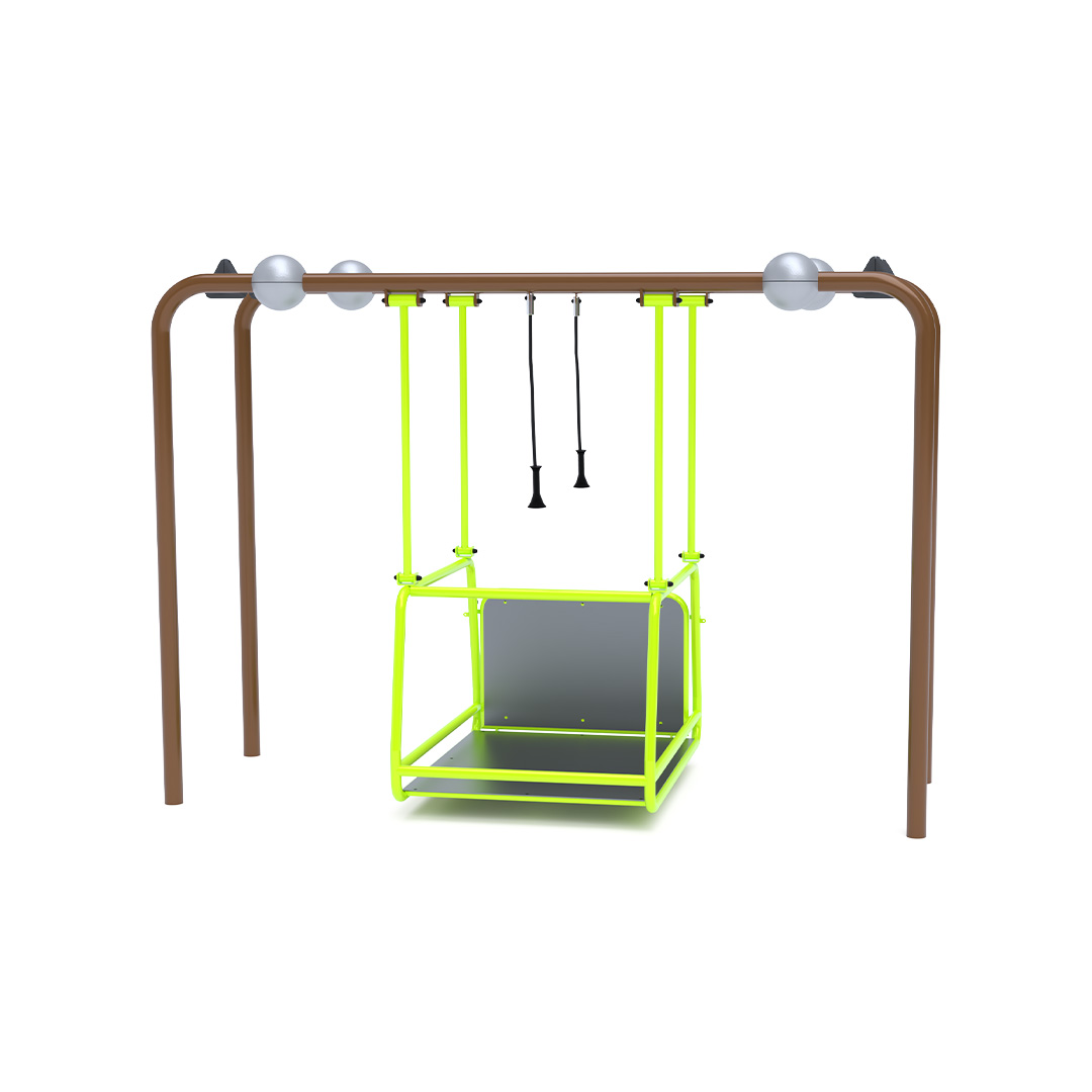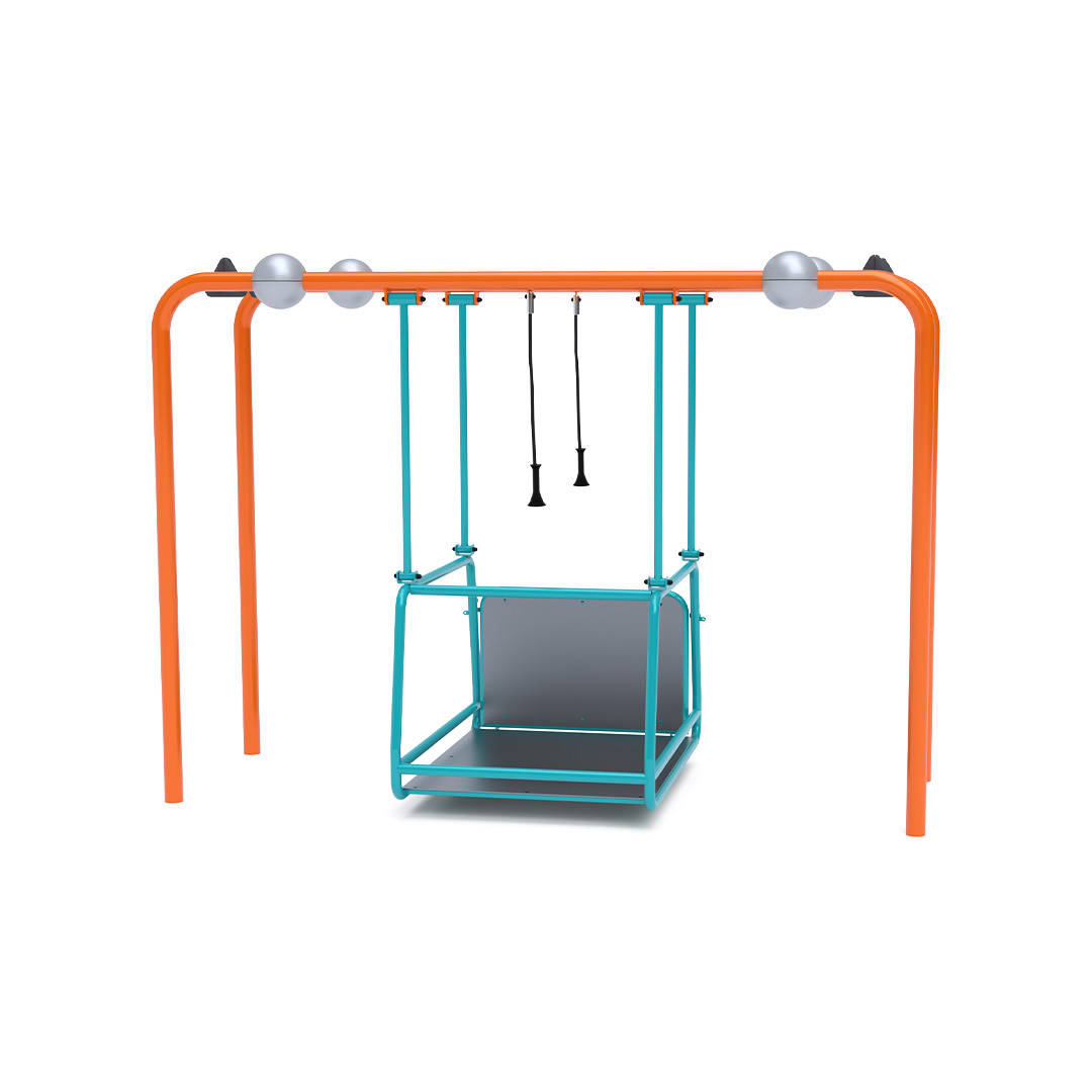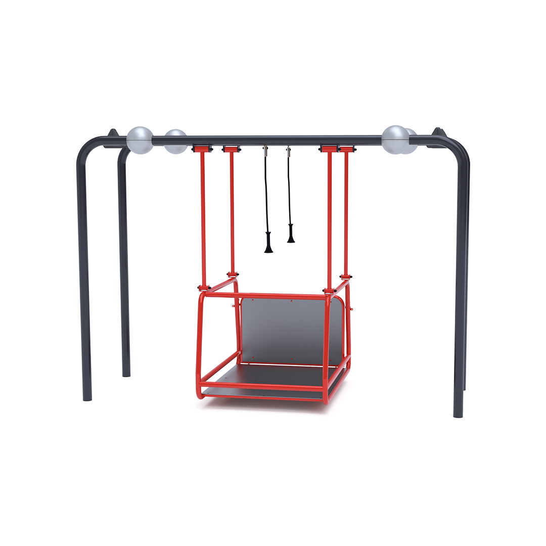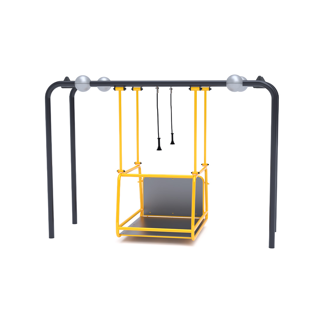 Inkluzivní houpačka s plošinou, na které je možné houpat všechny děti bez rozdílu. Součástí sestavy je sklápěcí nájezdová plošina a podlaha, která je vyrobena z protiskluzového slzičkového plechu. Na konstrukci je systém, který umožňuje pevně zachytit vozík, aby se předešlo nežádoucímu pohybu po plošině. Konstrukce houpačky je upravena práškovou vypalovanou barvou. Spojovací materiály jsou nerezové a zakryté plastovými krytkami pro zvýšení životnosti a bezpečnosti. Okolo sestavy je jasně vyznačená plocha se zákazem vstupu během používání houpačky.