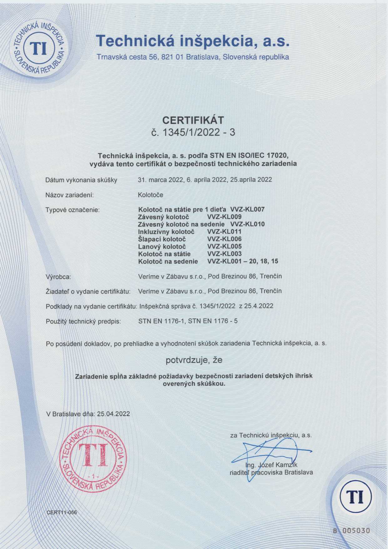 Dětský kolotoč VVZ-KL001-18 je certifikován podle ČSN EN 1176