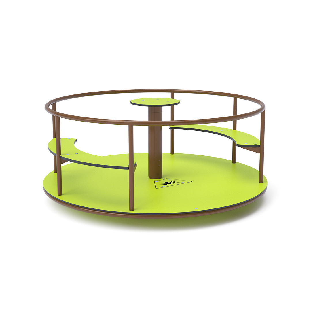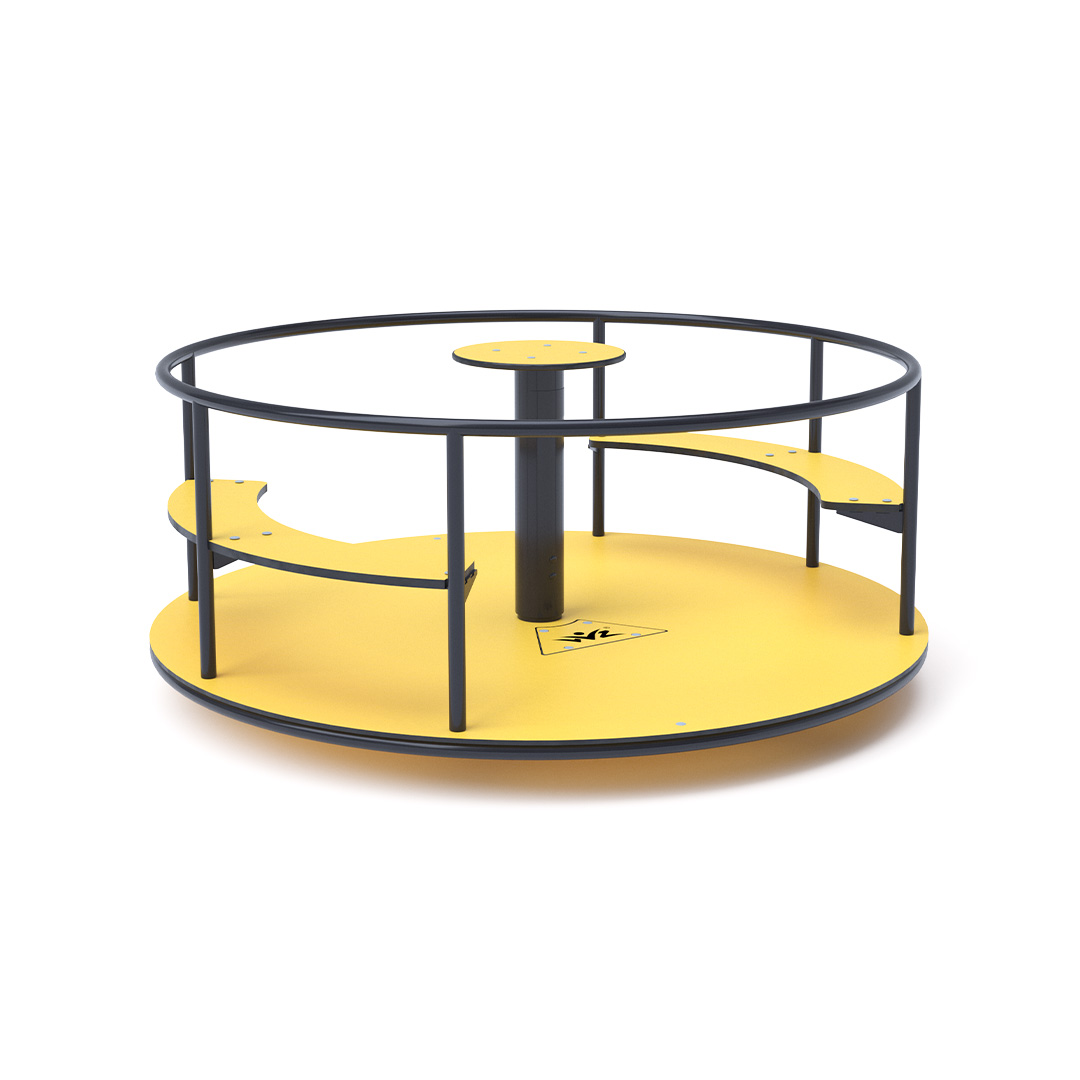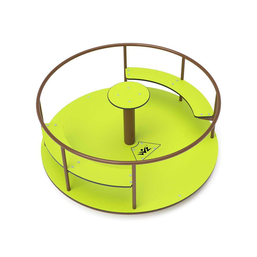 Dětský kolotoč se sedáky k sezení je vyroben ze žárově zinkované oceli, která je upravena práškovou vypalovací barvou. Navržen je s ohledem na dosažení dlouhé životnosti a bezpečnosti provozu. Středový volant, podlaha a sedáky jsou vyrobeny z ekologického HPL materiálu který je odolný vůči UV záření, netoxický recyklovatelný a nelámavý. Nehrozí tak poranění dětí ostrými hranami nebo úlomky.