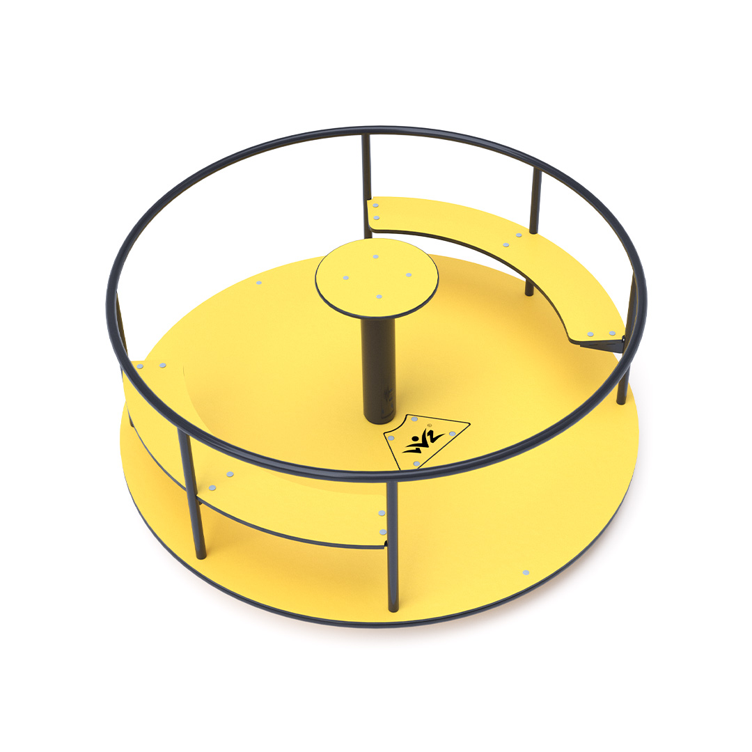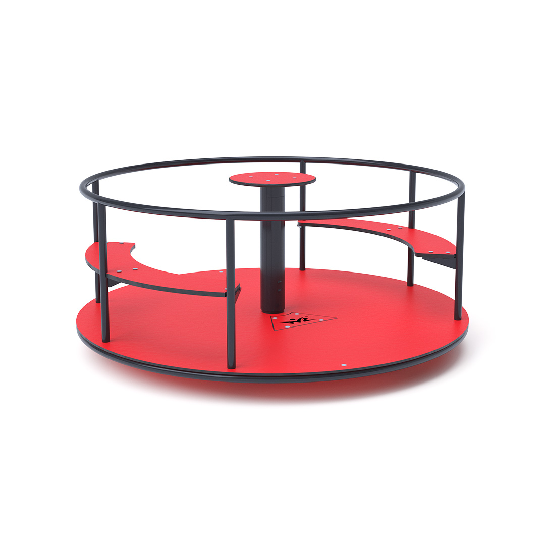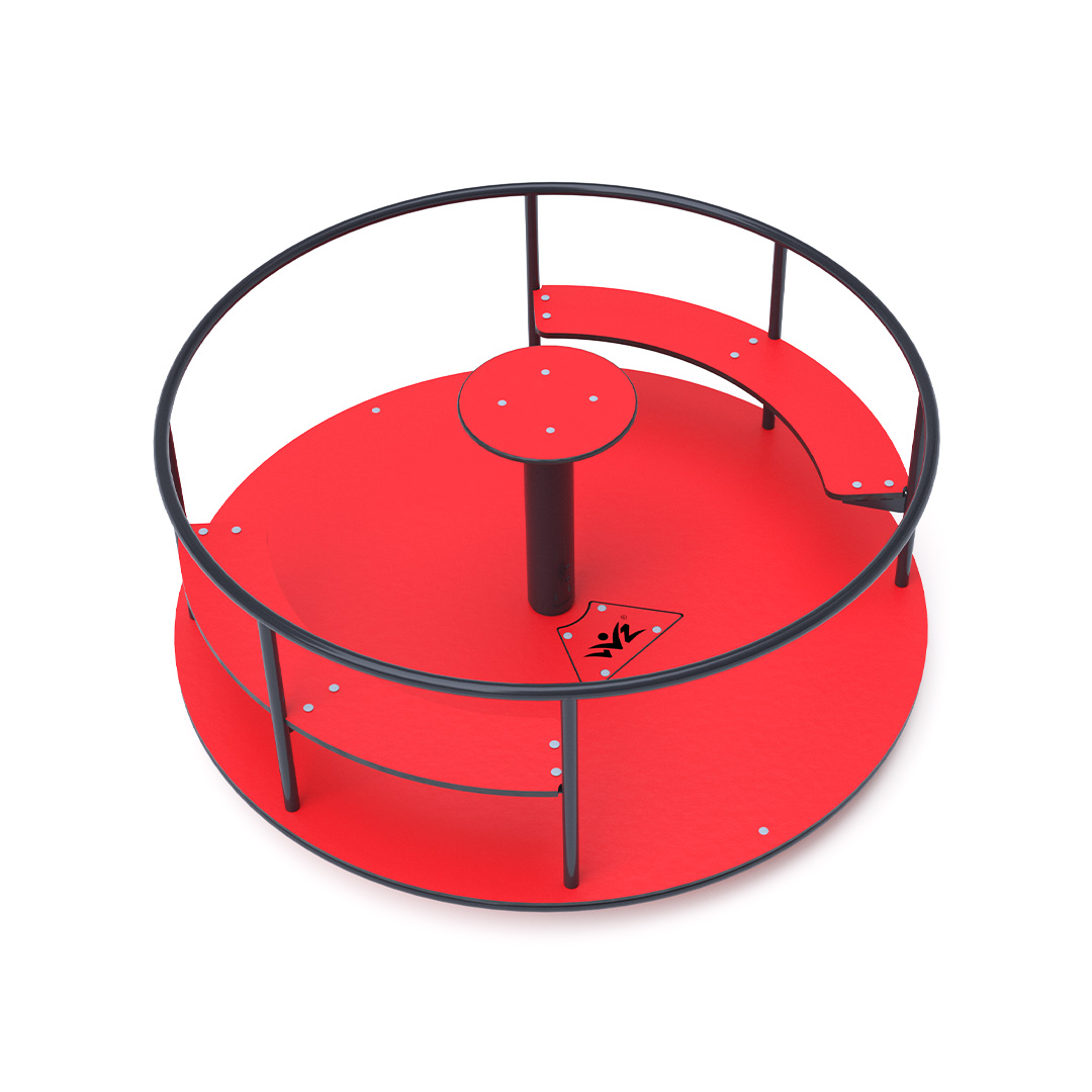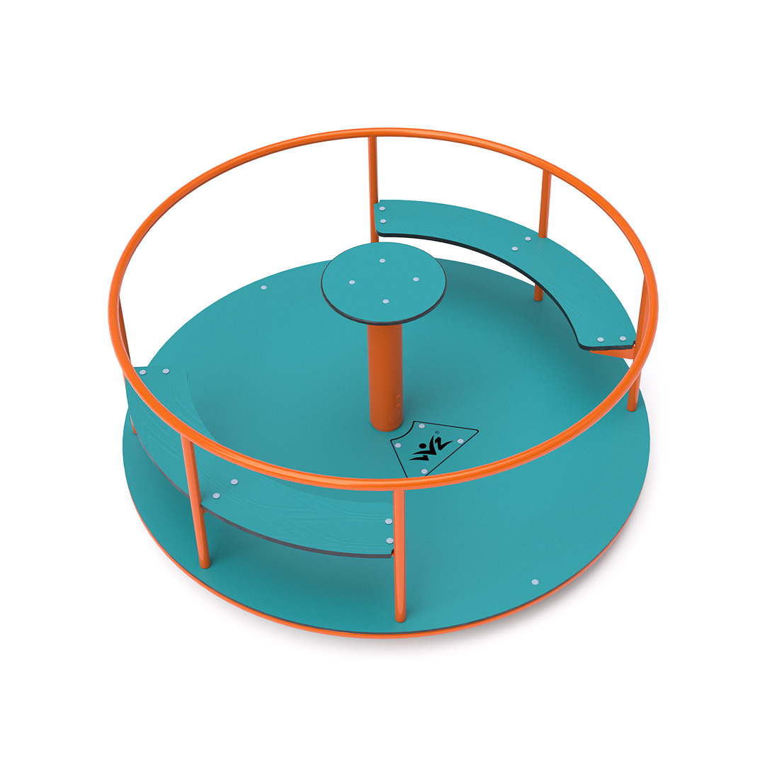 Dětský kolotoč se sedáky k sezení je vyroben ze žárově zinkované oceli, která je upravena práškovou vypalovací barvou. Navržen je s ohledem na dosažení dlouhé životnosti a bezpečnosti provozu. Středový volant, podlaha a sedáky jsou vyrobeny z ekologického HPL materiálu který je odolný vůči UV záření, netoxický recyklovatelný a nelámavý. Nehrozí tak poranění dětí ostrými hranami nebo úlomky.