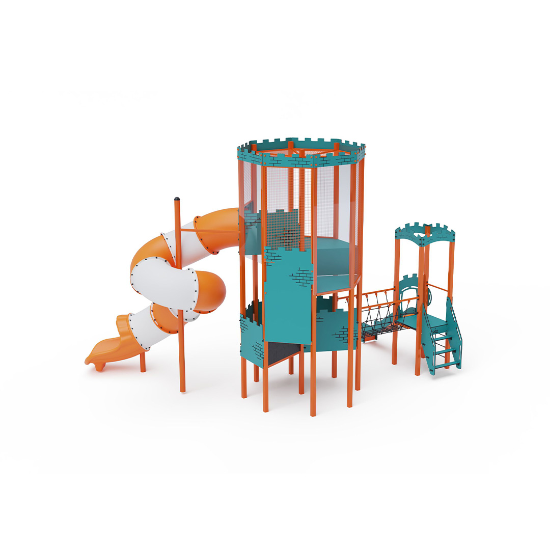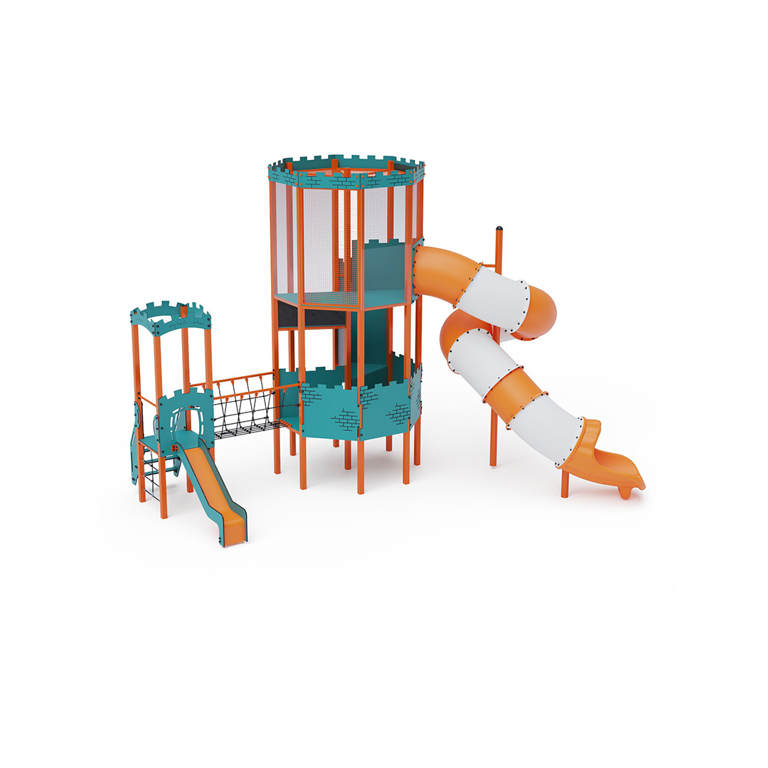Dvojvěžová kombinovaná sestava – věž, na kterou děti vylezou po schodech nebo lanovém výstupu a dolů se mohou spustit po skluzavce nebo tobogánu. Tyrkysovo-oranžový design láká k hraní už z dálky. Ocelová konstrukce je odolná vůči povětrnostním vlivům díky žárovému zinkování a lakování odolnou práškovou barvou. Použitý HPL materiál je chemicky odolný, odolný vůči UV záření – stálobarevný, netoxický, recyklovatelný a nelámavý.