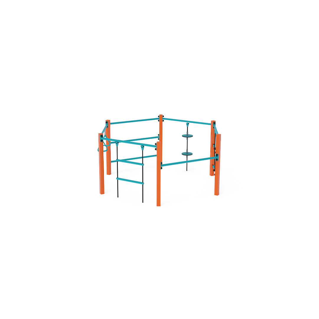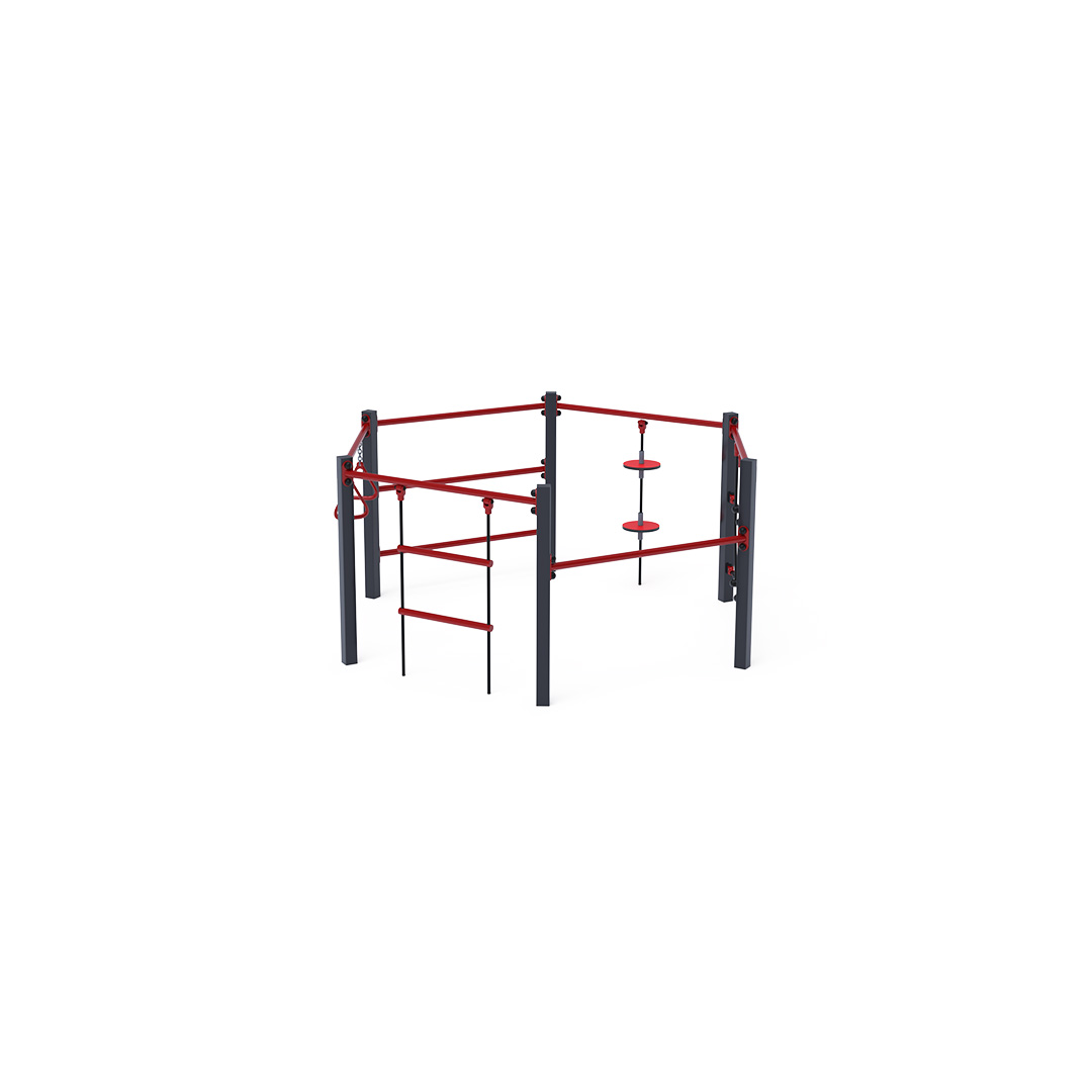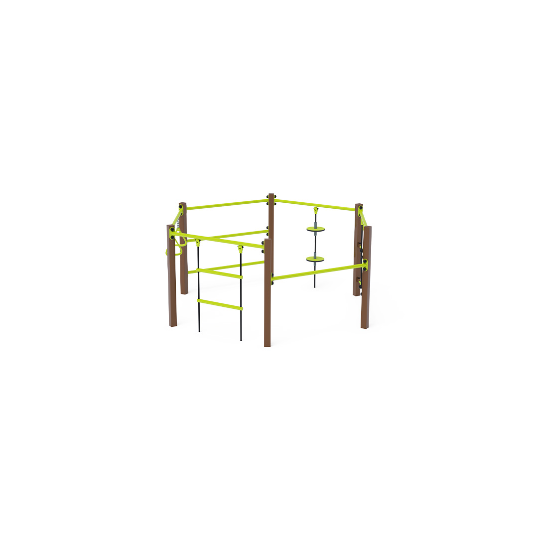 Mini gymcenter je šestiúhelník složený ze žebřiny, atletických kruhů, lana s balančními talíři, lanové lezecké sítě, žebříku a hrazdy. Herní prvek je vyroben z žárově zinkované oceli s kvalitní povrchovou úpravou, spoje jsou nerezové a zakryté plastovými krytkami pro zvýšení bezpečnosti a životnosti spojů. Lana jsou vyrobena z polyesterových vláken, která jsou vinuta okolo jádra. Tato konstrukce lana zvyšuje jeho pevnost a odolnost proti mechanickému namáhání. Samotný polyester má mnoho pozitivních vlastností – je odolný vůči mikroorganismům, povětrnostním vlivům, rychle schne po dešti, je stálobarevný a vyznačuje se vysokou pevností. Mini gymcenter VVZ-MGYM005 je certifikován podle normy ČSN EN 1176.