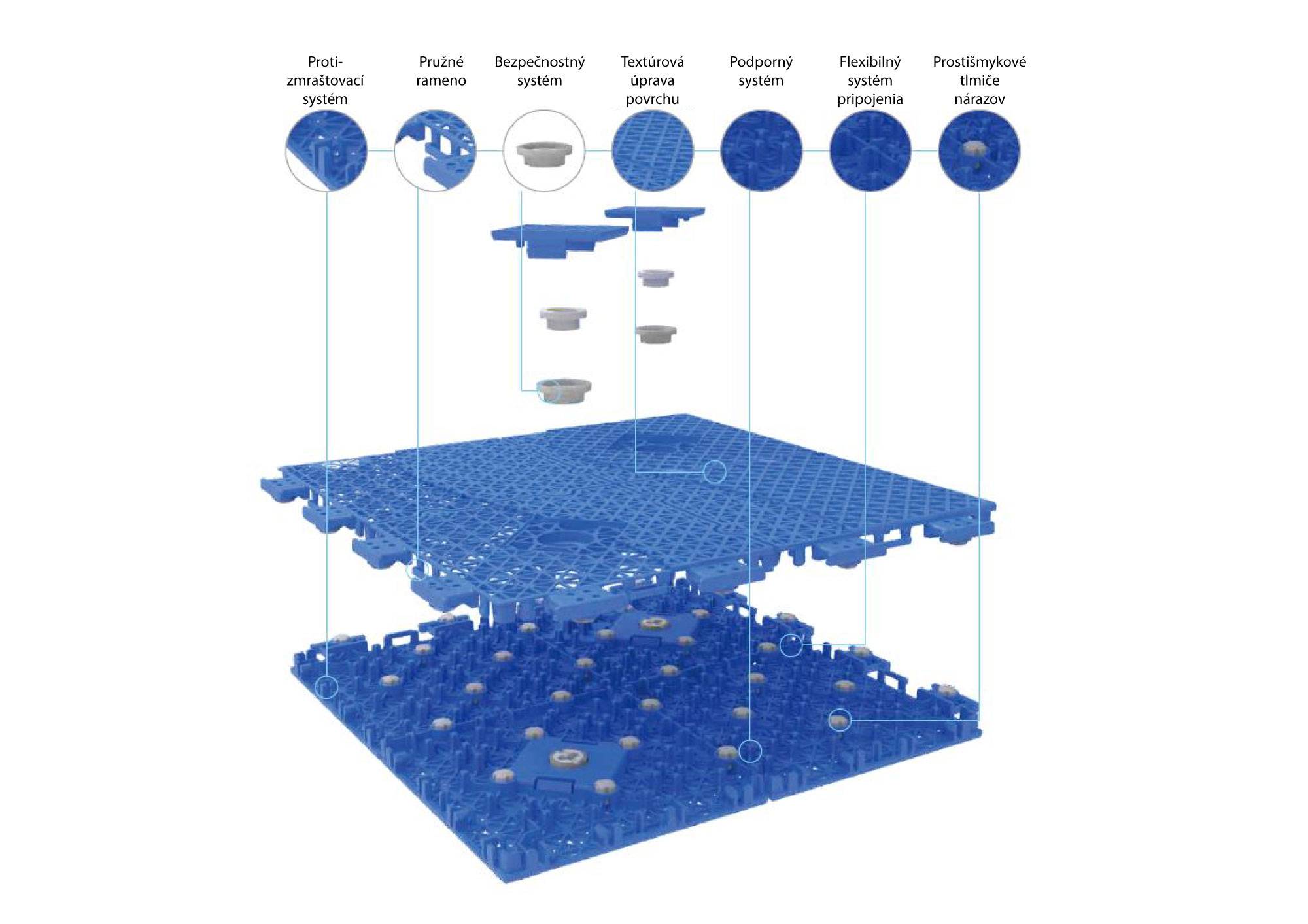 Protizmraštovací systém – segment obsahuje více než 8 souprav šrapnelových a příčných sloupů, aby se zabránilo prasklinám. ukotví pomocí segmentu se speciálním vzorem umožňující pevné kotvení povrchu do spodní plochy. Takové kotvení podlahy zajišťuje lepší tlumení nárazů, větší přesnost při instalaci a bezpečnost proti posunu a krádeži. vhodnější pro aktivní sportování z důvodu šetření kloubů a pohybového ústrojí - 32 ks na segment.