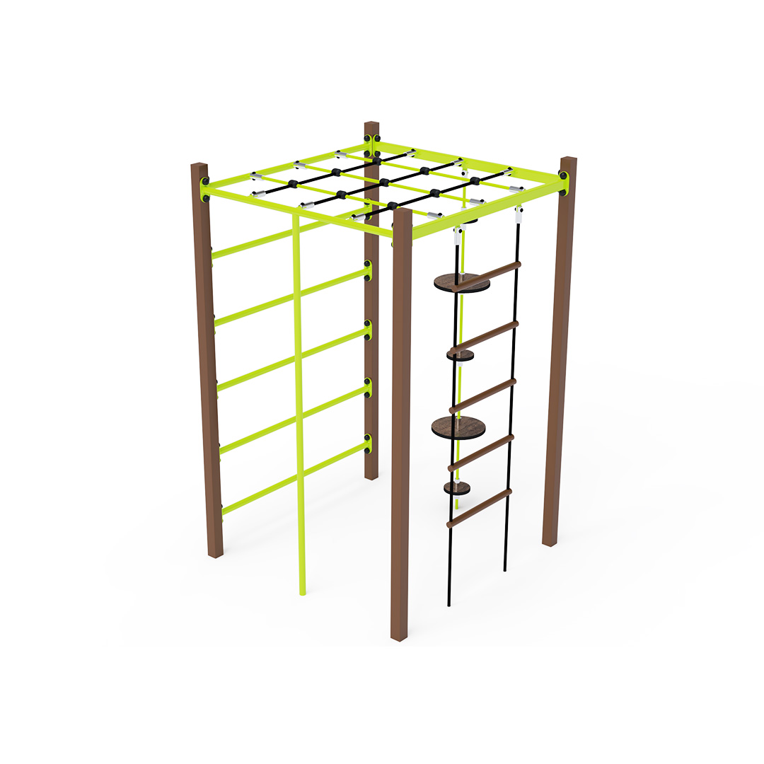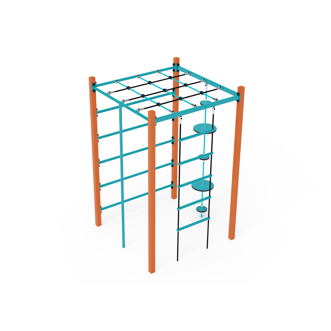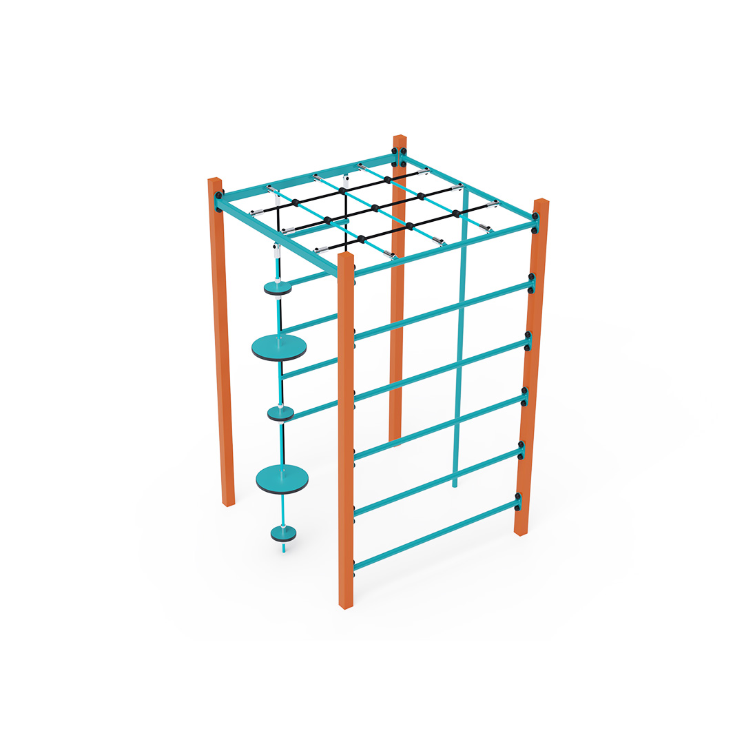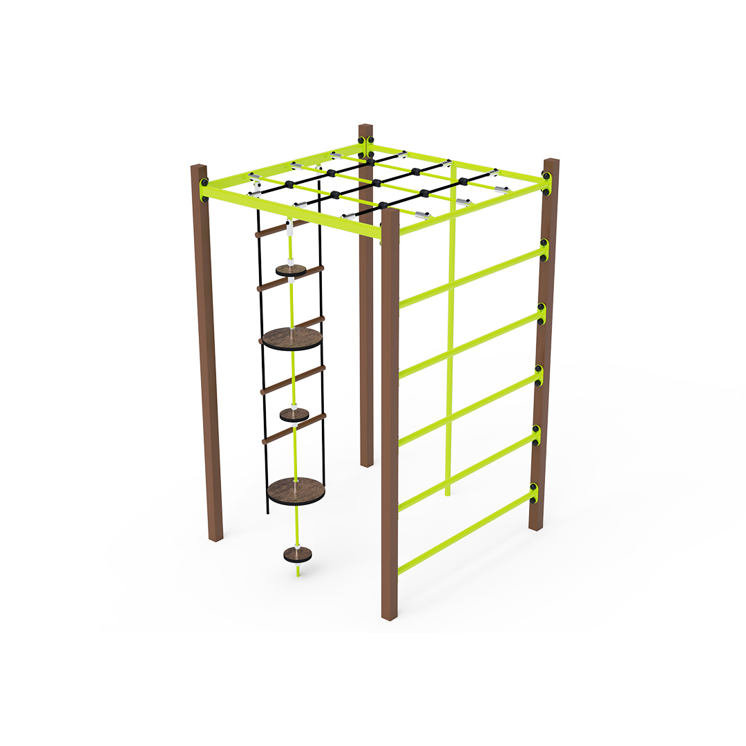 Ocelové gymcentrum, to je kostka s žebříkem, šplhací tyčí, dlouhými žebříky a lanem s balančními talíři. Herní prvek je vyroben ze žárově pozinkované oceli s kvalitní povrchovou úpravou, spoje jsou nerezové a zakryté plastovými krytkami pro zvýšení bezpečnosti a životnosti spojů. Lana jsou vyrobena z polyesterových vláken, která jsou vinutá kolem středu. Tato konstrukce lana zvyšuje jeho pevnost a odolnost proti mechanickému namáhání. Polyester má mnoho kladných vlastností. Je odolný vůči mikroorganismům, povětrnostním vlivům, rychle schne po dešti, je stálobarevný a vyznačuje se vysokou pevností. Ocelové gymcentrum VVZ-GYM002-4 je certifikováno podle normy STN EN 1176.