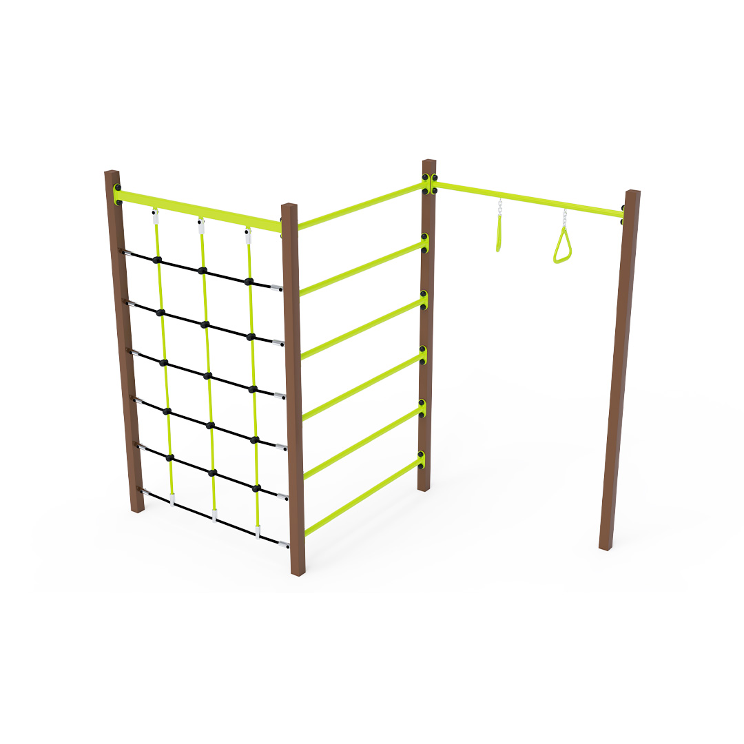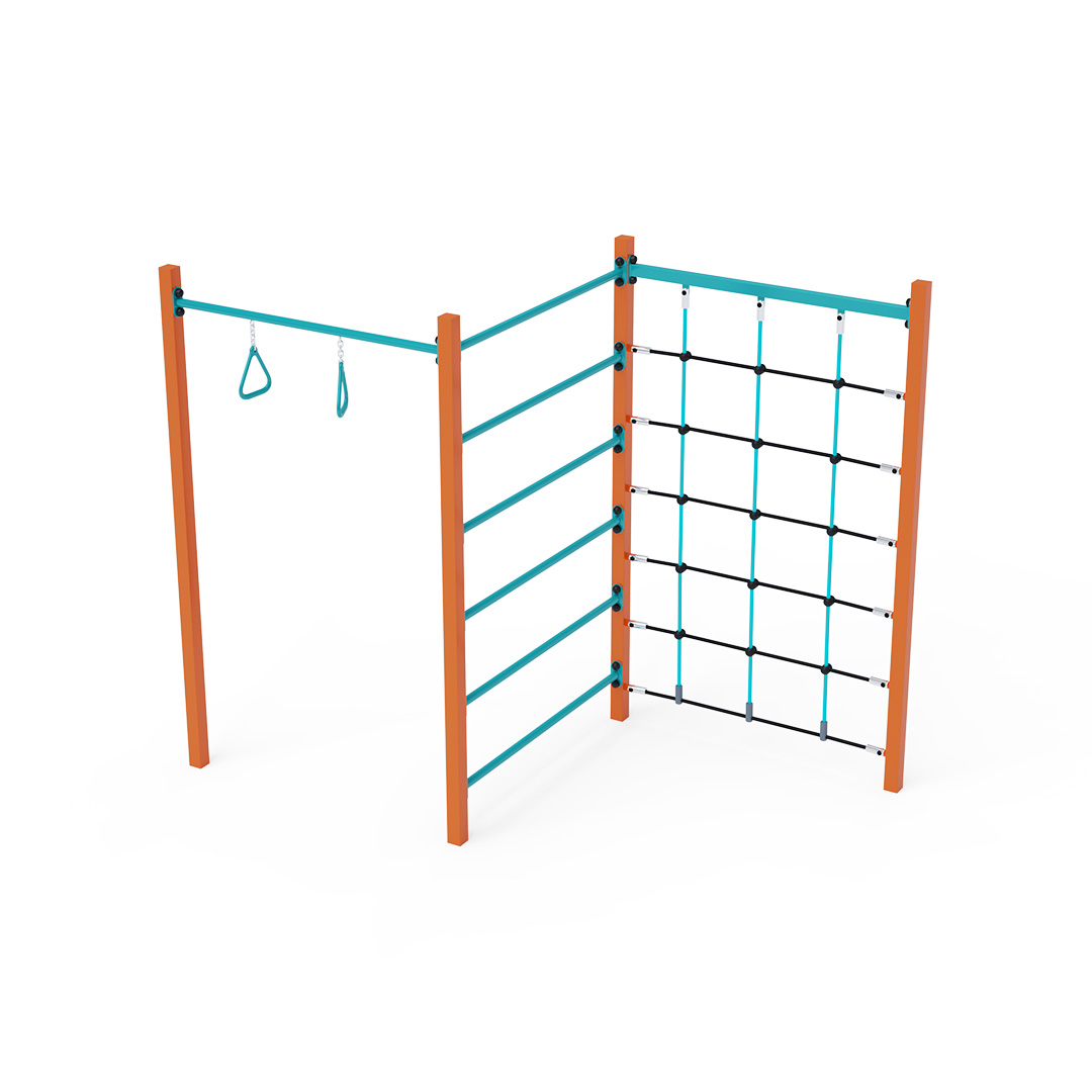 Ocelové gymcentrum složené ze tří různých segmentů – hrazda (ručkovací kruhy), žebřina a lanová síť. Herní prvek je vyroben ze žárově pozinkované oceli s kvalitní povrchovou úpravou, spoje jsou nerezové a zakryté plastovými krytkami pro zvýšení bezpečnosti a životnosti spojů. Lana jsou vyrobena z polyesterových vláken, která jsou navinuta kolem jádra. Tato konstrukce lana zvyšuje jeho pevnost a odolnost vůči mechanickému namáhání. Samotný polyester má mnoho kladných vlastností – je odolný vůči mikroorganismům, povětrnostním vlivům, rychle schne po dešti, je stálobarevný a vyznačuje se vysokou pevností. Ocelové gymcentrum VVZ-GYM005-3 je certifikováno podle normy STN EN 1176. Herní sestava je ukotvena k zemi betonováním konstrukce do betonových patek o rozměru 50x50x50 cm.