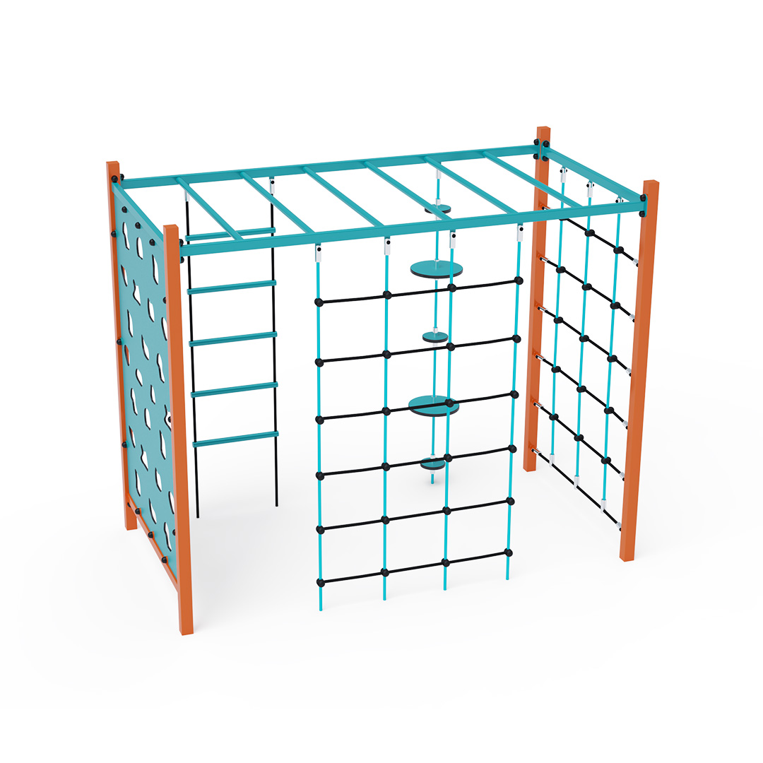 Ocelové gymcentrum složené ze šesti různých segmentů – žebřík, lano s balančními talíři, lanová síť, lezecká síť a horizontální žebřík. Herní prvek je vyroben ze žárově pozinkované oceli s kvalitní povrchovou úpravou, spoje jsou nerezové a zakryté plastovými krytkami pro zvýšení bezpečnosti a životnosti spojů. Lana jsou vyrobena z polyesterových vláken, která jsou navinuta kolem jádra. Tato konstrukce lana zvyšuje jeho pevnost a odolnost vůči mechanickému namáhání. Polyester má mnoho pozitivních vlastností – je odolný vůči mikroorganismům, povětrnostním vlivům, rychle schne po dešti, je stálobarevný a vyznačuje se vysokou pevností. Ocelové gymcentrum VVZ-GYM006-1 je certifikováno podle normy STN EN 1176. Herní sestava je ukotvena k zemi betonováním konstrukce do betonových patek o rozměru 50x50x50 cm.