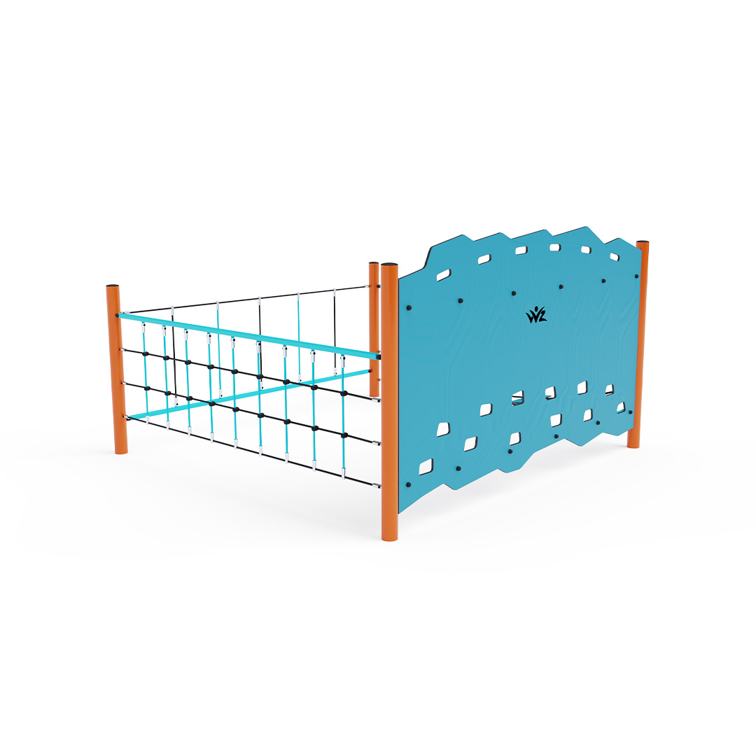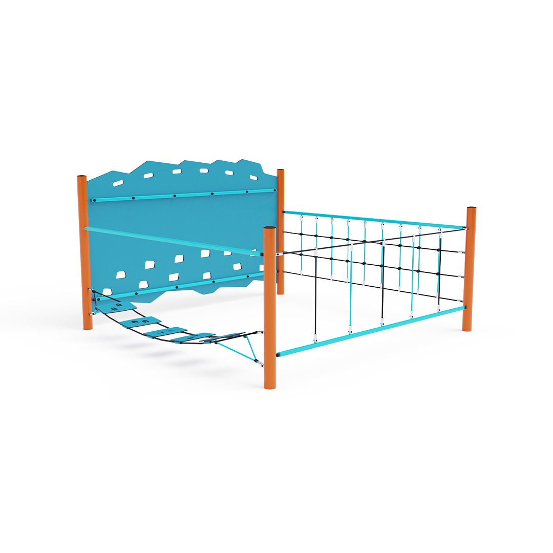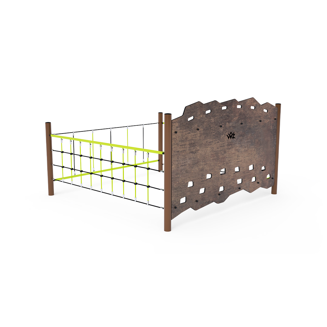 stran. Část je vytvořena svislou lanovou sítí a prověří sílu rukou každého dítěte. Část vytvořená svislou stěnou. Část vytvořená balančními nášlapy z HPL, které nejen vytrénují dětský balanc, ale také naučí děti jaké stopy zanechávají různá zvířata. Herní prvek je vyroben ze žárově zinkované oceli s kvalitní povrchovou úpravou, spoje jsou nerezové a zakryté plastovými krytkami pro zvýšení bezpečnosti a životnosti spojů. Lana jsou vyrobena z polyesterových vláken, která jsou vinuta kolem středu. Tato konstrukce lana zvyšuje jeho pevnost a odolnost proti mechanickému namáhání. Samotný polyester má spoustu kladných vlastností. Je odolný vůči mikroorganismům, povětrnostním vlivům, rychle schne po dešti, je stálobarevný a vyznačuje se vysokou pevností.