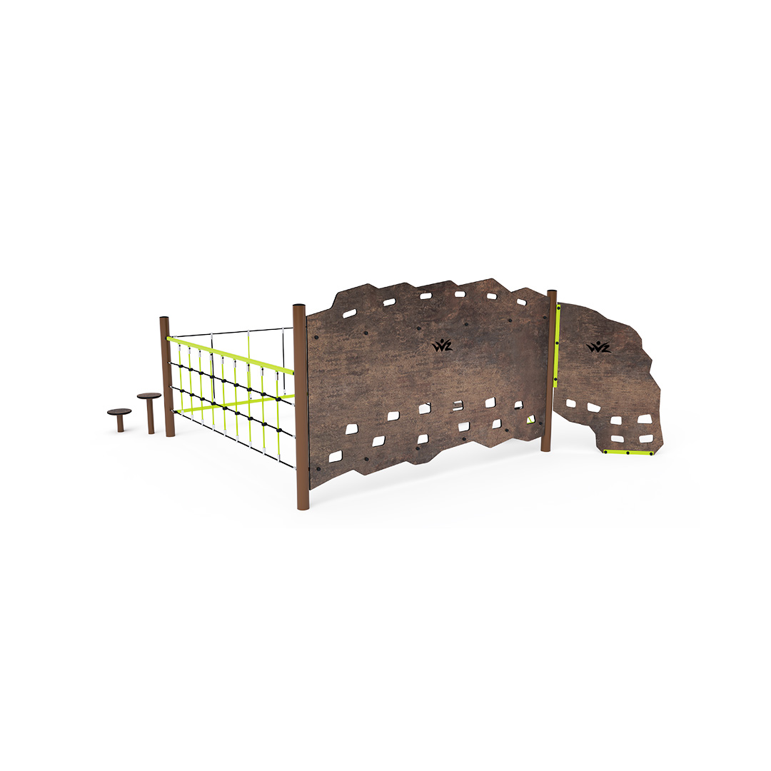 stran. Část je vytvořena svislou lanovou sítí a prověří sílu rukou každého dítěte. Část vytvořená svislou stěnou. Část vytvořená balančními nášlapy z HPL, které nejen vytrénují dětský balanc, ale také naučí děti jaké stopy zanechávají různá zvířata. Herní prvek je vyroben ze žárově zinkované oceli s kvalitní povrchovou úpravou, spoje jsou nerezové a zakryté plastovými krytkami pro zvýšení bezpečnosti a životnosti spojů. Lana jsou vyrobena z polyesterových vláken, která jsou vinuta kolem středu. Tato konstrukce lana zvyšuje jeho pevnost a odolnost proti mechanickému namáhání. Samotný polyester má spoustu kladných vlastností. Je odolný vůči mikroorganismům, povětrnostním vlivům, rychle schne po dešti, je stálobarevný a vyznačuje se vysokou pevností.