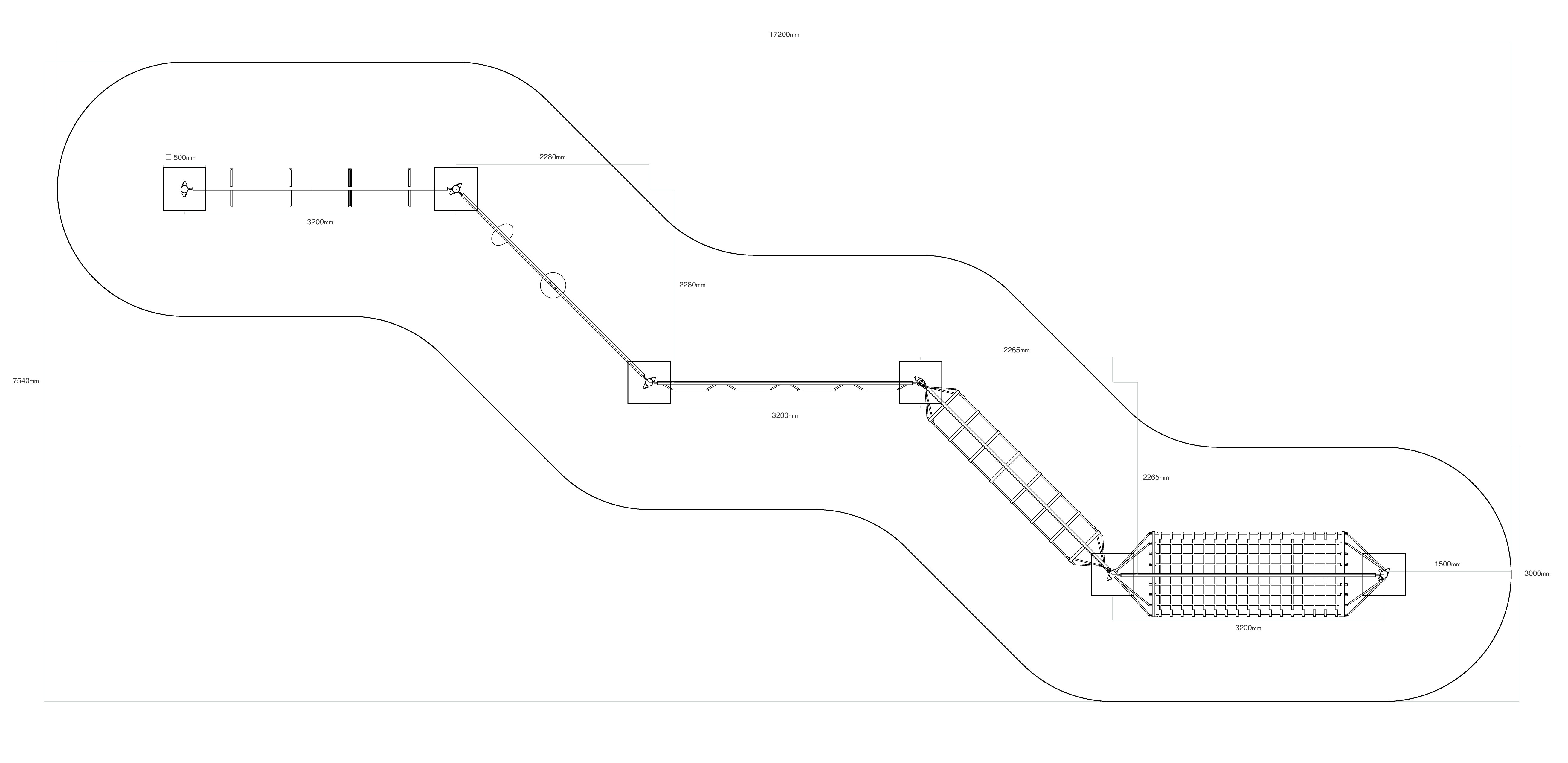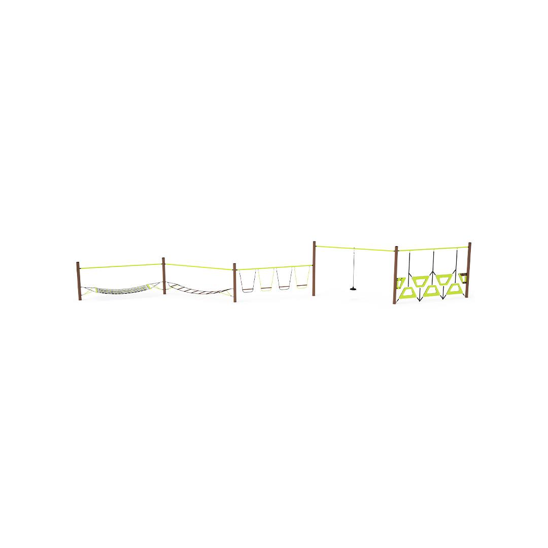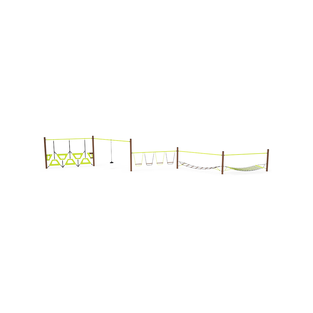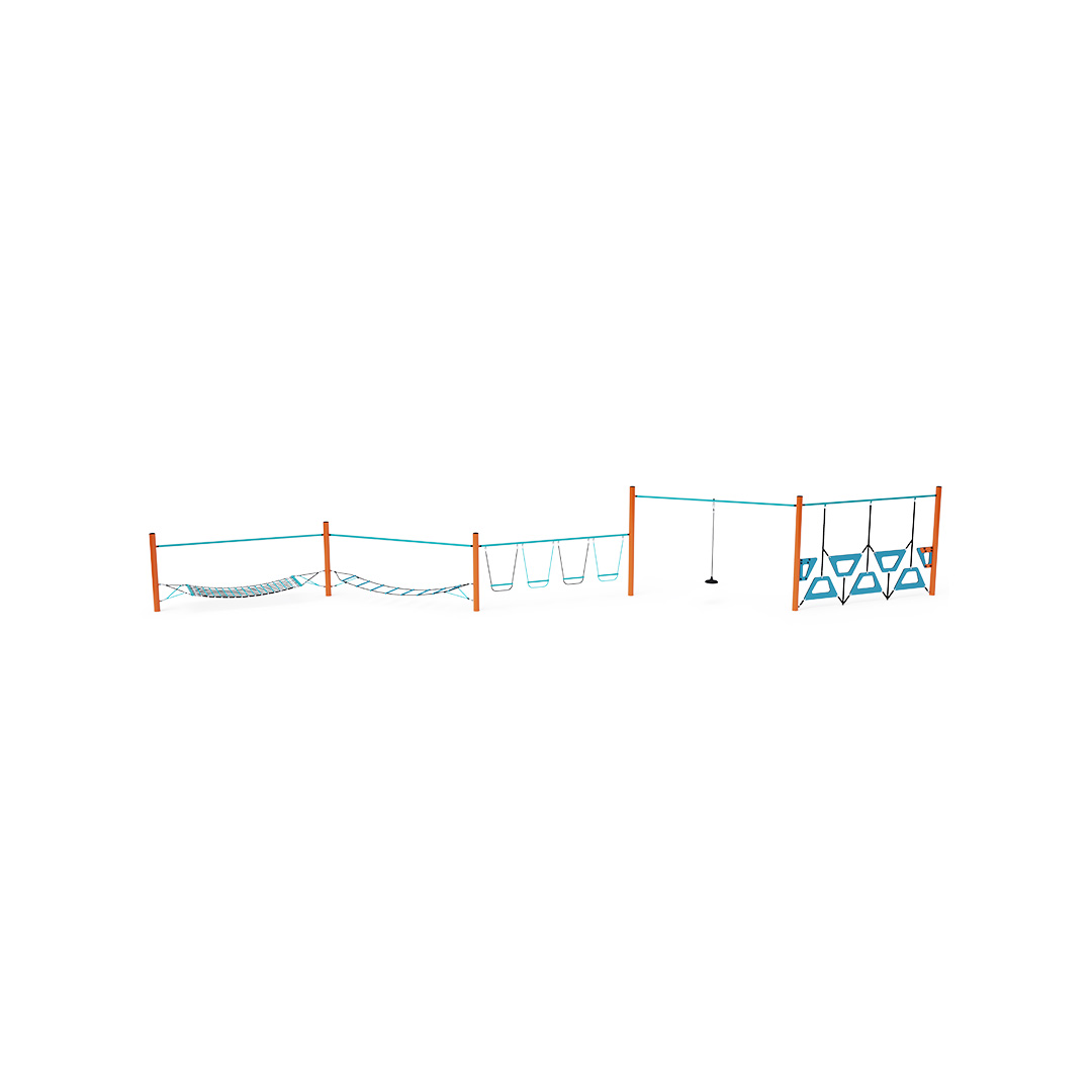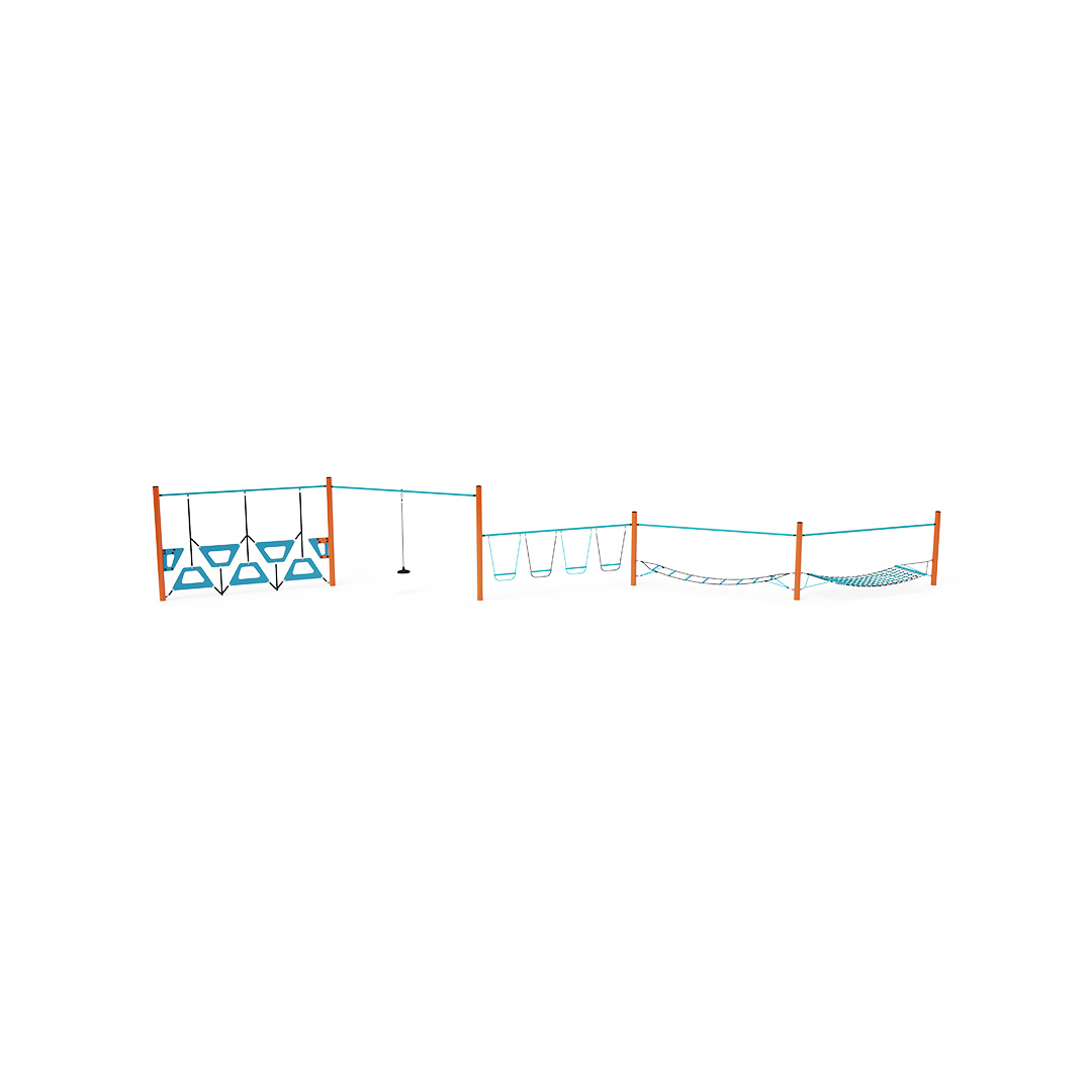Opičí dráha vytvořená kombinací pěti částí - lichoběžníková stěna, volně visící lano, zavěšené houpací stoupačky, balanční žebřík a lanová síť. Herní prvek je vyroben ze zinkované oceli s kvalitní povrchovou úpravou - práškovým lakováním, spoje jsou nerezové a zakryté plastovými krytkami pro zvýšení bezpečnosti a životnosti spojů. Lana jsou vyrobena z polyesterových vláken s ocelovým jádrem, které jsou vinuty kolem středu. Tato konstrukce lana zvyšuje jeho pevnost a odolnost proti mechanickému namáhání. Samotný polyester má spoustu kladných vlastností. Je odolný vůči mikroorganismům, povětrnostním vlivům, rychle schne po dešti, je stálobarevný a vyznačuje se vysokou pevností.