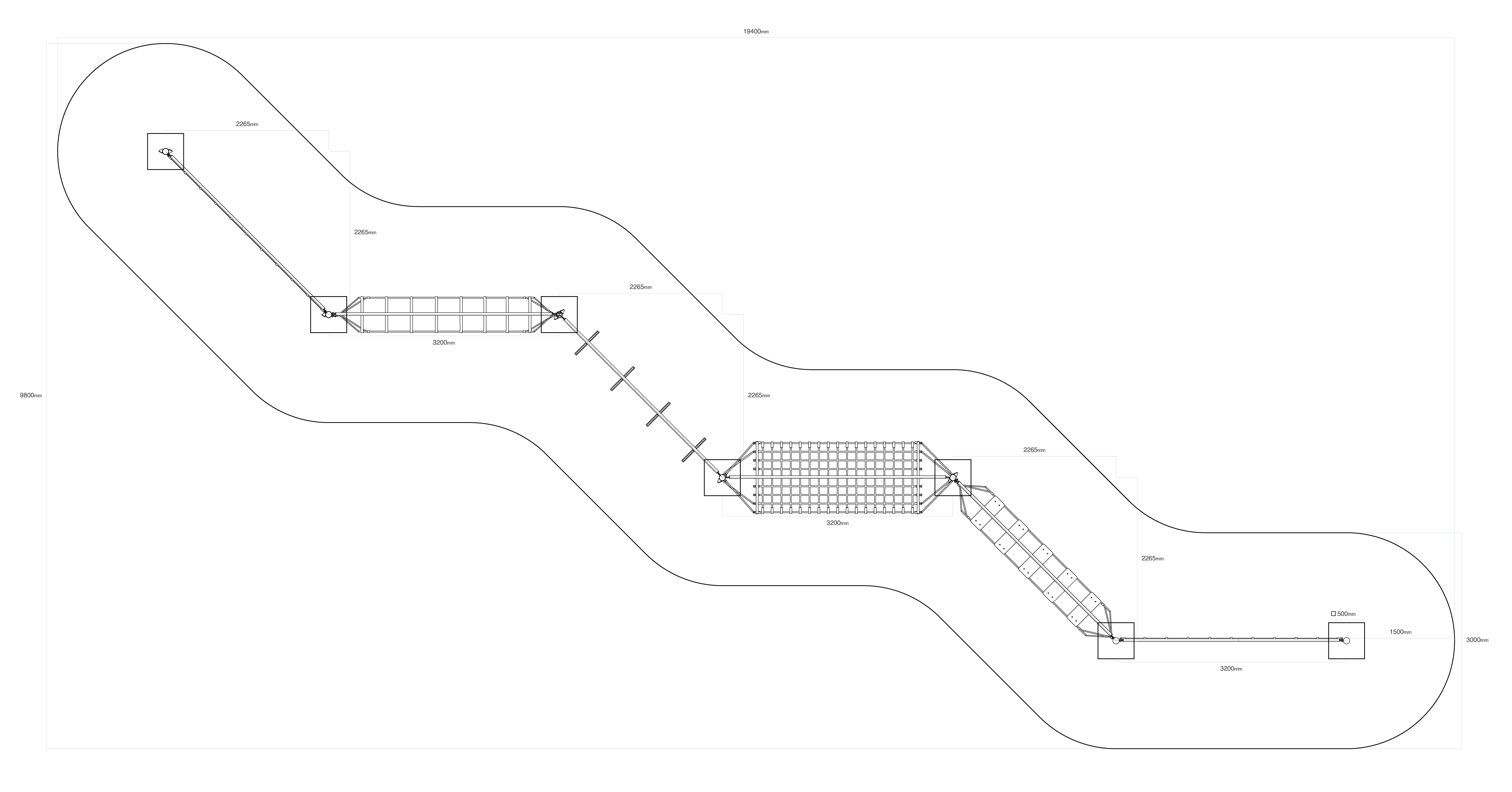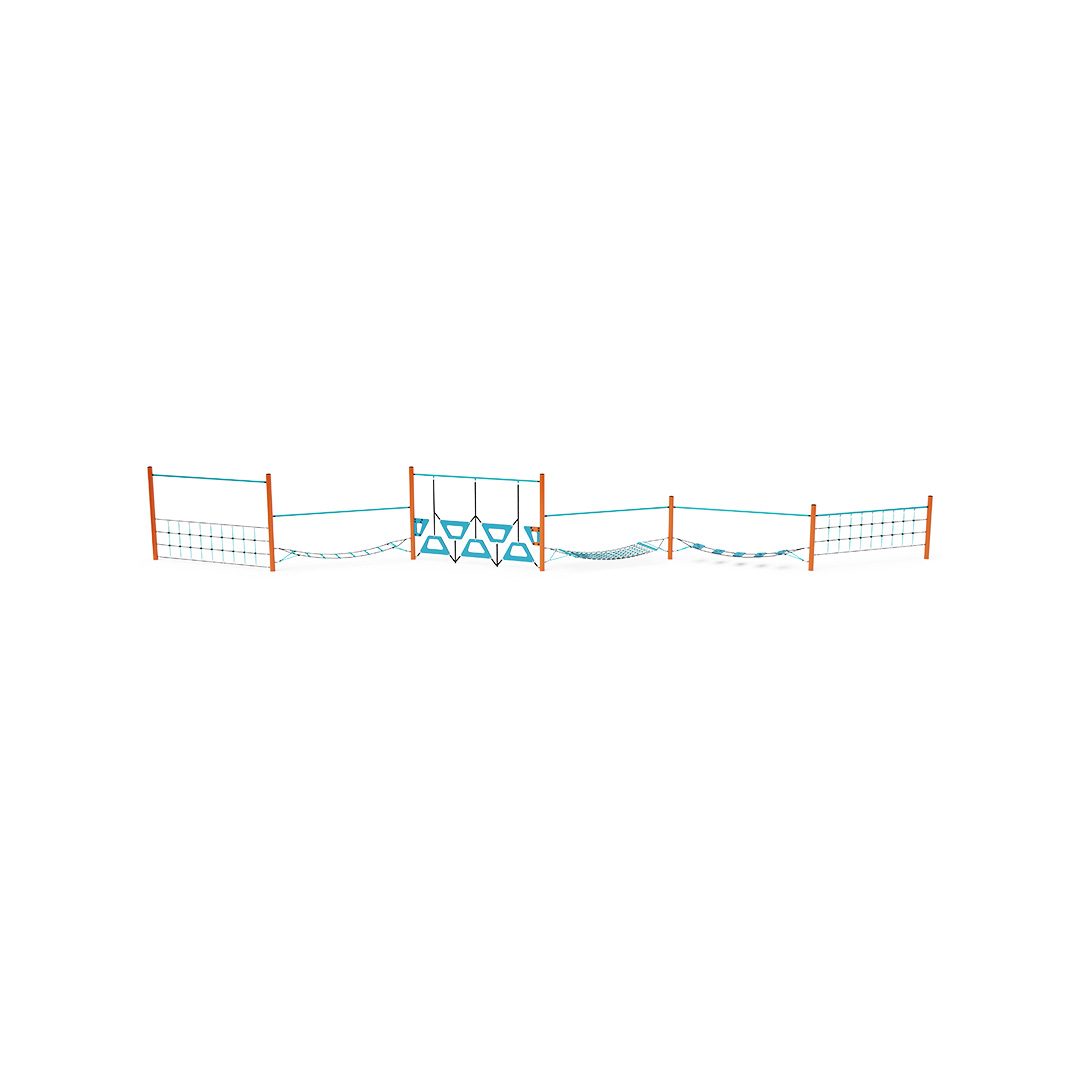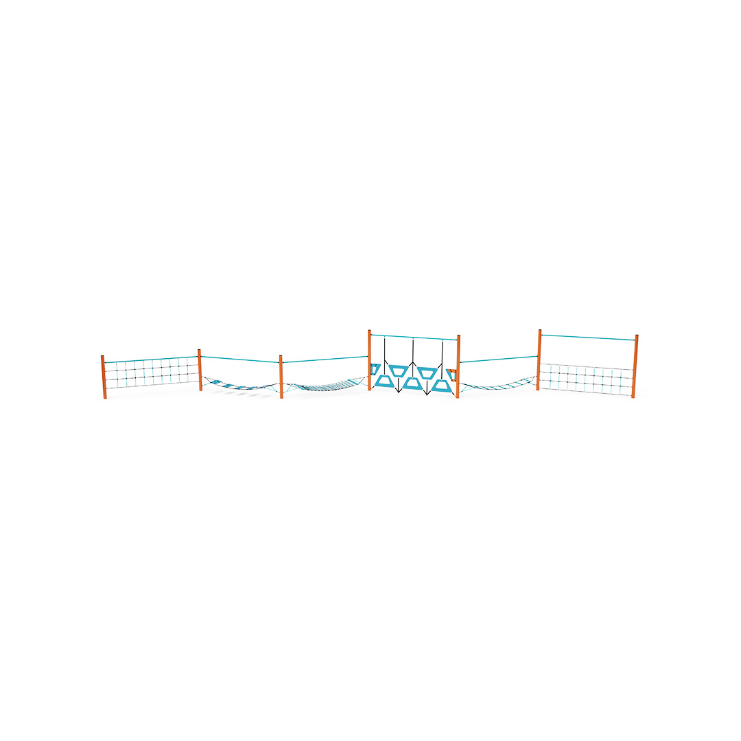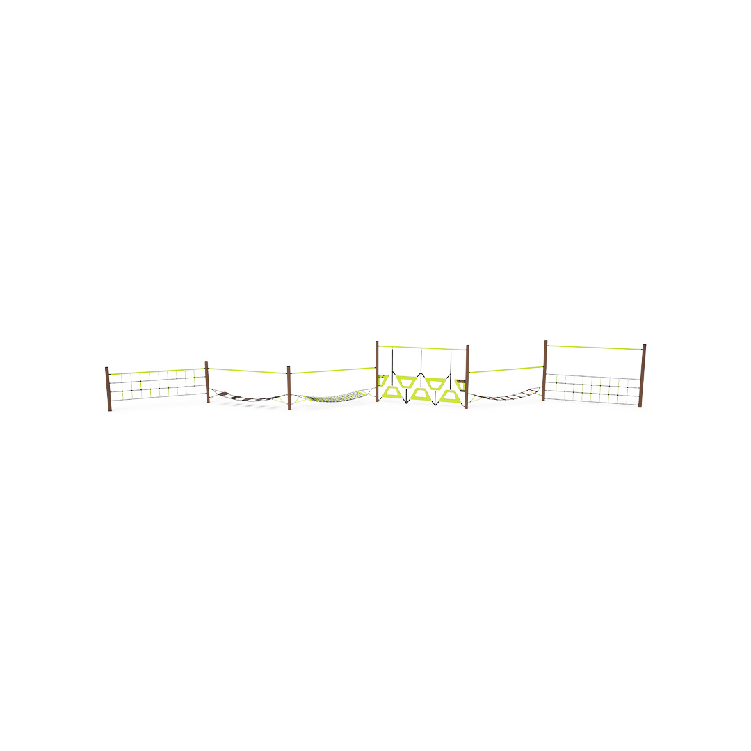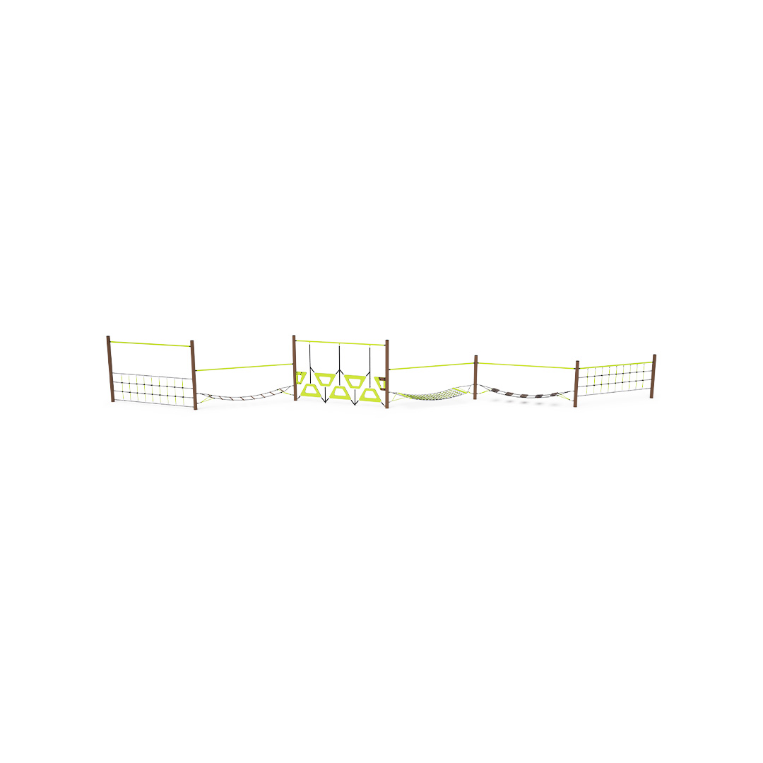 Opičí dráha vytvořená kombinací šesti částí - Horizontální lanová síť, tematické balanční nášlapy, houpací síť, lichoběžníková stěna, balanční žebřík a horizontální síť s pomocnou tyčí. Herní prvek je vyroben ze zinkované oceli s kvalitní povrchovou úpravou - práškovým lakováním, spoje jsou nerezové a zakryté plastovými krytkami pro zvýšení bezpečnosti a životnosti spojů. Lana jsou vyrobena z polyesterových vláken s ocelovým jádrem, které jsou vinuty kolem středu. Tato konstrukce lana zvyšuje jeho pevnost a odolnost proti mechanickému namáhání. Samotný polyester má spoustu kladných vlastností. Je odolný vůči mikroorganismům, povětrnostním vlivům, rychle schne po dešti, je stálobarevný a vyznačuje se vysokou pevností.