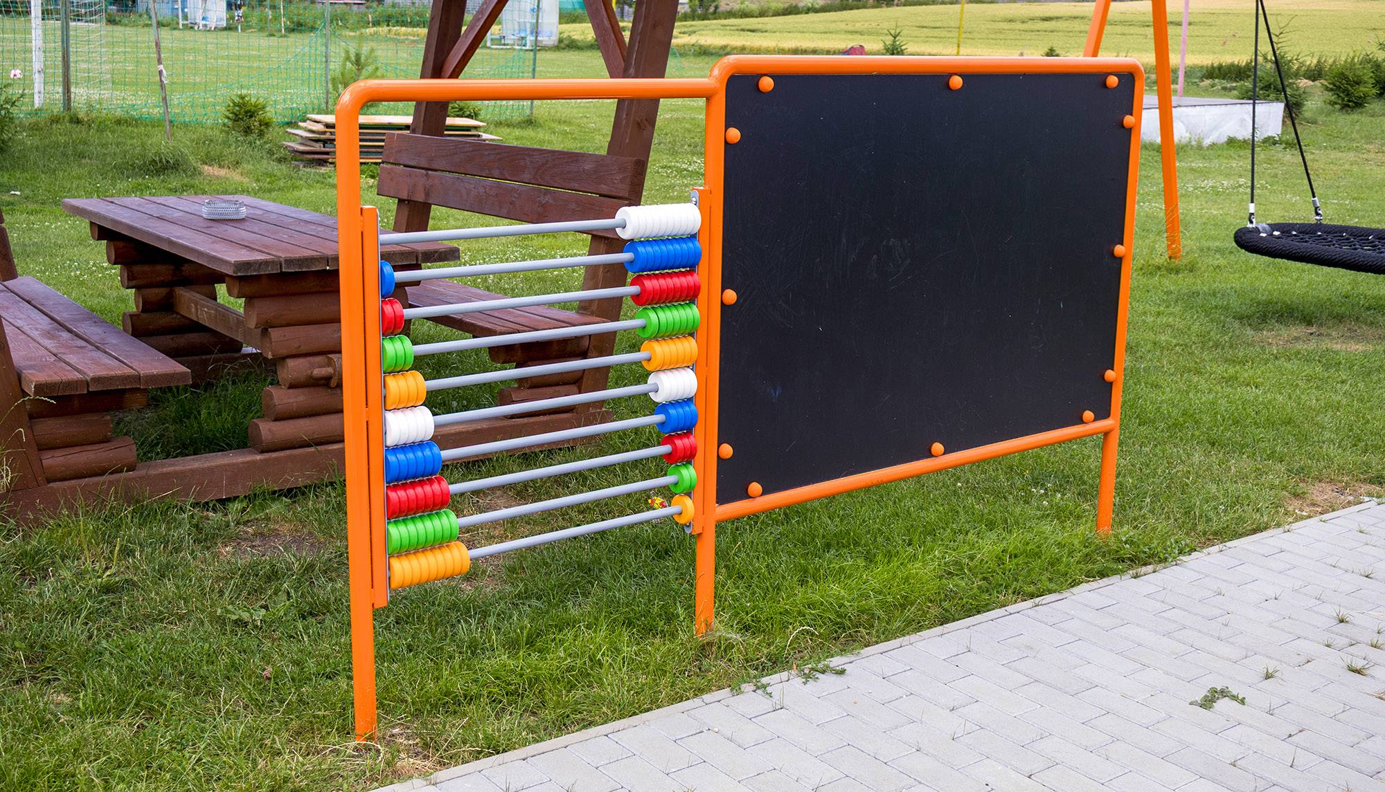 Třetí součástí hřiště je edukativní panel, který propojuje zábavu s učením. Děti si mohou kreslit a naučit se základy matematiky pomocí našeho barevného počítadla.