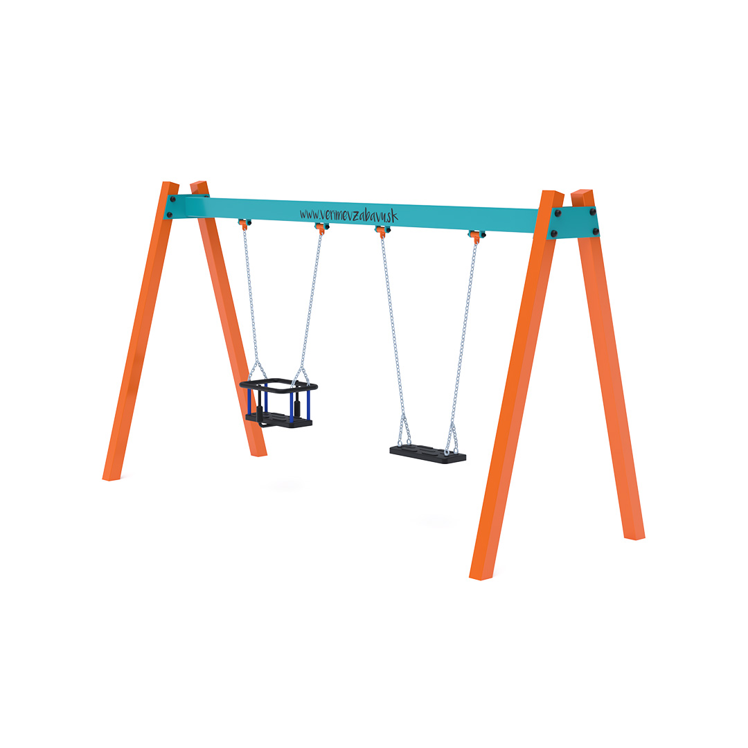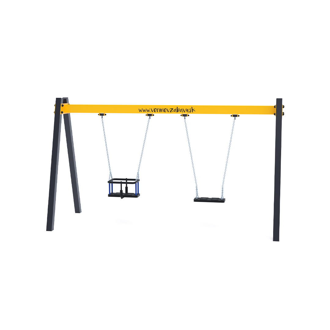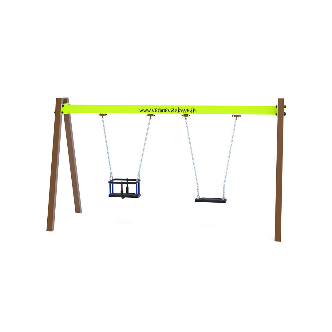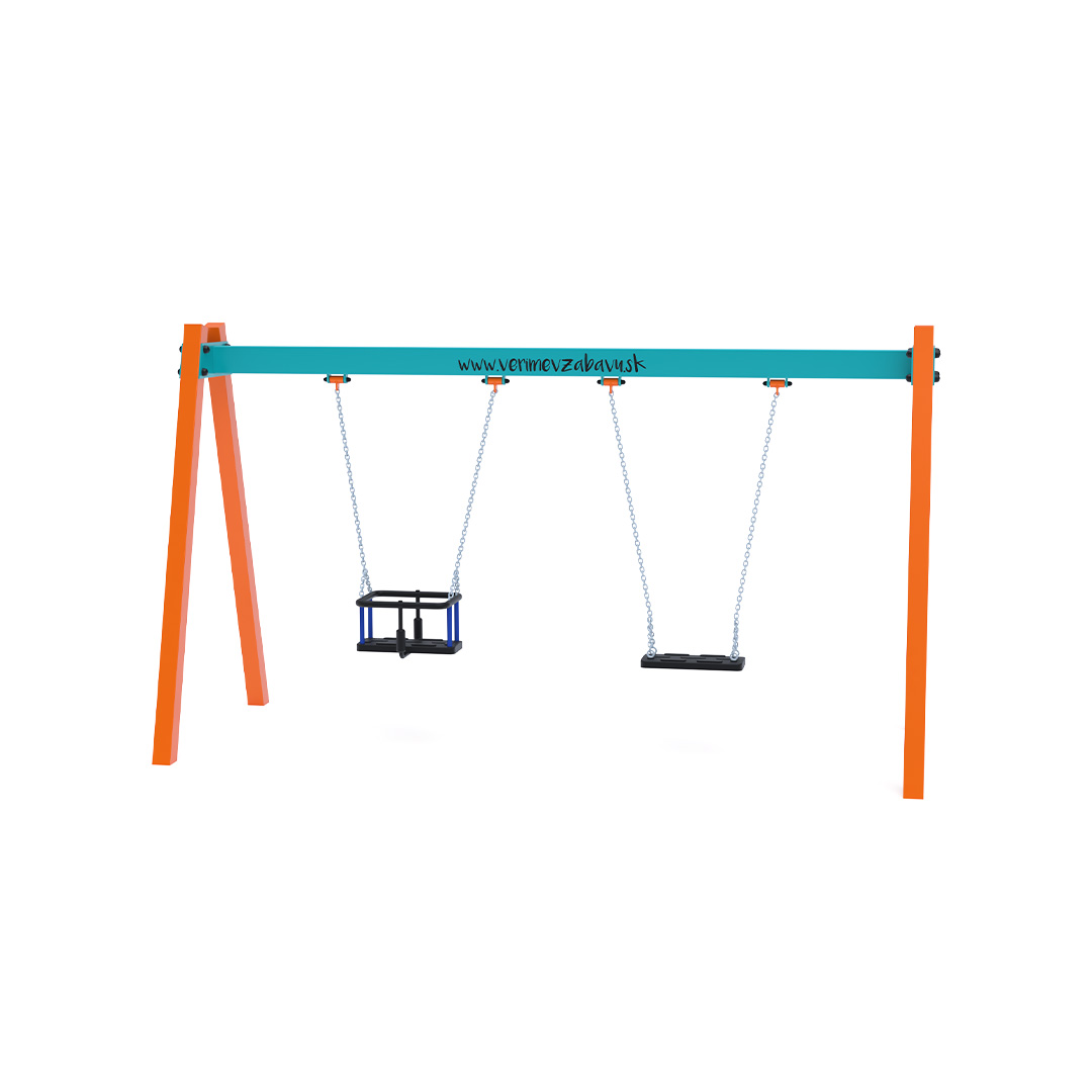 Závěsná dvouhoupačka s jedním klasickým a jedním dětským (baby) sedákem je vyrobena z žárově zinkované oceli, která je upravena práškovou vypalovací barvou. Spojovací materiály jsou z nerezové oceli a jsou zakryty plastovými krytkami pro zvýšení životnosti a bezpečnosti. Houpačka VVZ-VH007 je certifikována dle normy ČSN EN 1176. Jako dopadovou plochu doporučujeme použít zatravňovací rohož.
