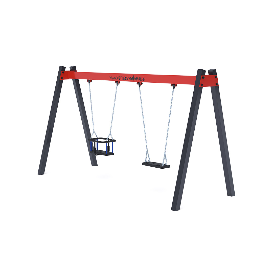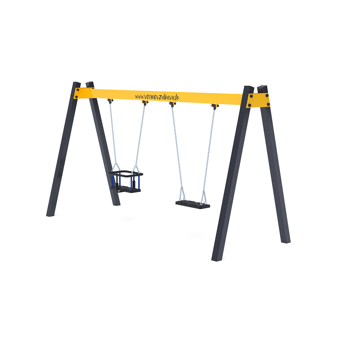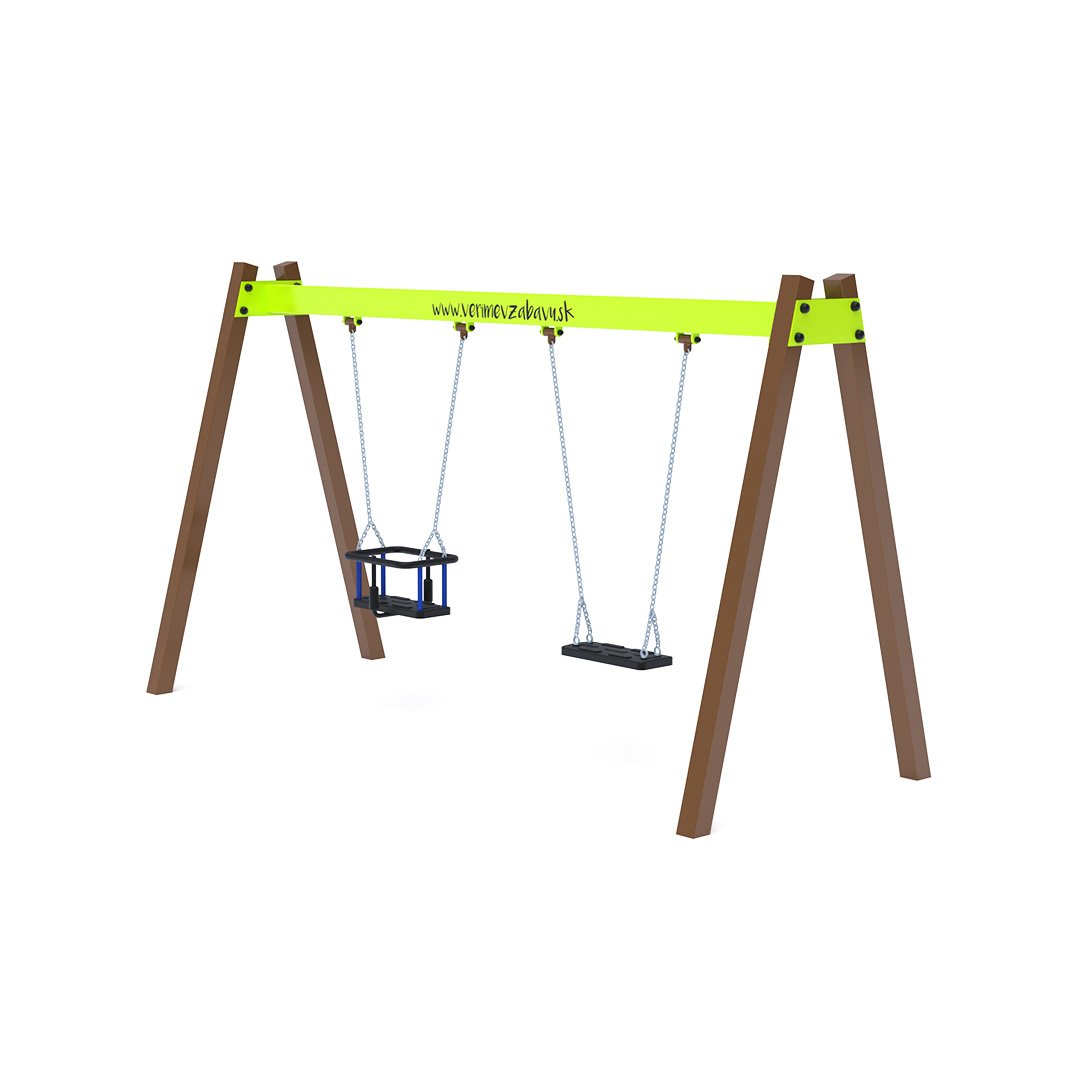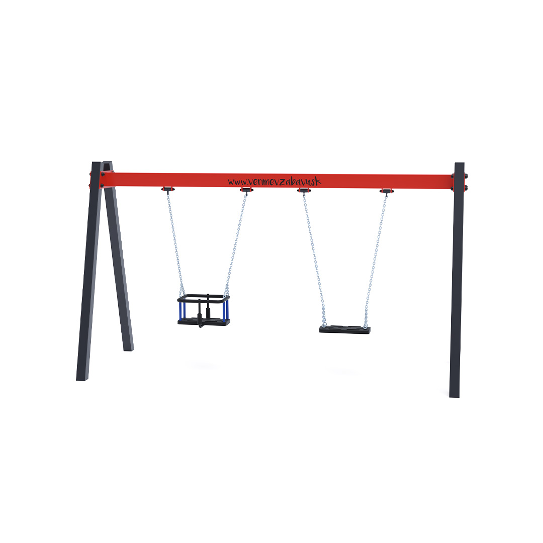 Závěsná dvouhoupačka s jedním klasickým a jedním dětským (baby) sedákem je vyrobena z žárově zinkované oceli, která je upravena práškovou vypalovací barvou. Spojovací materiály jsou z nerezové oceli a jsou zakryty plastovými krytkami pro zvýšení životnosti a bezpečnosti. Houpačka VVZ-VH007 je certifikována dle normy ČSN EN 1176. Jako dopadovou plochu doporučujeme použít zatravňovací rohož.