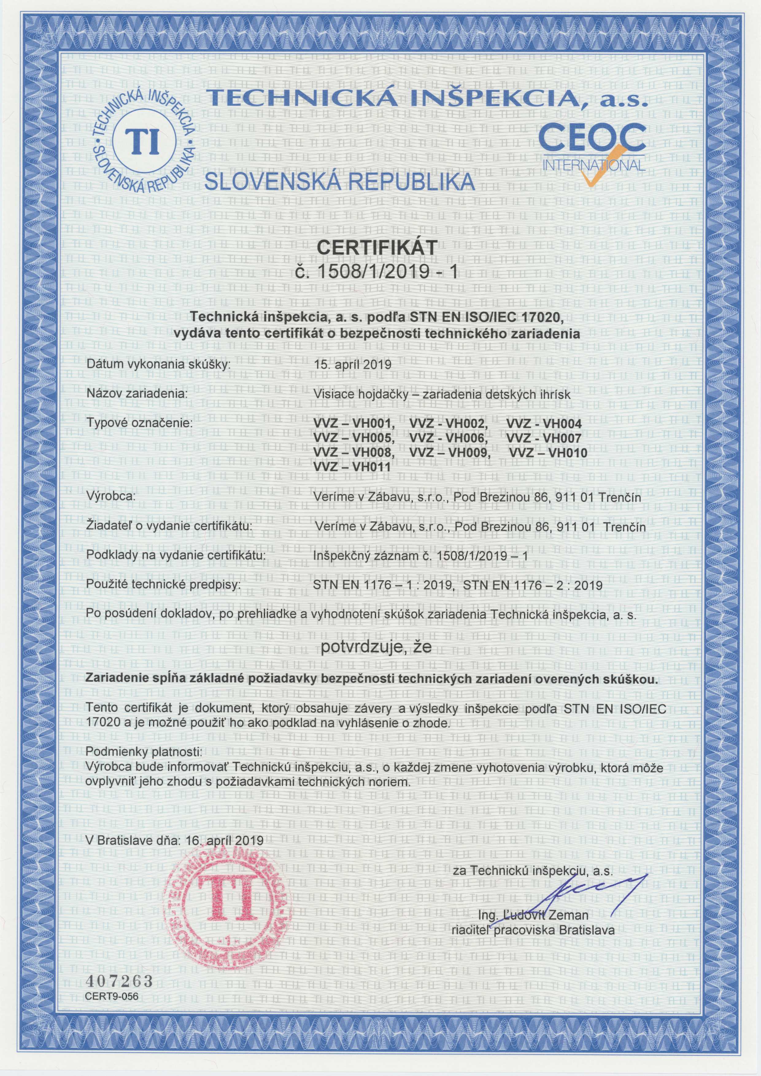 Všechny naše prvky v nabídce prošly kontrolou Technické inspekce a.s., podle příslušné normy, což dokazují i certifikáty které můžete najít na webu u každého produktu. Přestože jsou všechny naše výrobky schváleny Technickou inspekcí a.s., nejpřísnějšími kontrolory jsou pro nás ti, kteří se na cestu za zábavou vydají – a nejsou to jen děti.