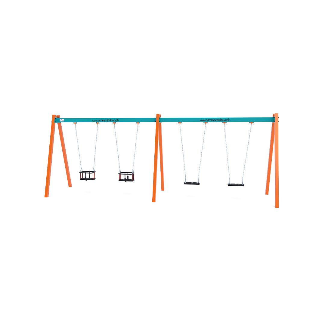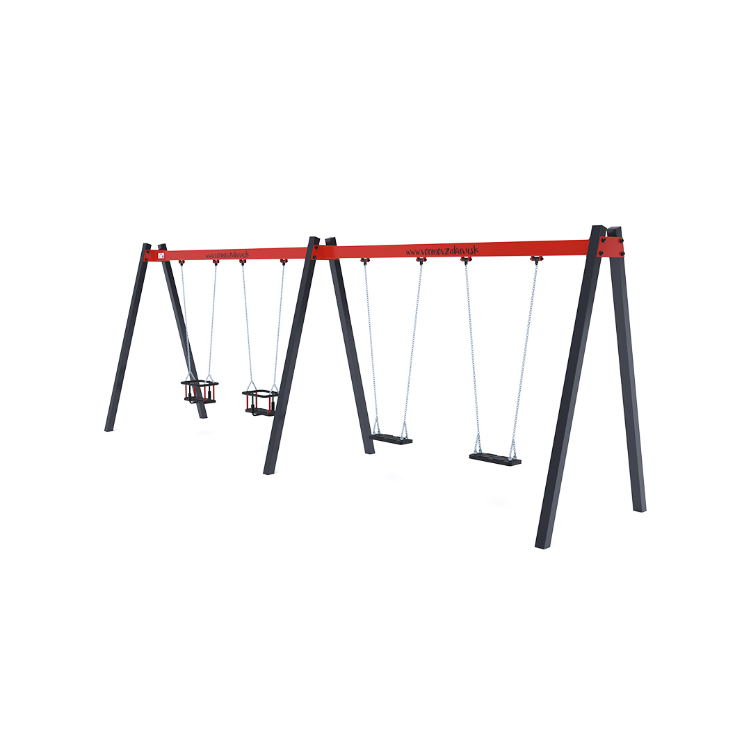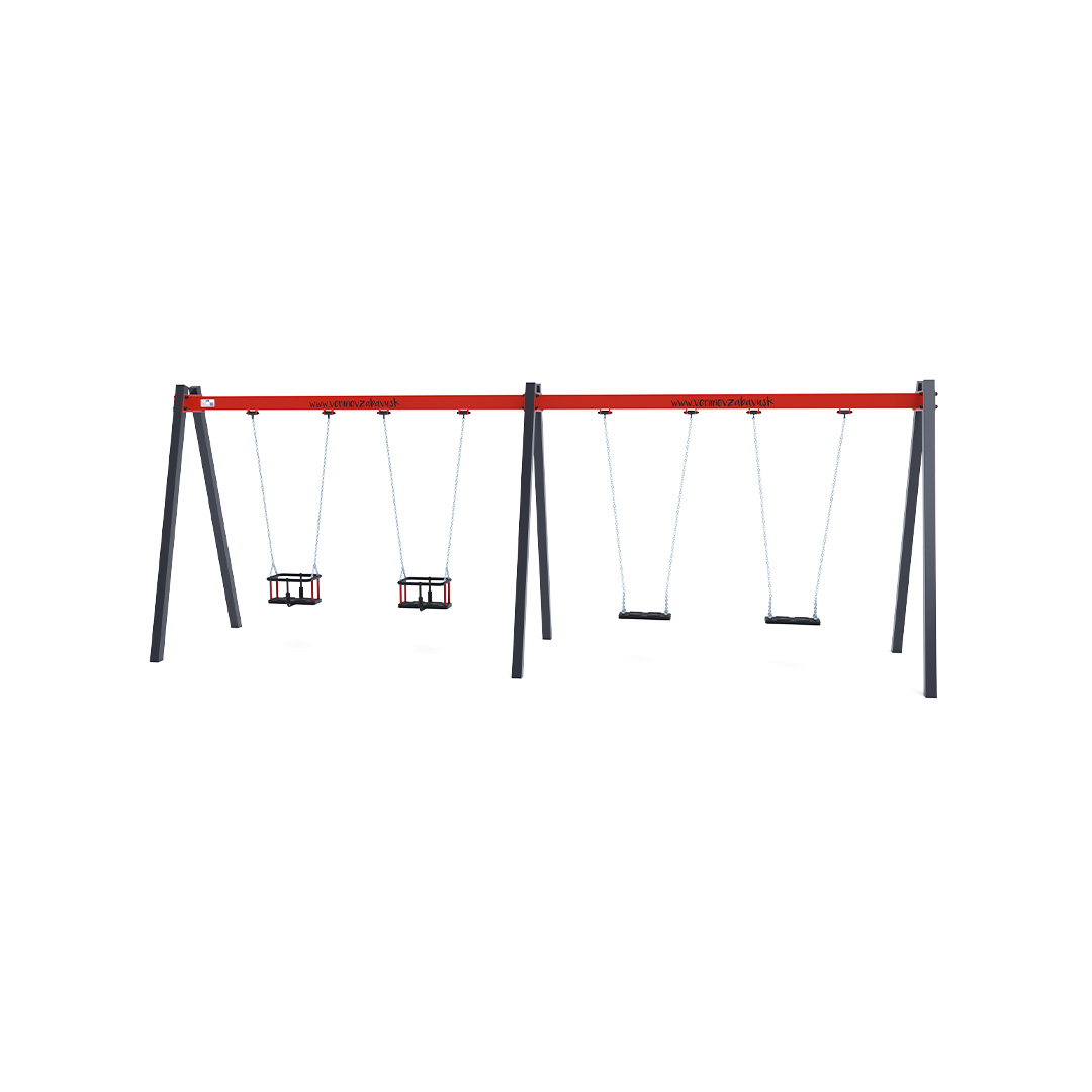 Visící čtyřhoupačka se sedáky v konfiguraci 2x klasický a 2x dětský sedák je vyrobena z žárově zinkované oceli, která je povrchově upravena práškovým vypalovaným lakem. Spojovací materiály jsou nerezové a zakryté plastovými krytkami pro zvýšení životnosti a bezpečnosti.