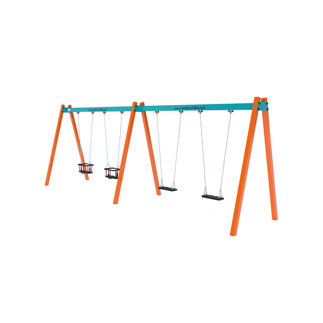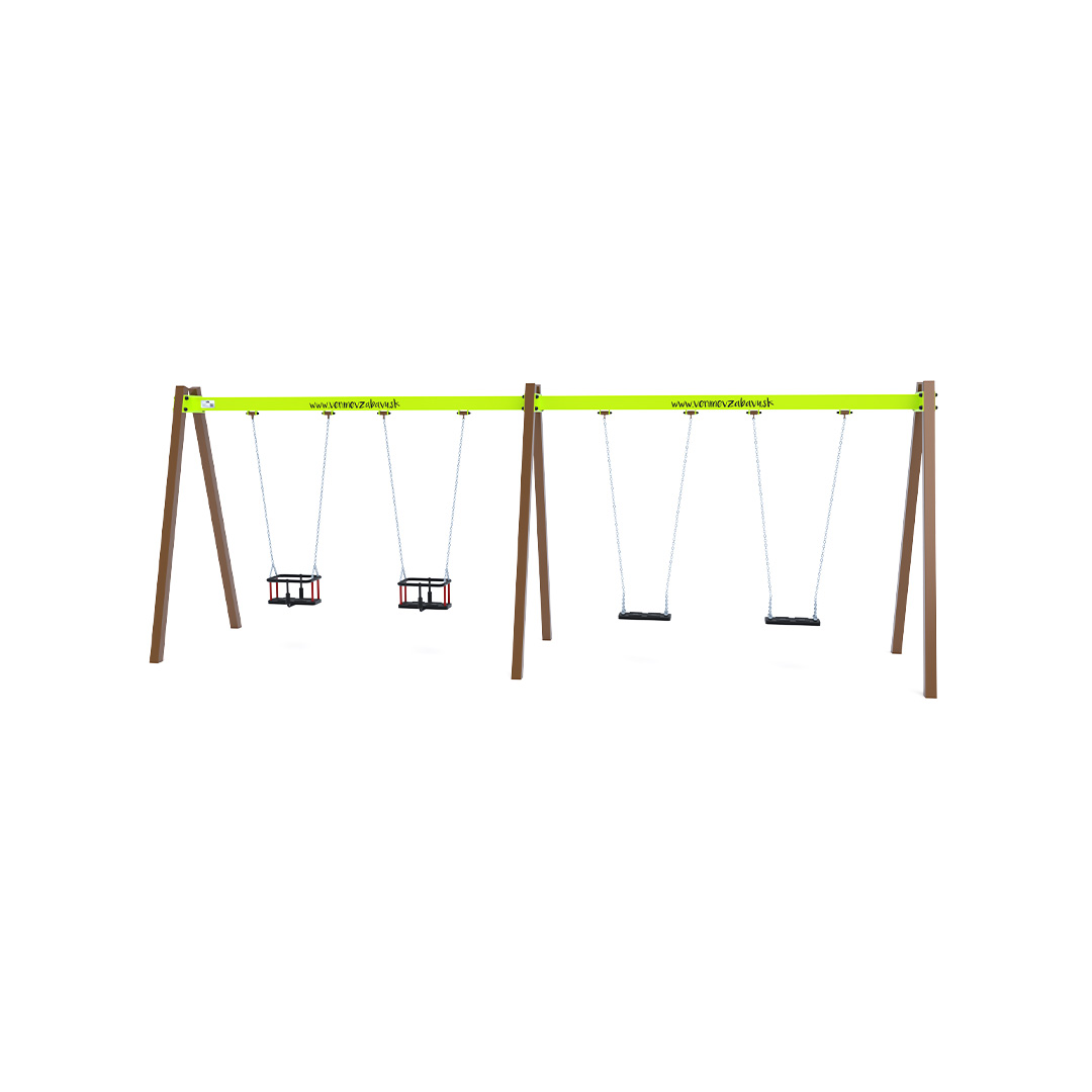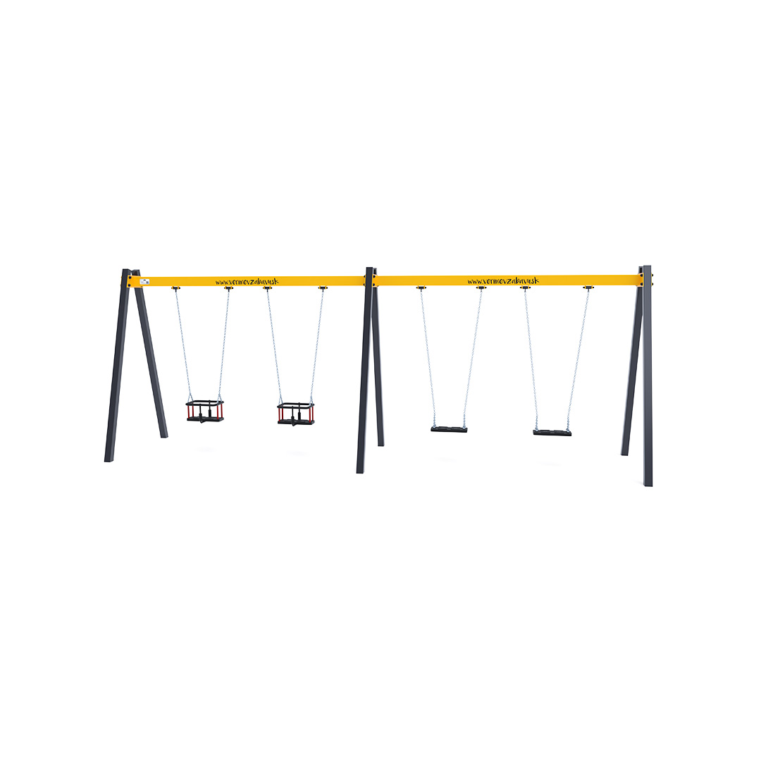 Visící čtyřhoupačka se sedáky v konfiguraci 2x klasický a 2x dětský sedák je vyrobena z žárově zinkované oceli, která je povrchově upravena práškovým vypalovaným lakem. Spojovací materiály jsou nerezové a zakryté plastovými krytkami pro zvýšení životnosti a bezpečnosti.