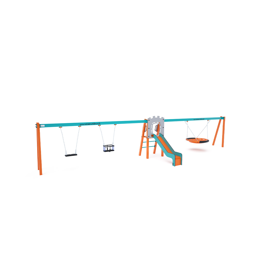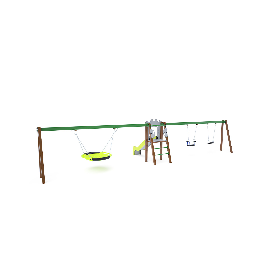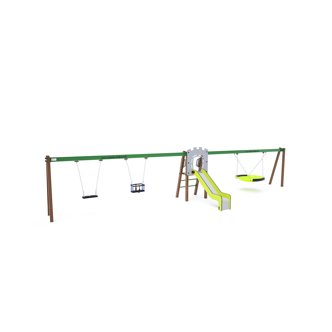 Certifikovaná bezúdržbová věž ve tvaru A s žebříkovým výlezem a skluzavkou, doplněná dvěma visícími houpadly. Na jedné straně je klasický a dětský sedák, na druhé straně houpací hnízdo. Dětský sedák pro dítě obsahuje ohrádku s příčkou mezi nohama dítěte, která zabraňuje sklouznutí nebo pádu dítěte. Zároveň se dítě může opřít. Houpací hnízdo je vhodné pro houpačku malých dětí vleže nebo pro více dětí najednou. Hnízdo má bezpečnostní závěs s pojistnou řetízkou.