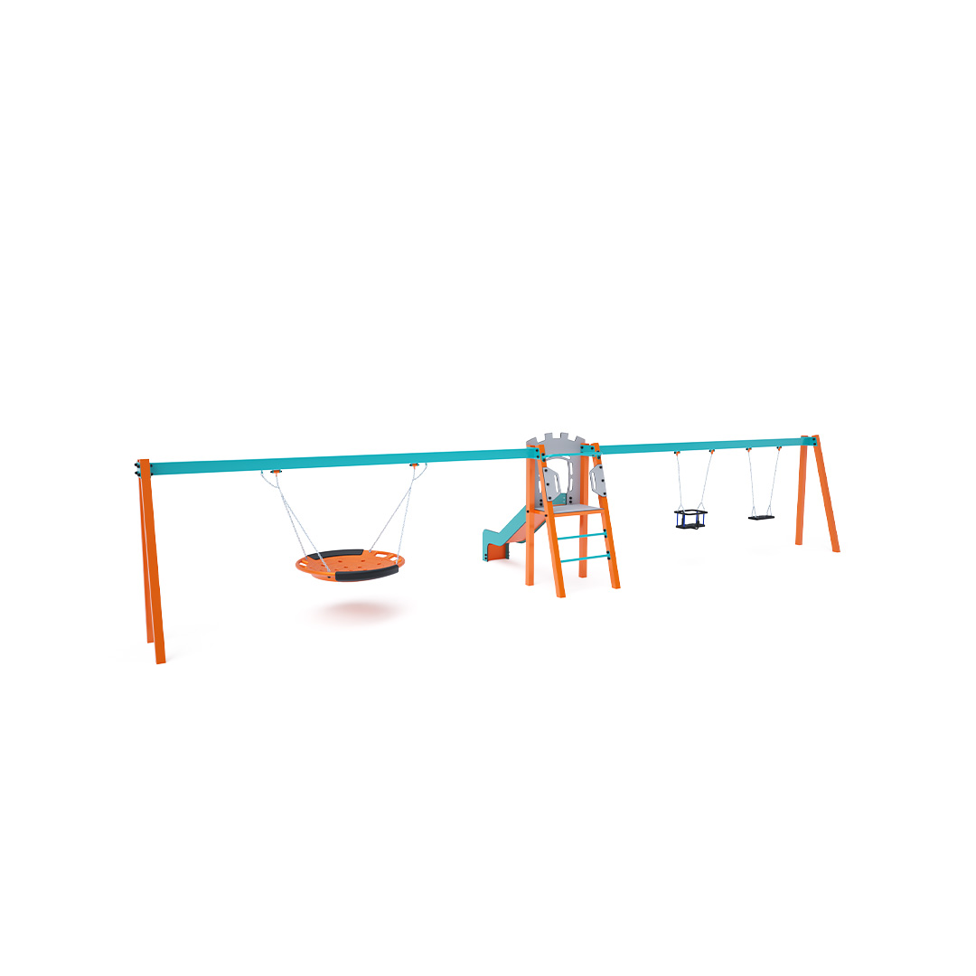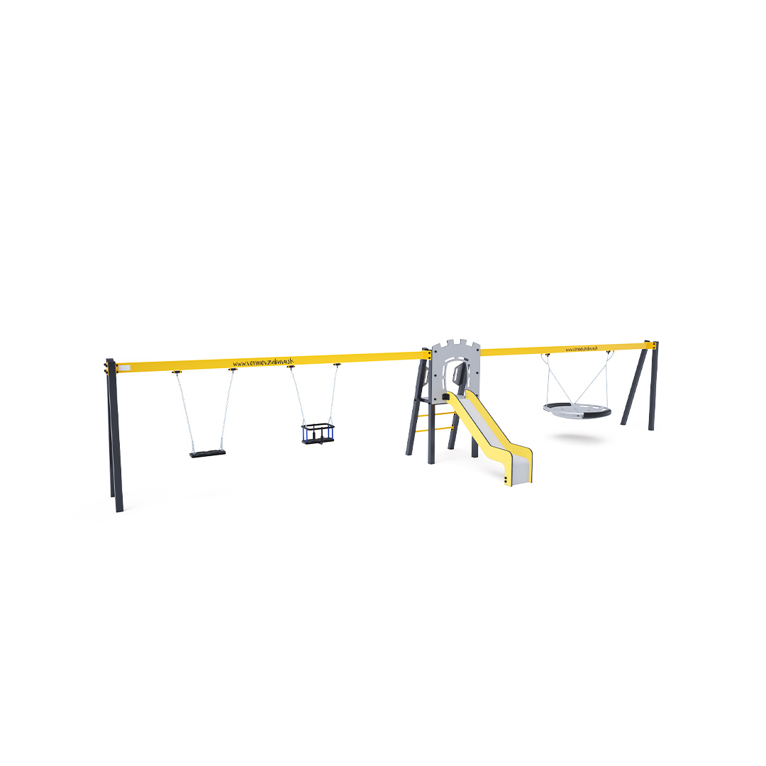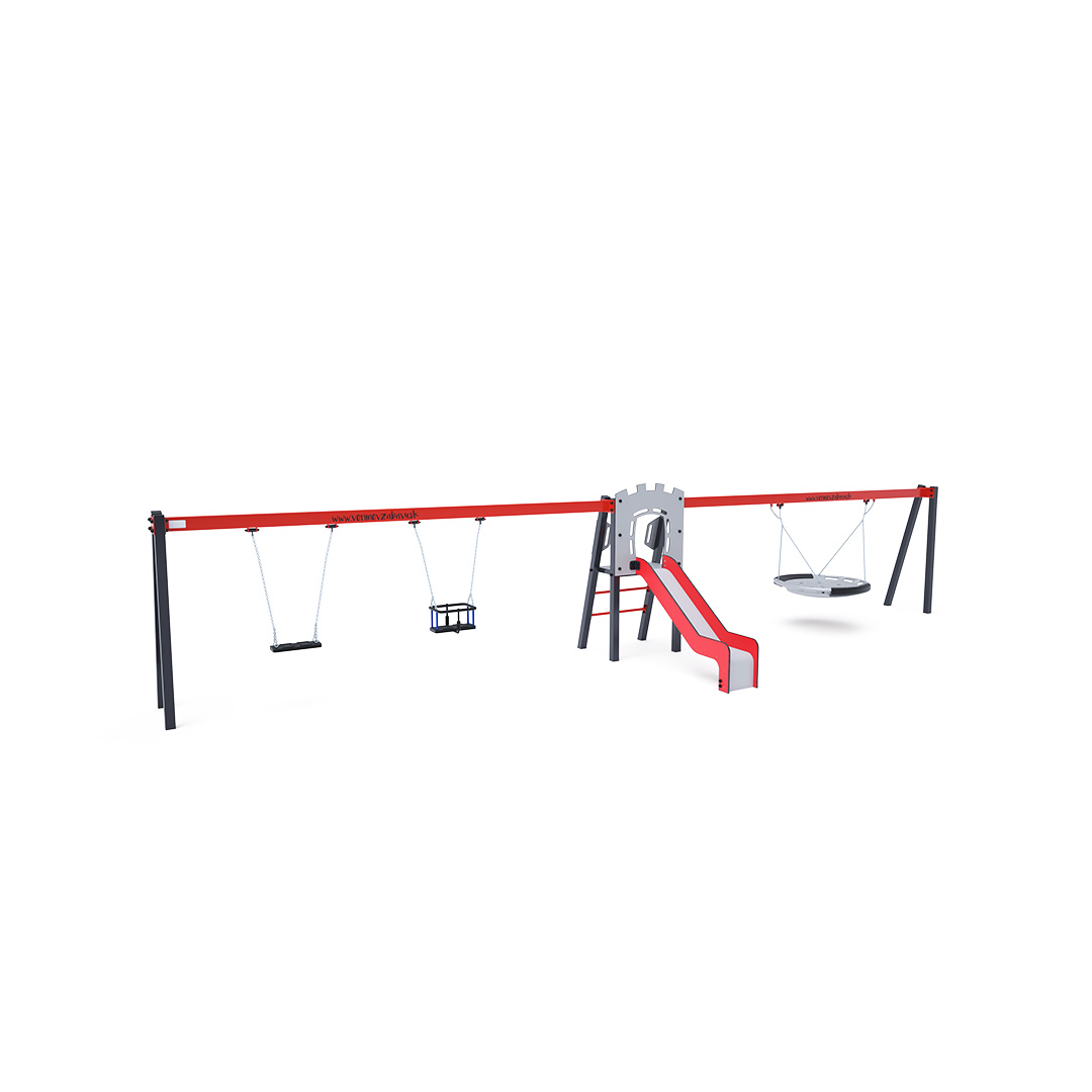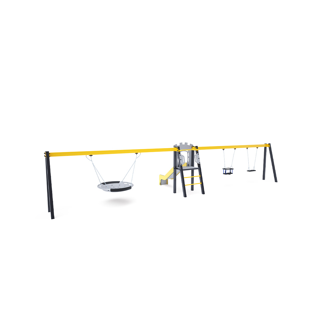 Certifikovaná bezúdržbová věž ve tvaru A s žebříkovým výlezem a skluzavkou, doplněná dvěma visícími houpadly. Na jedné straně je klasický a dětský sedák, na druhé straně houpací hnízdo. Dětský sedák pro dítě obsahuje ohrádku s příčkou mezi nohama dítěte, která zabraňuje sklouznutí nebo pádu dítěte. Zároveň se dítě může opřít. Houpací hnízdo je vhodné pro houpačku malých dětí vleže nebo pro více dětí najednou. Hnízdo má bezpečnostní závěs s pojistnou řetízkou.
