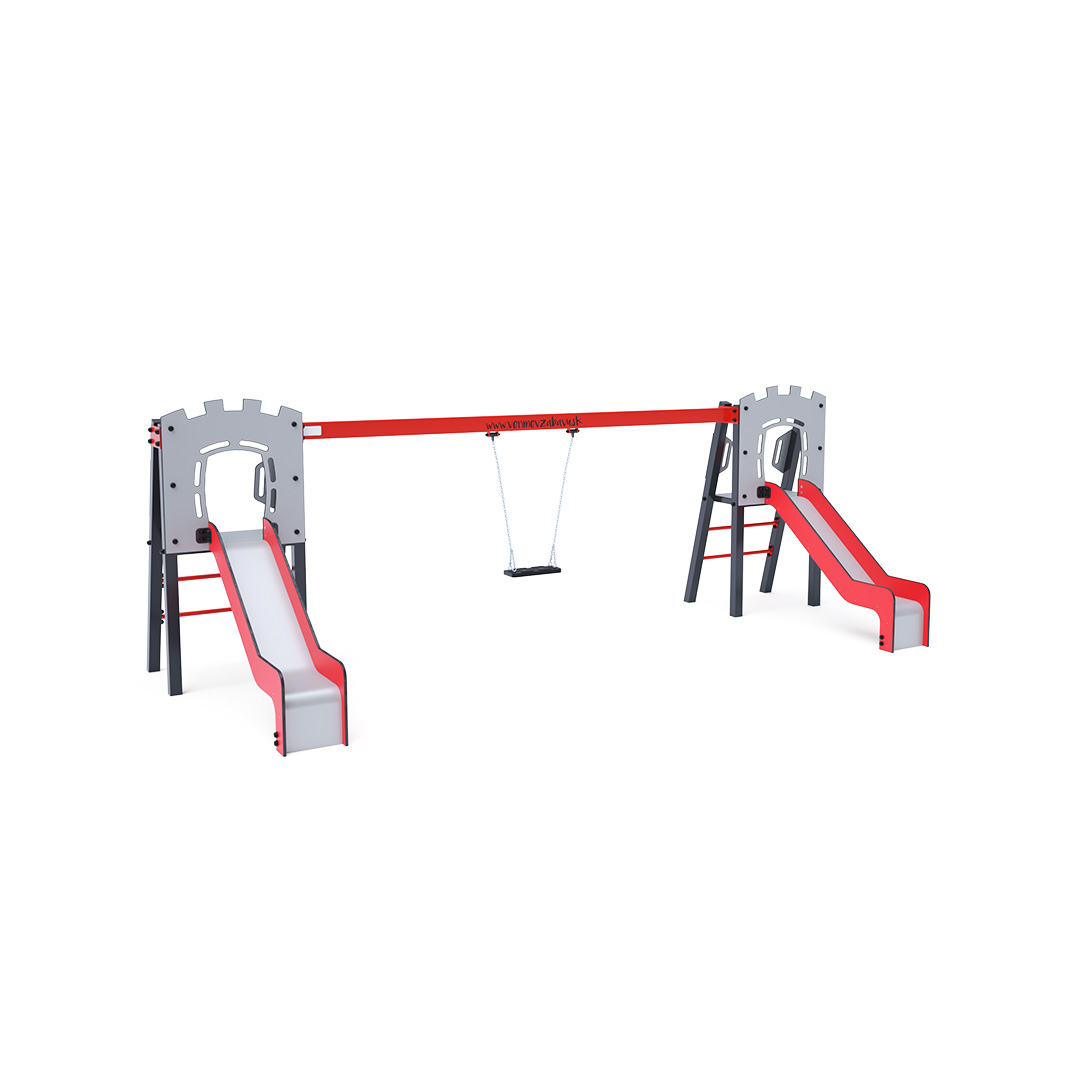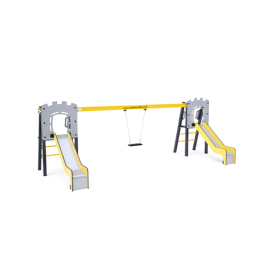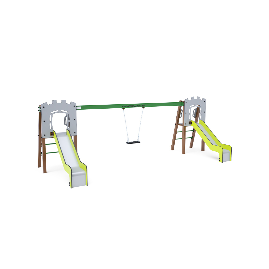 Dvě certifikované bezúdržbové věže ve tvaru A s žebříkem a skluzavkou, doplněné visícím houpadlem. Můžete si vybrat mezi klasickým sedákem nebo dětským sedákem. Dětský sedák obsahuje zábranu s příčkou mezi nohama dítěte, která zabraňuje sklouznutí nebo pádu. Umožňuje také dítěti se pohodlně opřít.