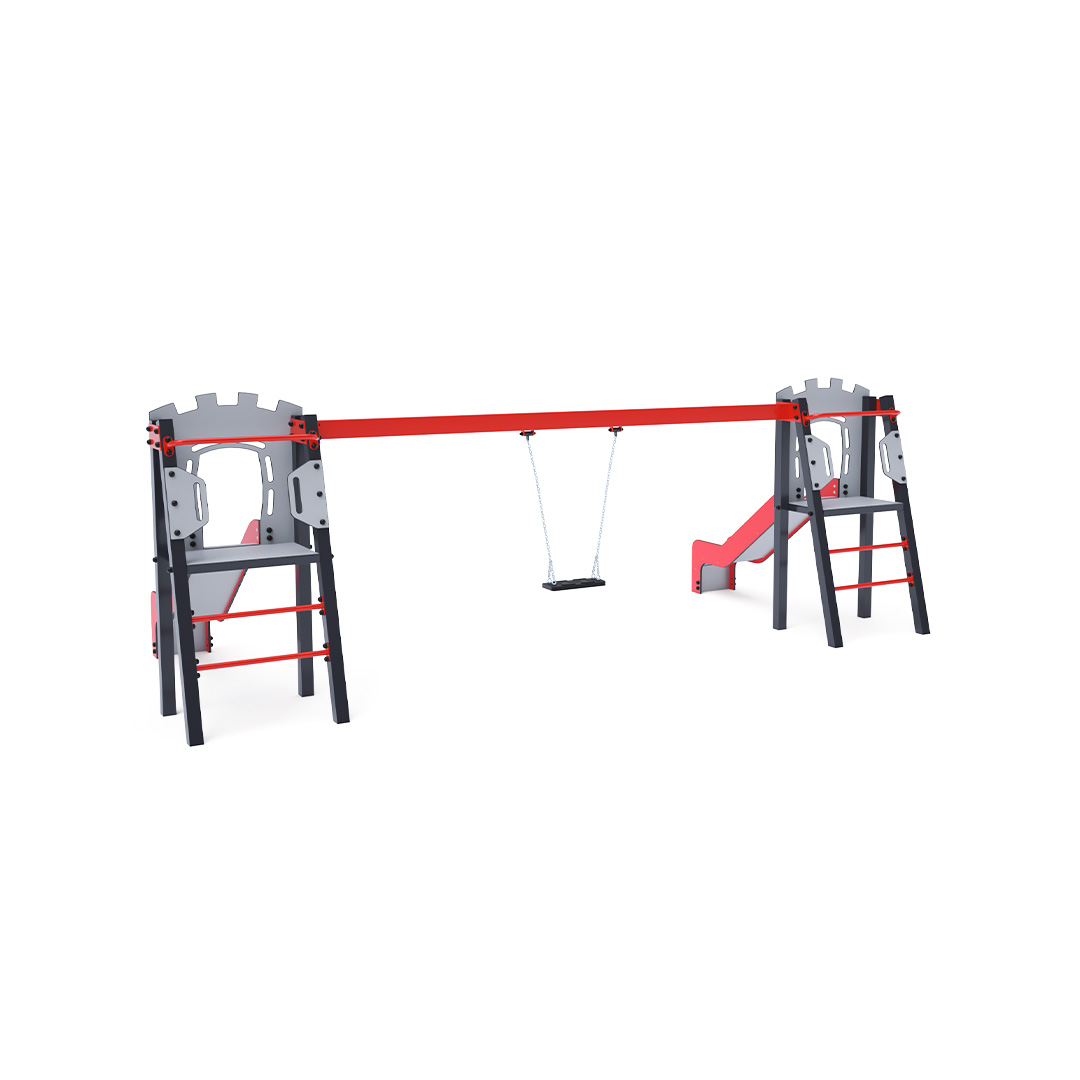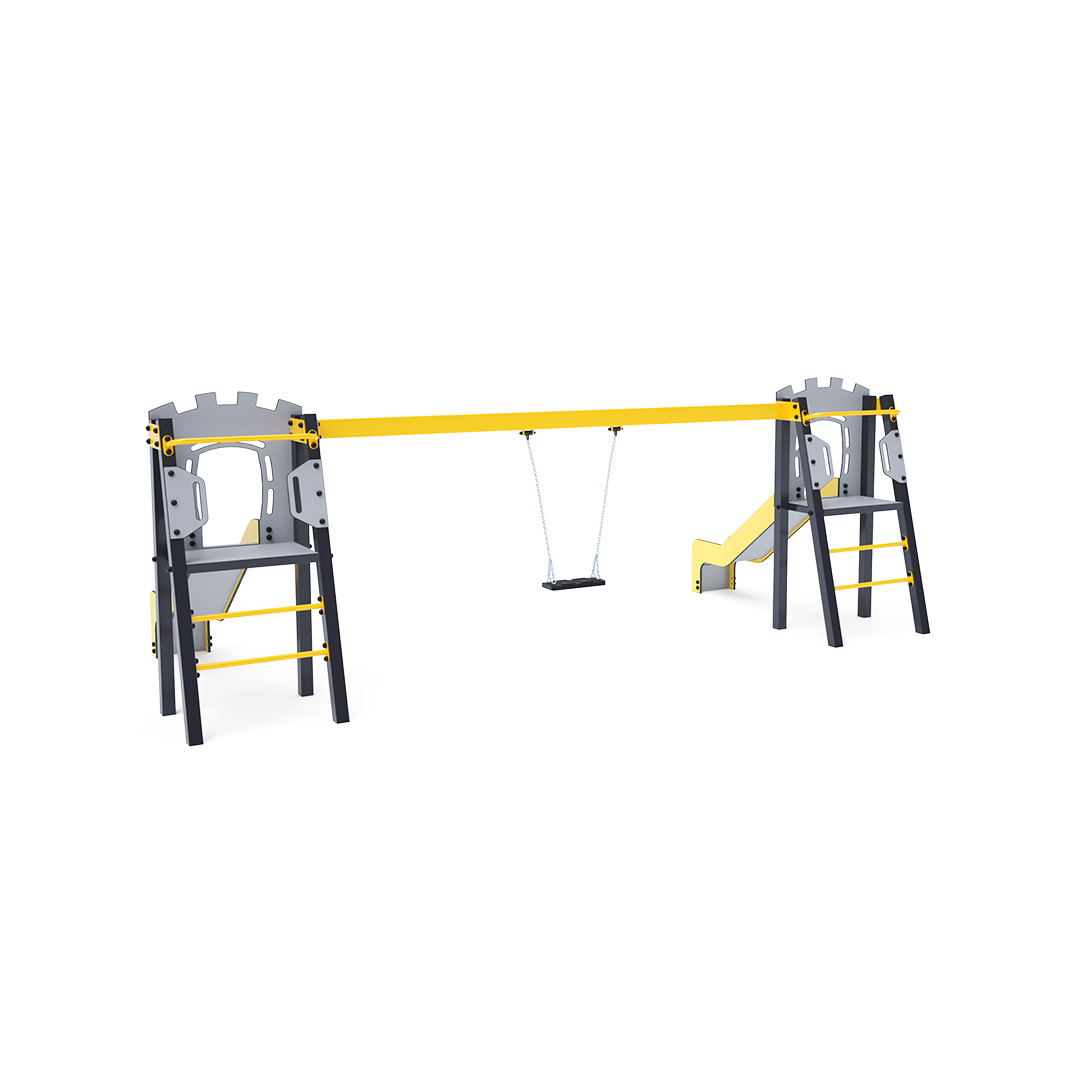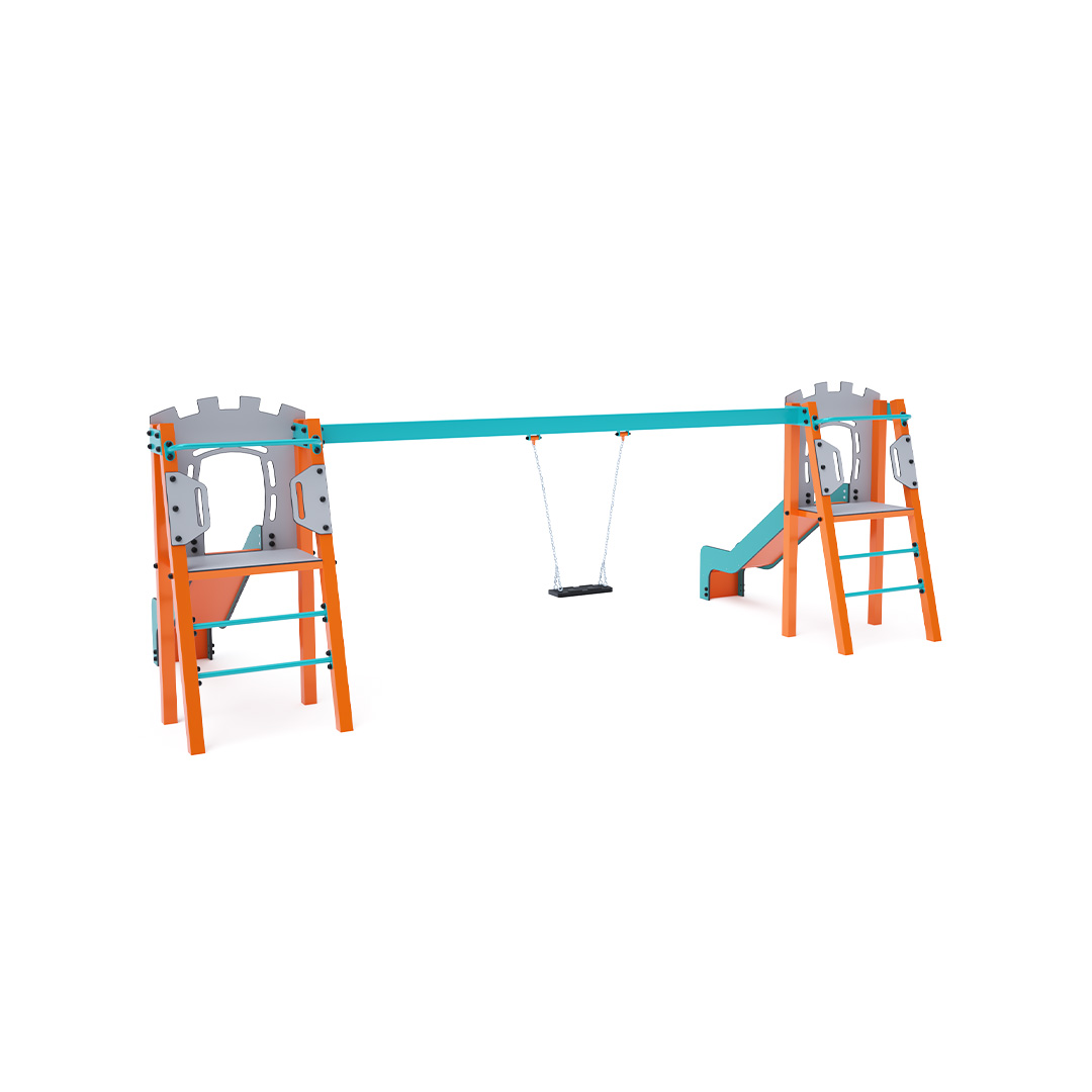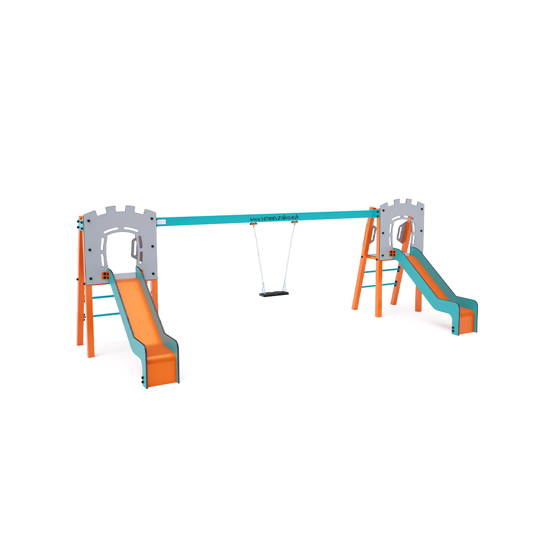 Dvě certifikované bezúdržbové věže ve tvaru A s žebříkem a skluzavkou, doplněné visícím houpadlem. Můžete si vybrat mezi klasickým sedákem nebo dětským sedákem. Dětský sedák obsahuje zábranu s příčkou mezi nohama dítěte, která zabraňuje sklouznutí nebo pádu. Umožňuje také dítěti se pohodlně opřít.