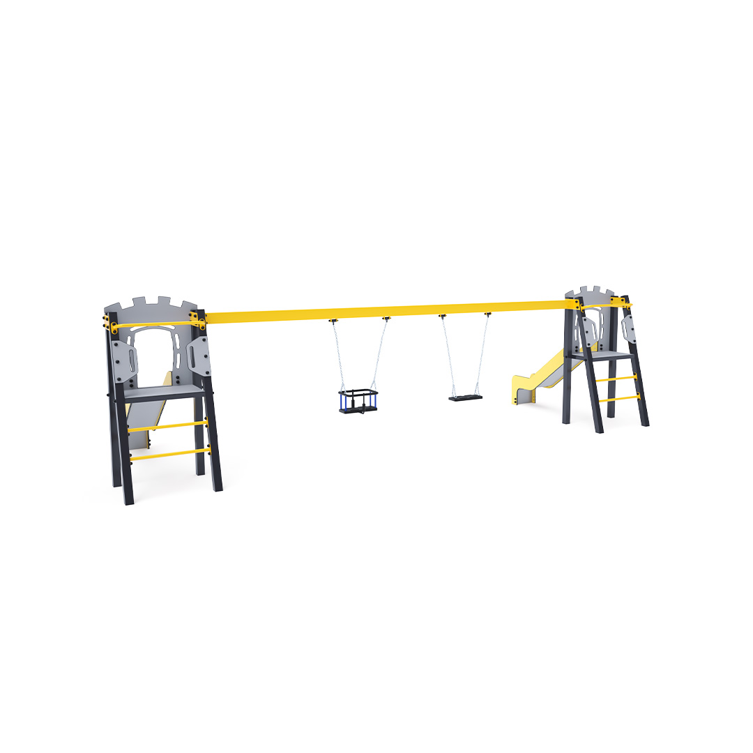 Dvě certifikované bezúdržbové věže ve tvaru A s žebříkovým výlezem a skluzavkou, doplněné visícím houpadlem. Můžete si vybrat mezi klasickým nebo dětským sedákem. Dětský sedák pro dítě obsahuje ohrádku s příčkou mezi nohama dítěte, která zabraňuje sklouznutí nebo pádu dítěte. Zároveň se dítě může opřít.