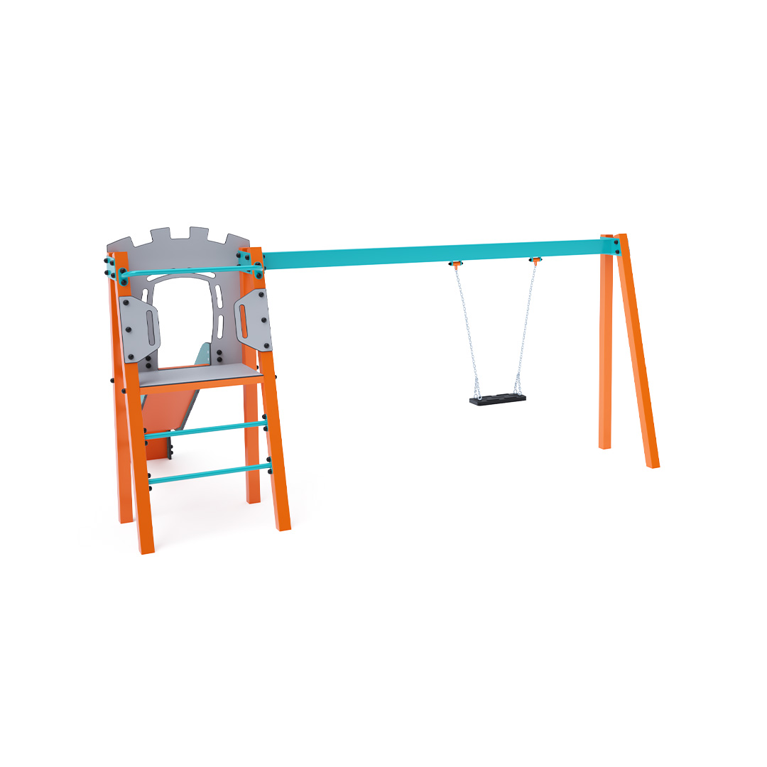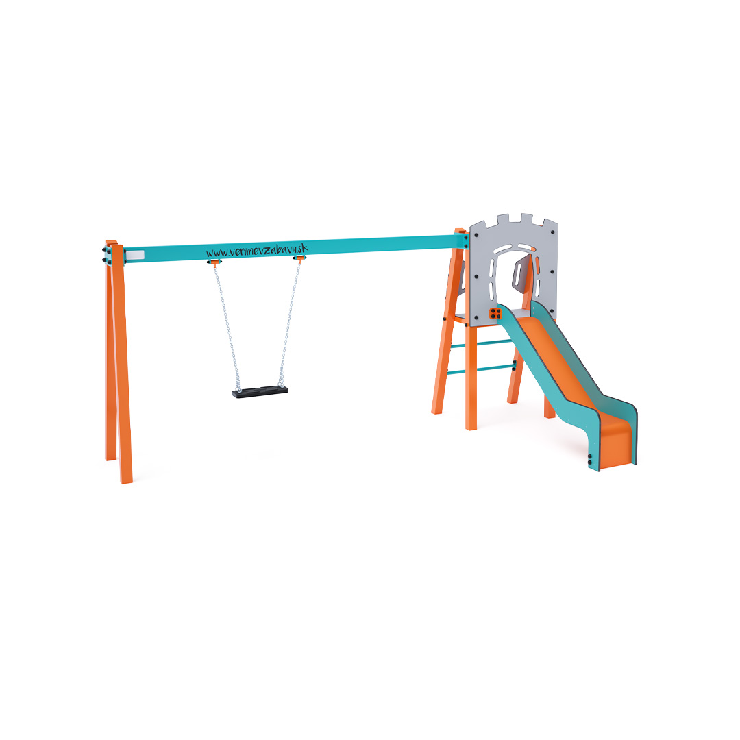 Certifikovaná bezúdržbová věž ve tvaru A s žebříkovým výlezem a skluzavkou, doplněná visícím houpadlem s klasickým sedákem. Tyrkysovo-oranžový design už z dálky láká k hře.