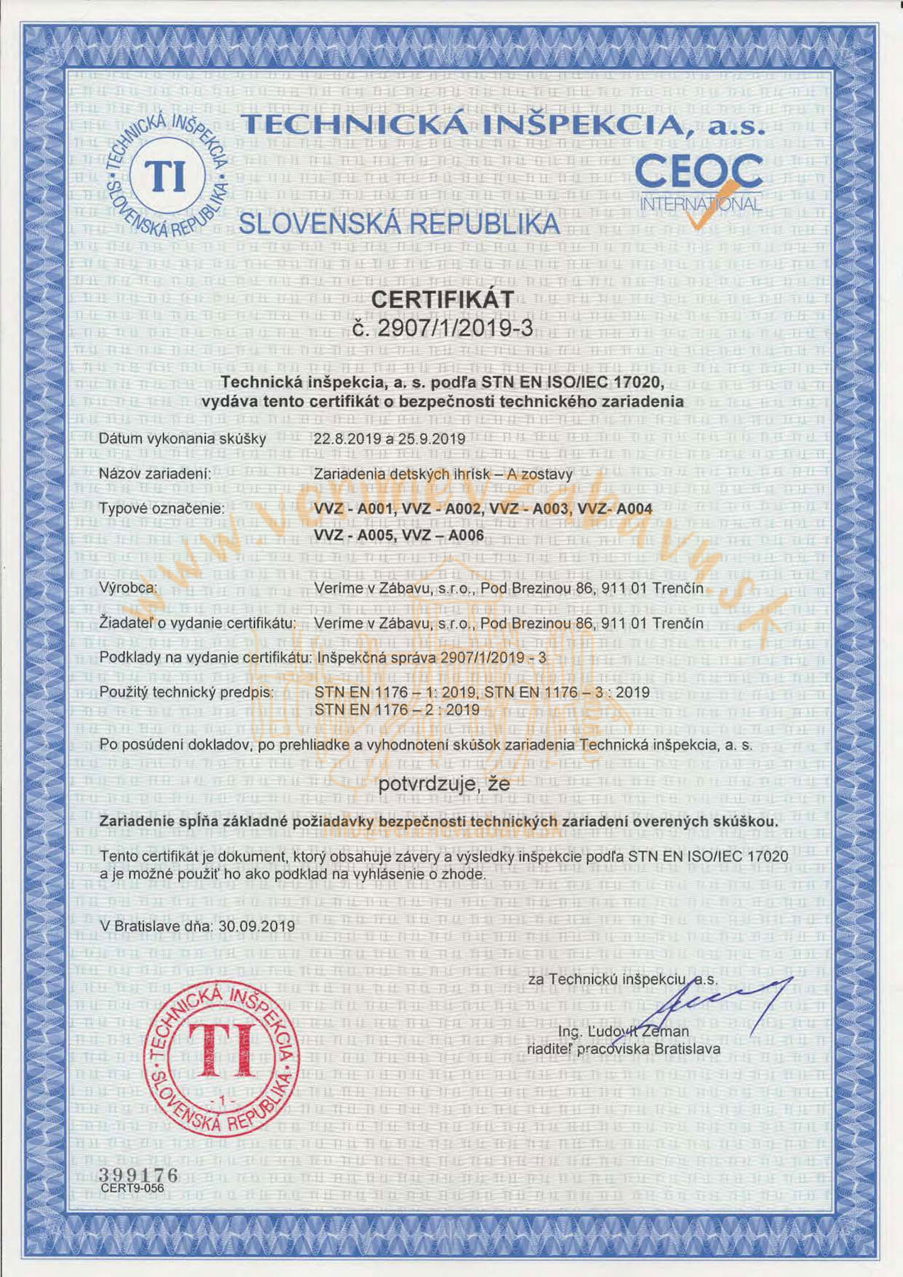 Skluzavka VVZ-A002 je certifikována podle normy STN EN 1176.