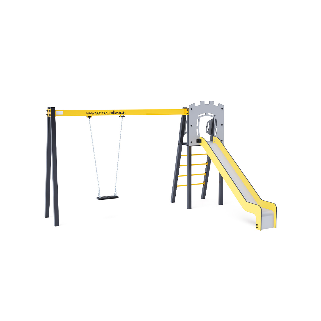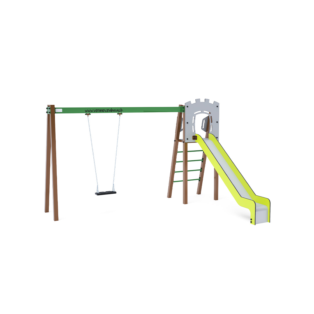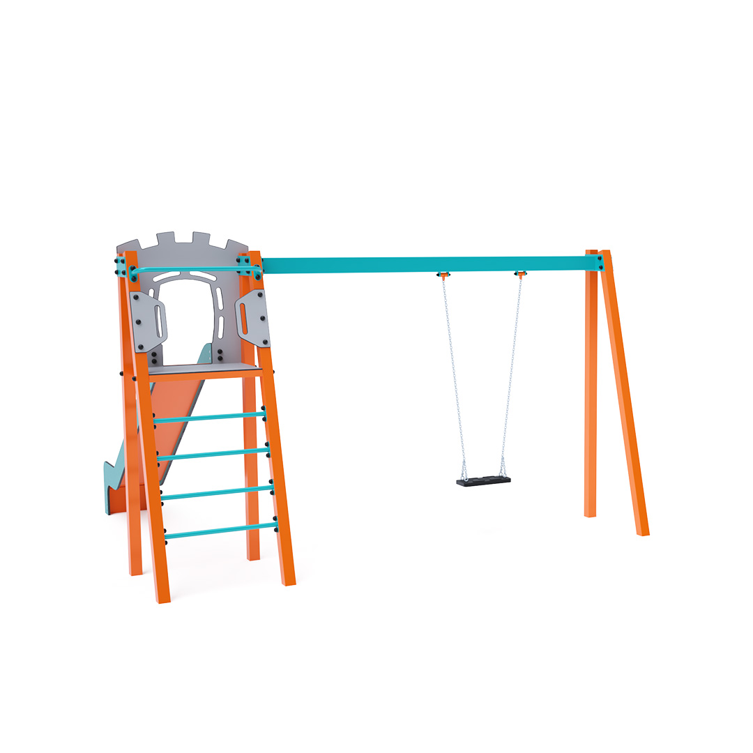 Certifikovaná bezúdržbová věž ve tvaru A s žebříkovým výlezem a skluzavkou, doplněná visící houpačkou s klasickým sedákem. Tyrkysovo-oranžový design již z dálky láká k hře.