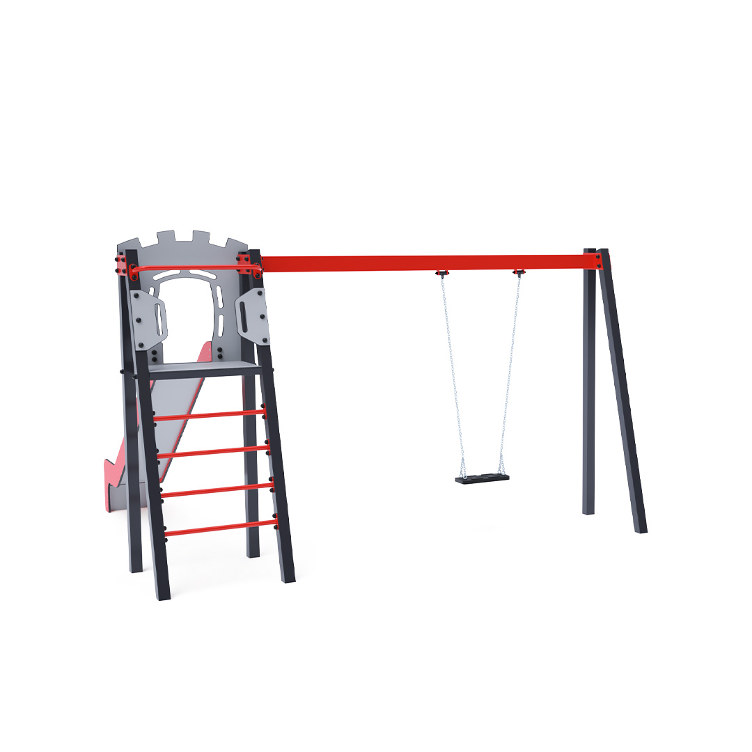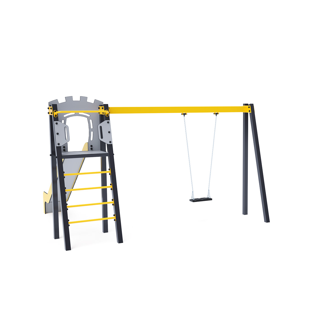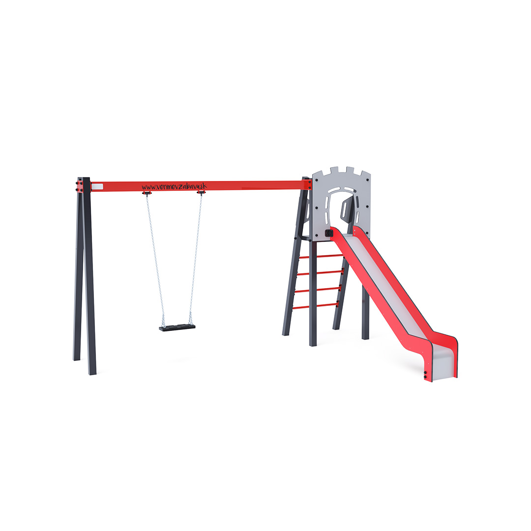 Certifikovaná bezúdržbová věž ve tvaru A s žebříkovým výlezem a skluzavkou, doplněná visící houpačkou s klasickým sedákem. Tyrkysovo-oranžový design již z dálky láká k hře.