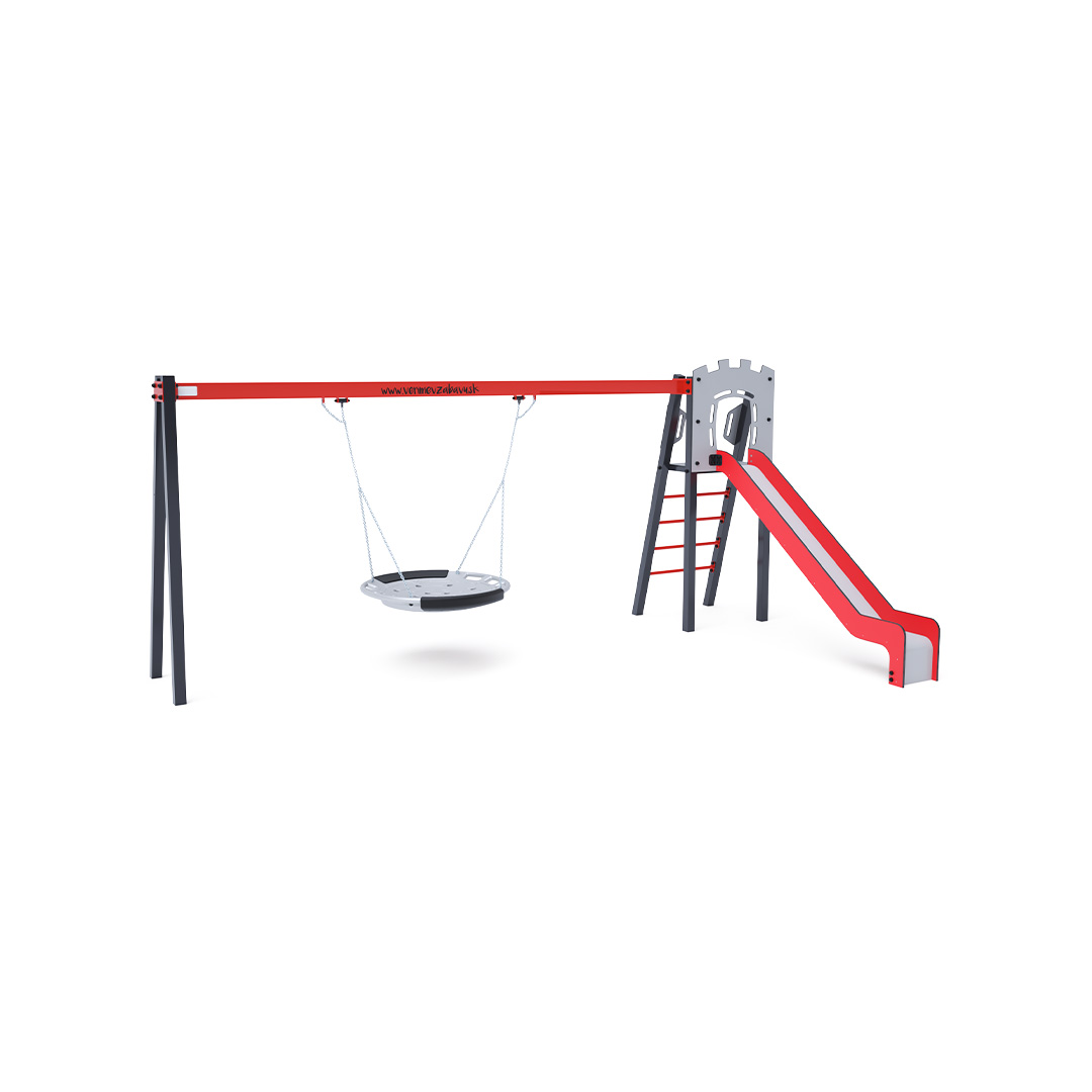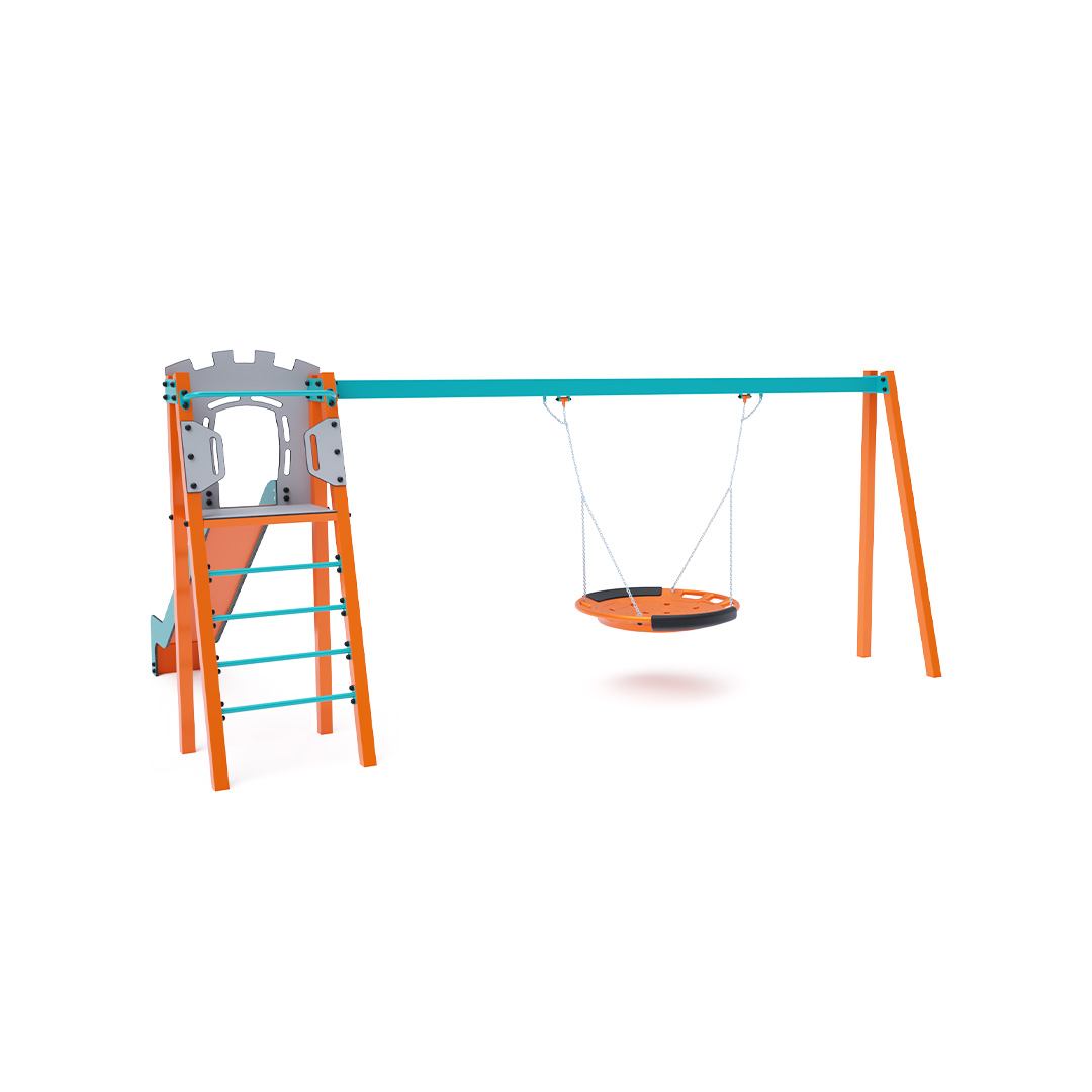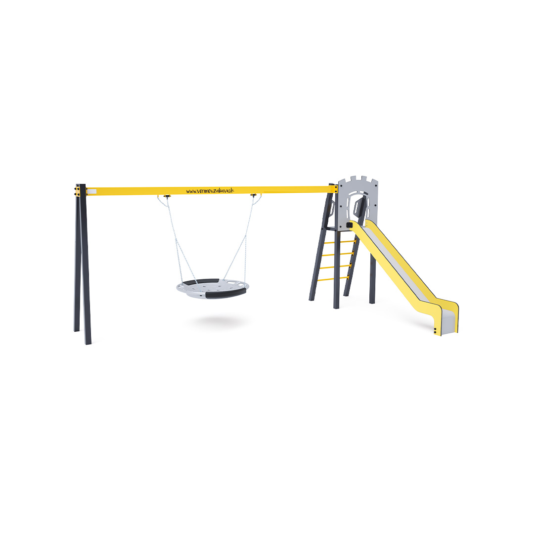 Certifikovaná bezúdržbová věž ve tvaru A s žebříkovým výlezem a skluzavkou, doplněná visící houpačkou s hnízdem. Houpačkové hnízdo je vhodné pro houpačku malých dětí v leže nebo pro více dětí najednou. Hnízdo má bezpečnostní závěs s pojistným řetízkem.